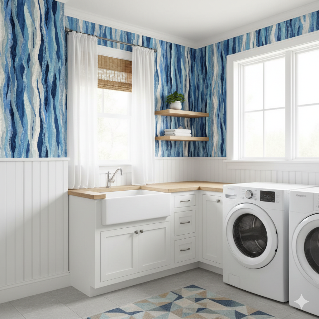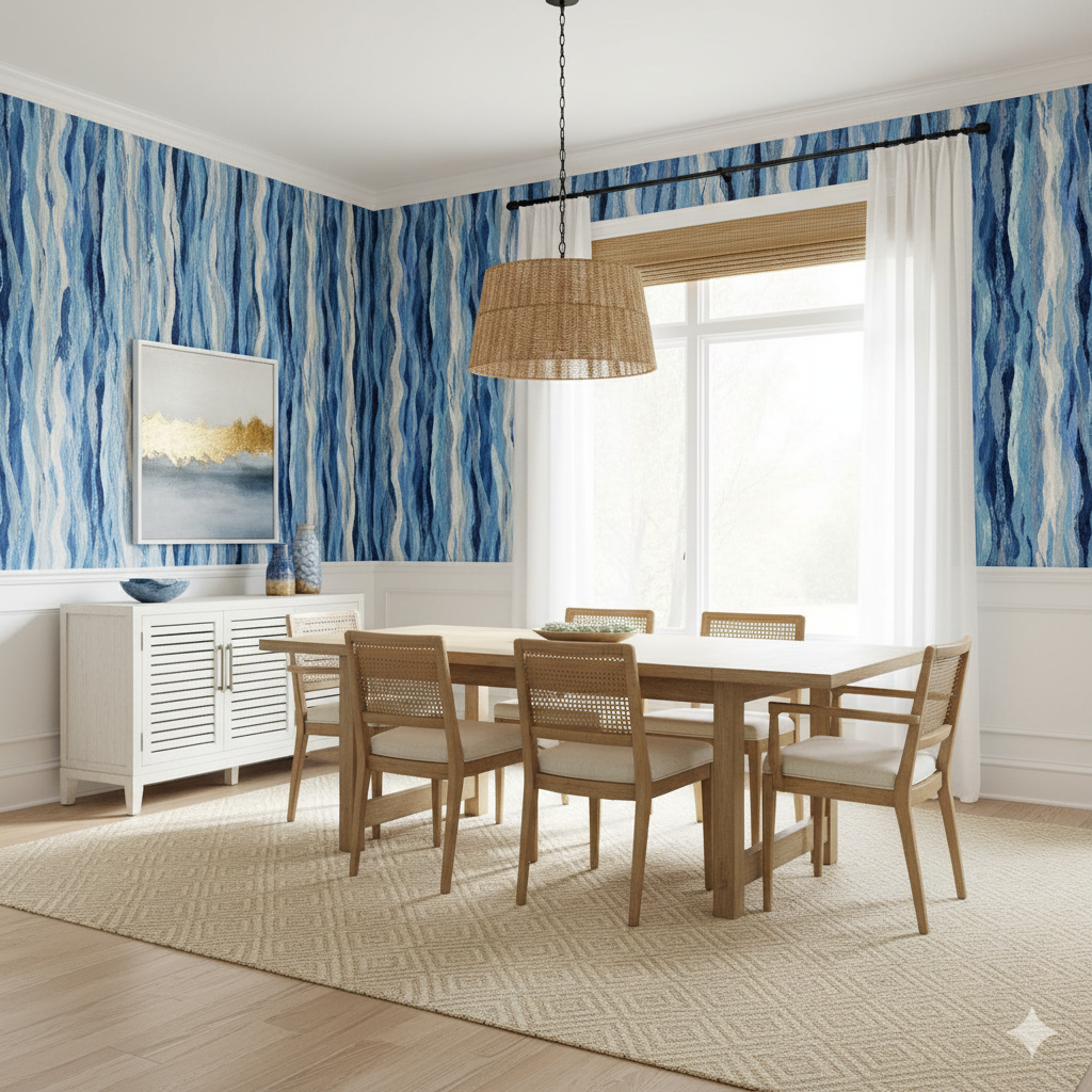 Fluid and expressive, Adriatic Flow captures the hypnotic movement of water through layered, hand-painted strokes in marine blue, slate, and pearl gray. The vertical rhythm mimics rippling currents and ocean light, evoking both calm and motion. Ideal for bathrooms, spas, or contemporary coastal homes, it transforms walls into living surfaces of reflection. When styled with white tile, rattan, or brushed nickel, it feels ethereal; with darker woods, it becomes moody and modern. Adriatic Flow is where serenity meets depth — a meditation on color and continuity.