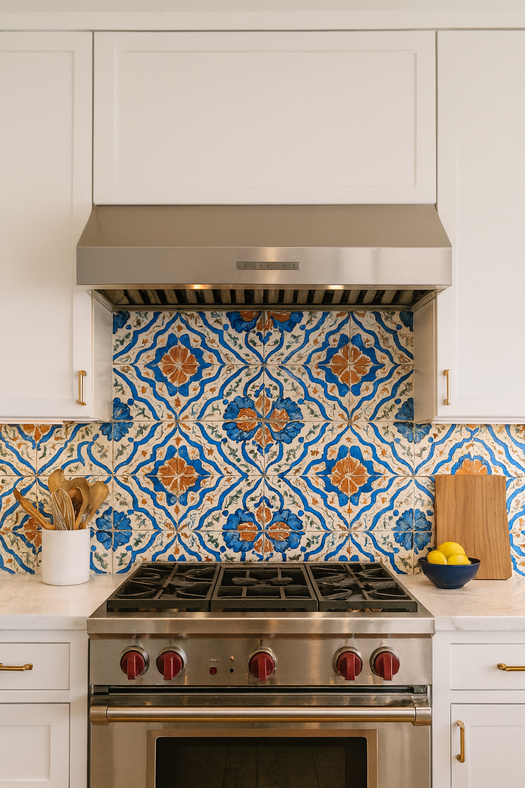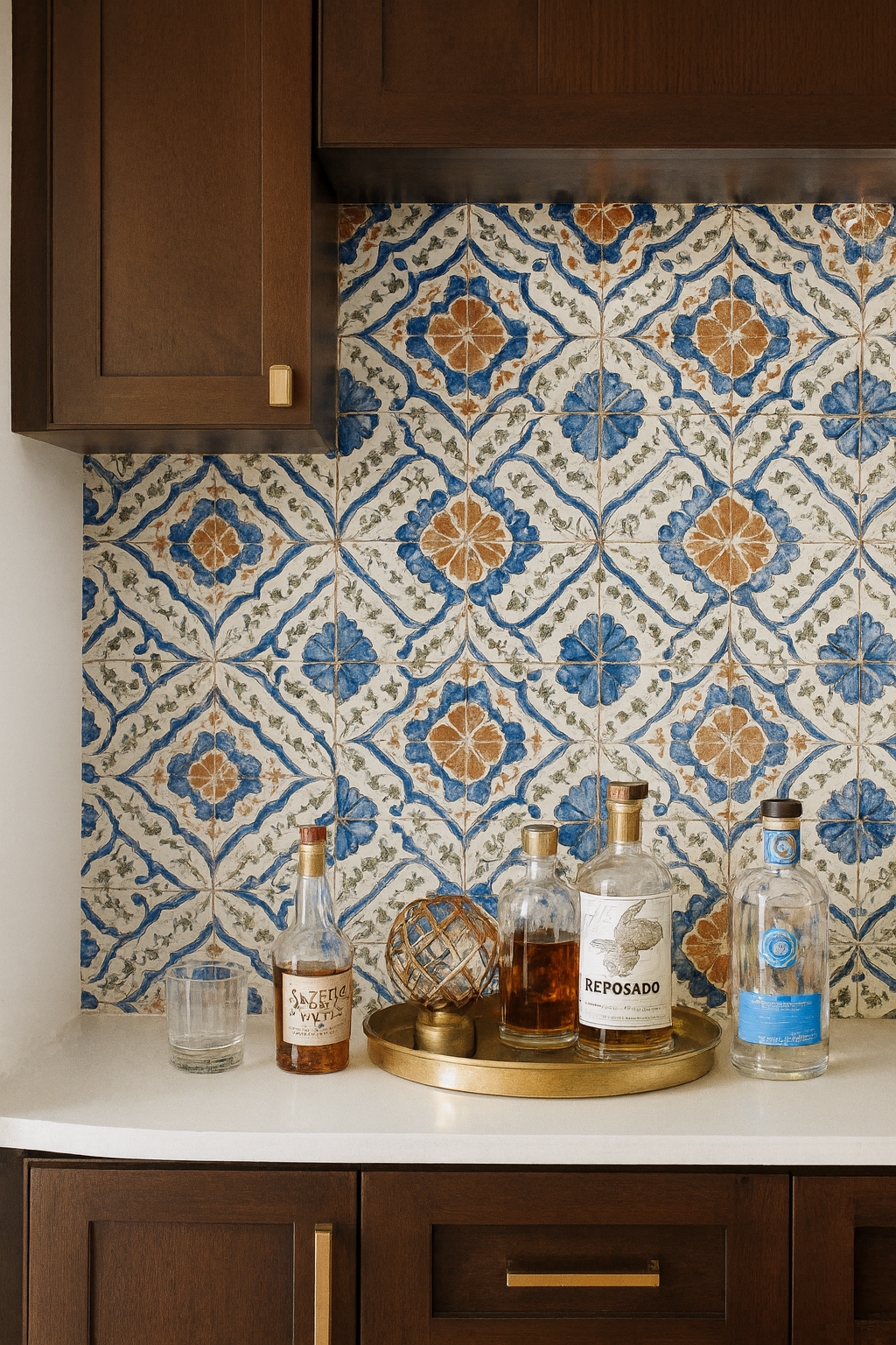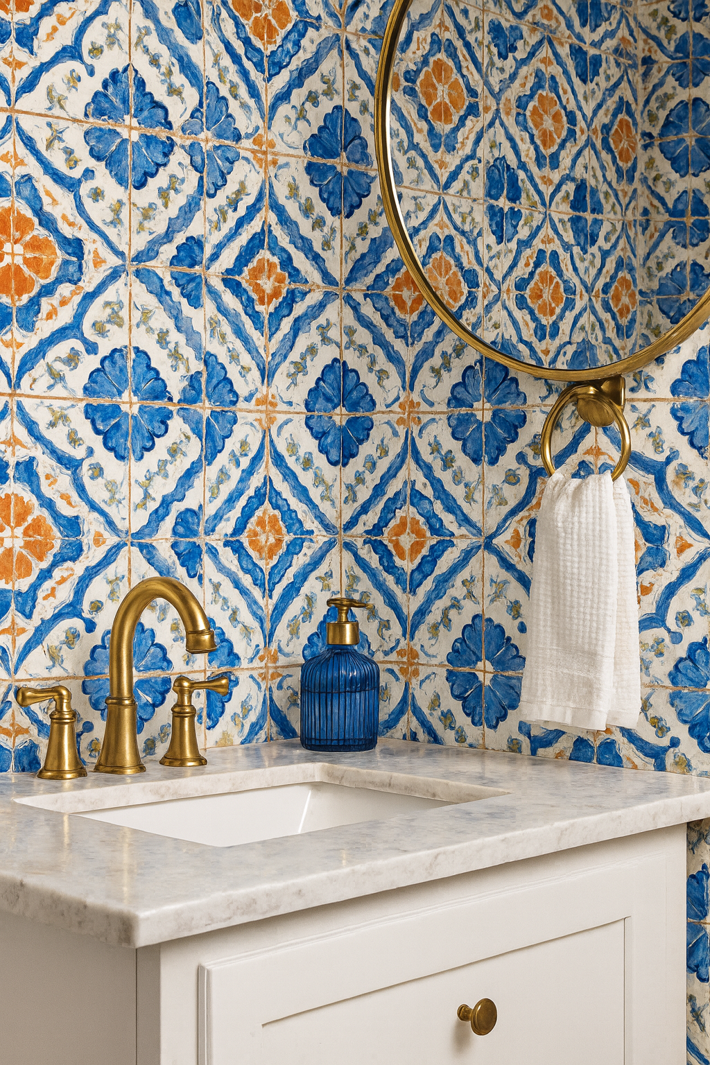 Channeling hand-painted Spanish tilework, Alhambra Echo is a rich mosaic of blue, terracotta, and olive floral medallions and scrolling lines. Set on an aged ivory base, it brings Mediterranean charm to kitchens, sun-drenched patios, or eclectic entryways with its classic yet artisanal vibe.