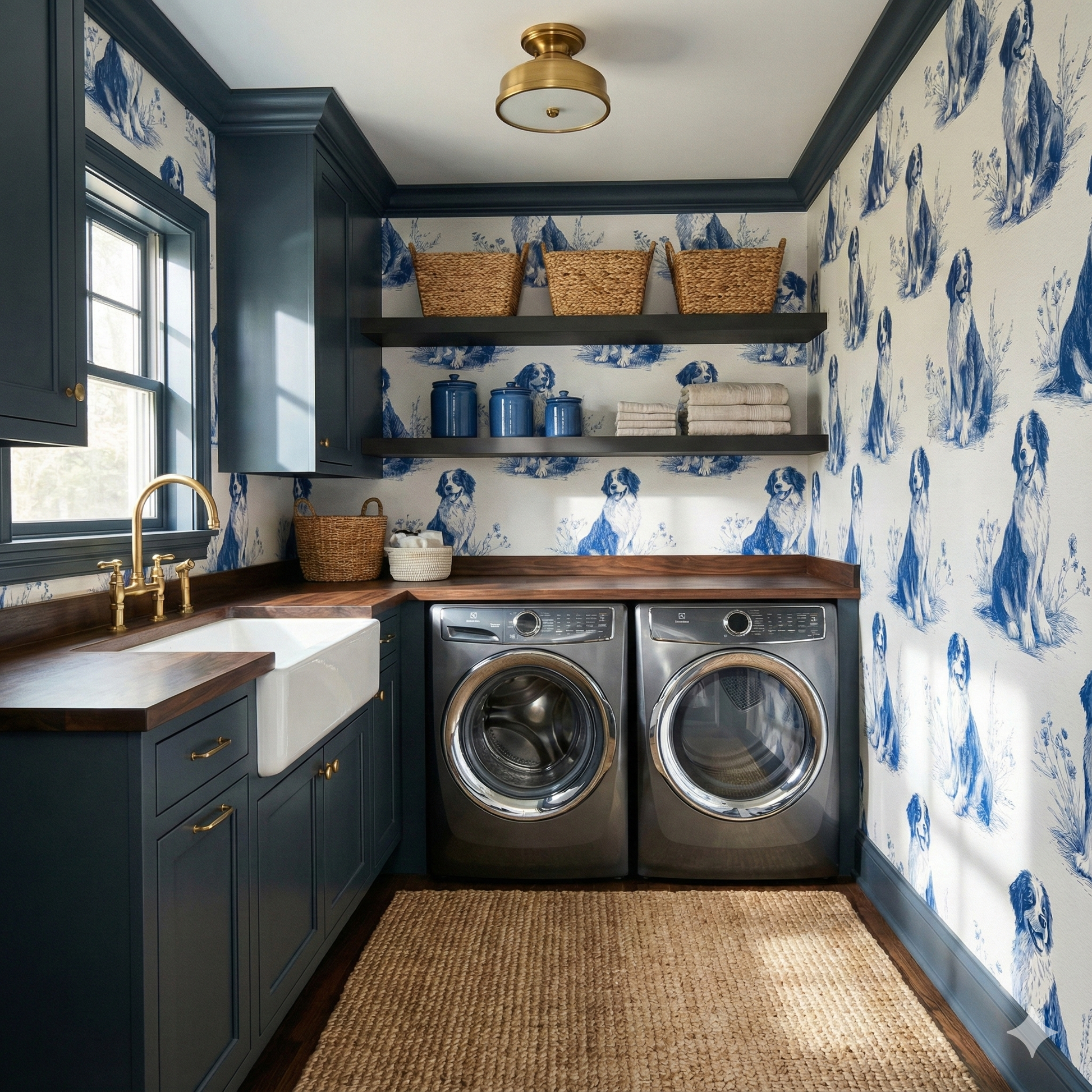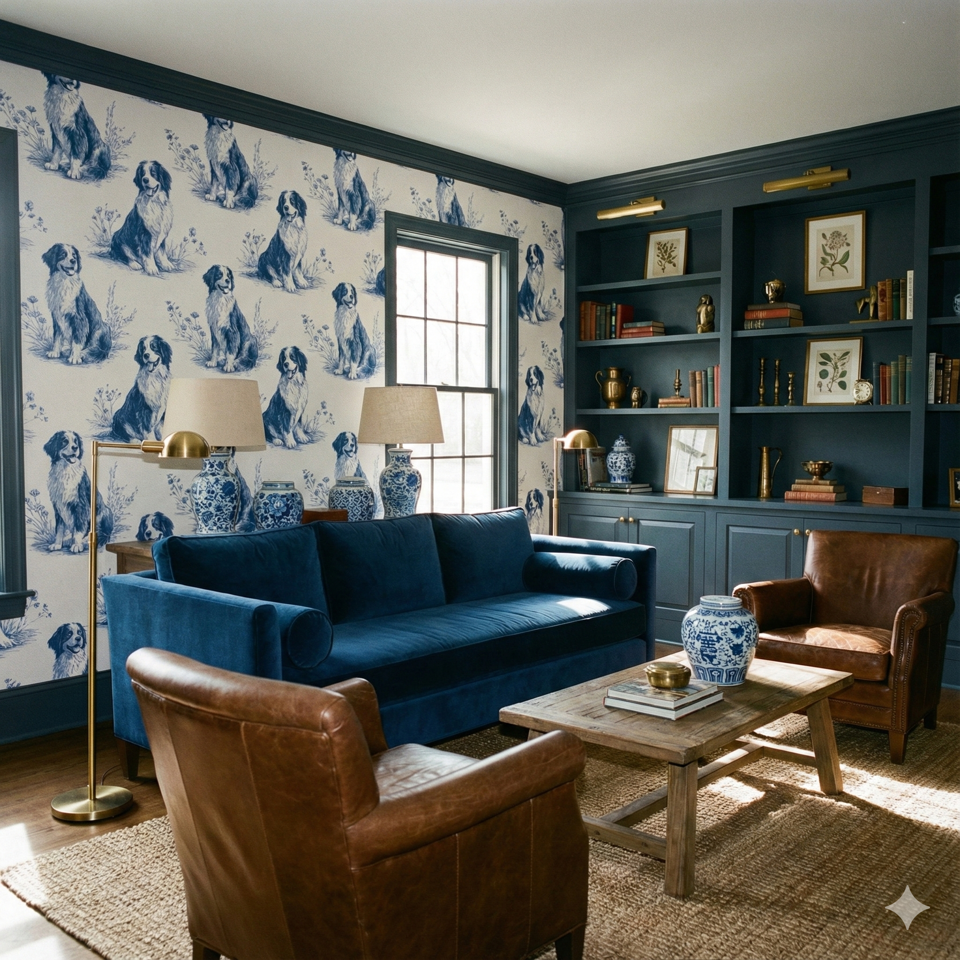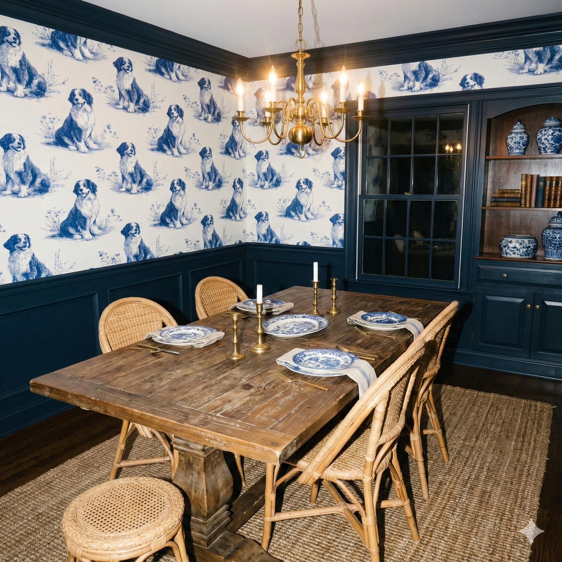 This wallpaper radiates warmth thanks to its depiction of Bernese Mountain Dogs sketched in a charming cobalt ink, each one fluffy, content, and surrounded by delicate meadow flowers. The textured off-white background mimics handmade paper, adding to the artisan quality of the linework. The dogs are posed in a variety of natural positions — sitting, resting, tail wrapped, tongue out — giving the repeat a storytelling quality that feels wholesome and comforting. Perfect for family-friendly spaces, pet-loving homes, mountain cabins, or entryways where you want something soft and inviting. There’s a natural nostalgia in this artwork, reminiscent of European countryside illustrations, making it easy to pair with natural woods, warm textiles, or rustic-modern décor.
