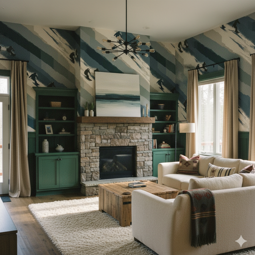 Dynamic and contemporary, Alpine Descent captures the motion and exhilaration of snow carving down sunlit slopes. Monochrome silhouettes of snowboarders cut across angled bands of cream, steel blue, and slate green, creating a cinematic sense of speed and freedom. This pattern is ideal for ski chalets, mountain lodges, or modern adventure homes—it radiates energy, contrast, and crisp winter air. Alpine Descent turns a wall into motion: bold, graphic, and alive with momentum.
