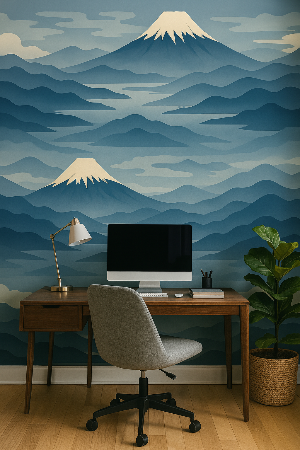 Soft, serene, and sculpted by stillness, Alpine Drift layers rolling mountain ridges in tonal blues, greys, and winter whites, each peak crowned with a dusting of snow. The pattern feels like breathing cold air in a quiet forest or watching morning mist rise over distant hills. Ideal for Scandinavian-inspired bedrooms, Japandi-style reading corners, or spa-like entryways, it adds movement without chaos and depth without weight. Style with raw wood, cream knits, and diffused light for a space that whispers peace.