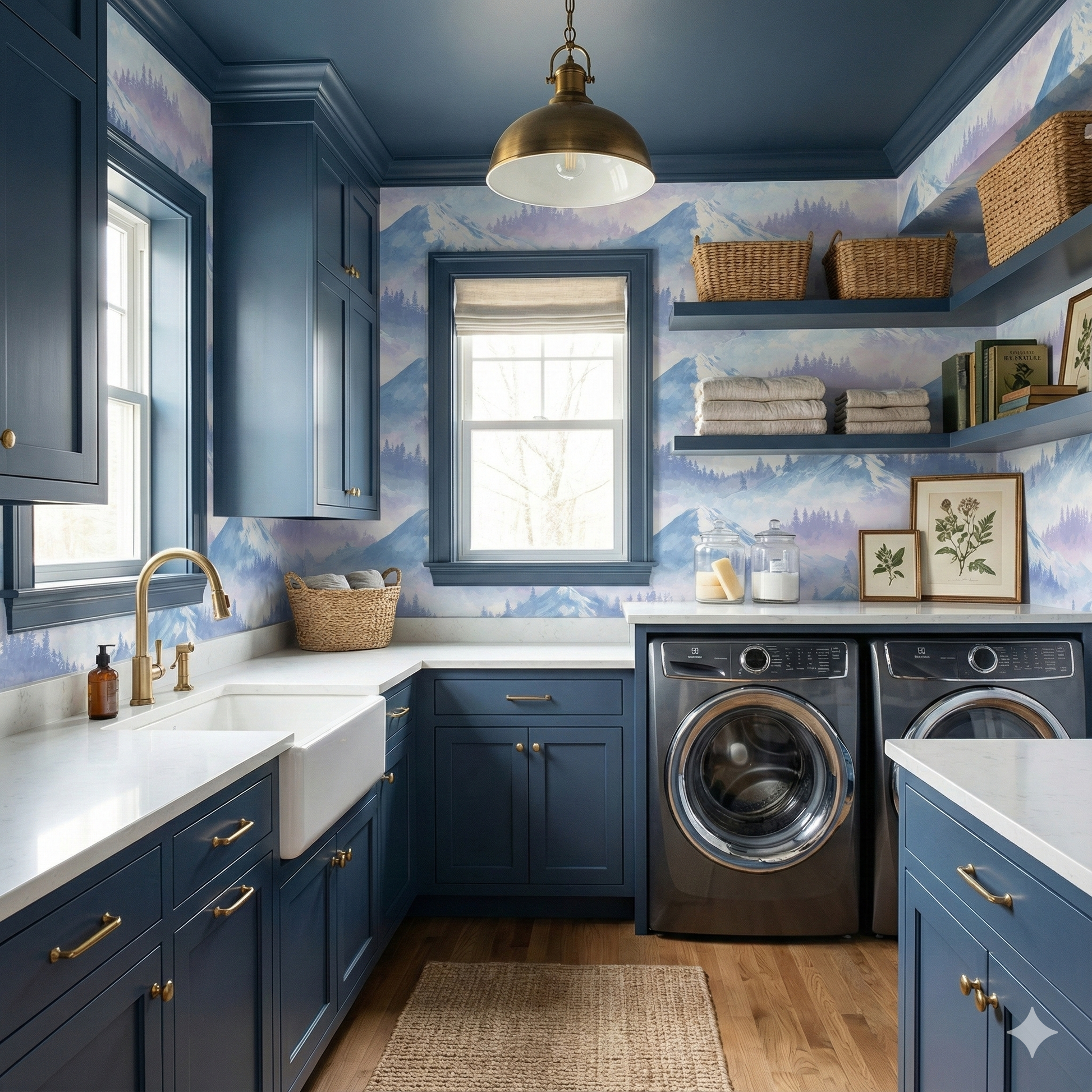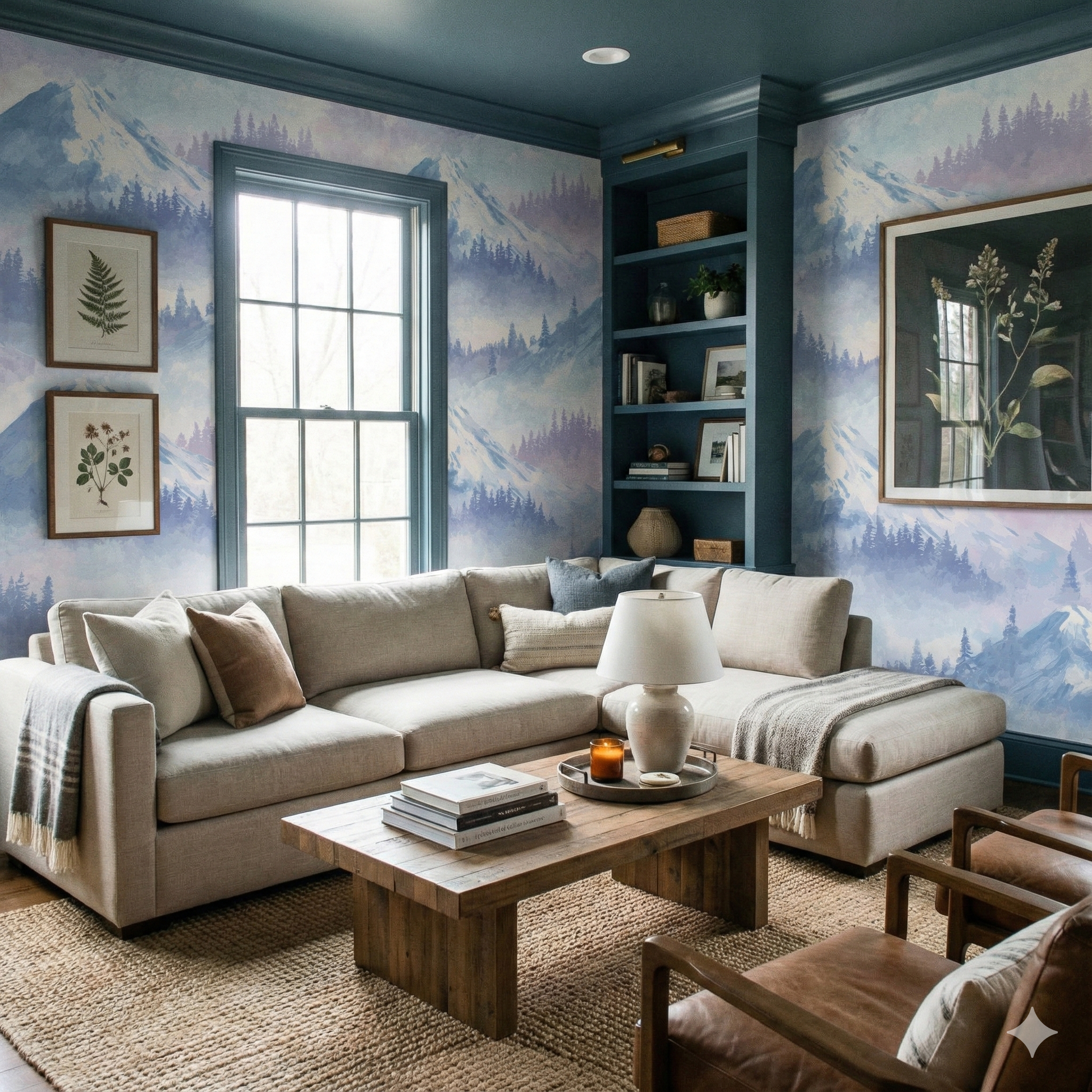 A serene mountain landscape painted in atmospheric layers of icy blue, lavender haze, soft periwinkle, and snow-white peaks. The mist drifting between the ridges creates incredible depth, giving the pattern a dreamy, cinematic presence. Evergreen silhouettes soften the transitions between colors, capturing the hush of winter mornings and alpine dawns. This wallpaper is perfect for bedrooms, wellness spaces, boutique hotels, ski cabins, reading nooks, or any environment meant to evoke calm, escape, and clean mountain air. It’s immersive without being heavy — a tranquil, expansive vista that feels both modern and timeless.