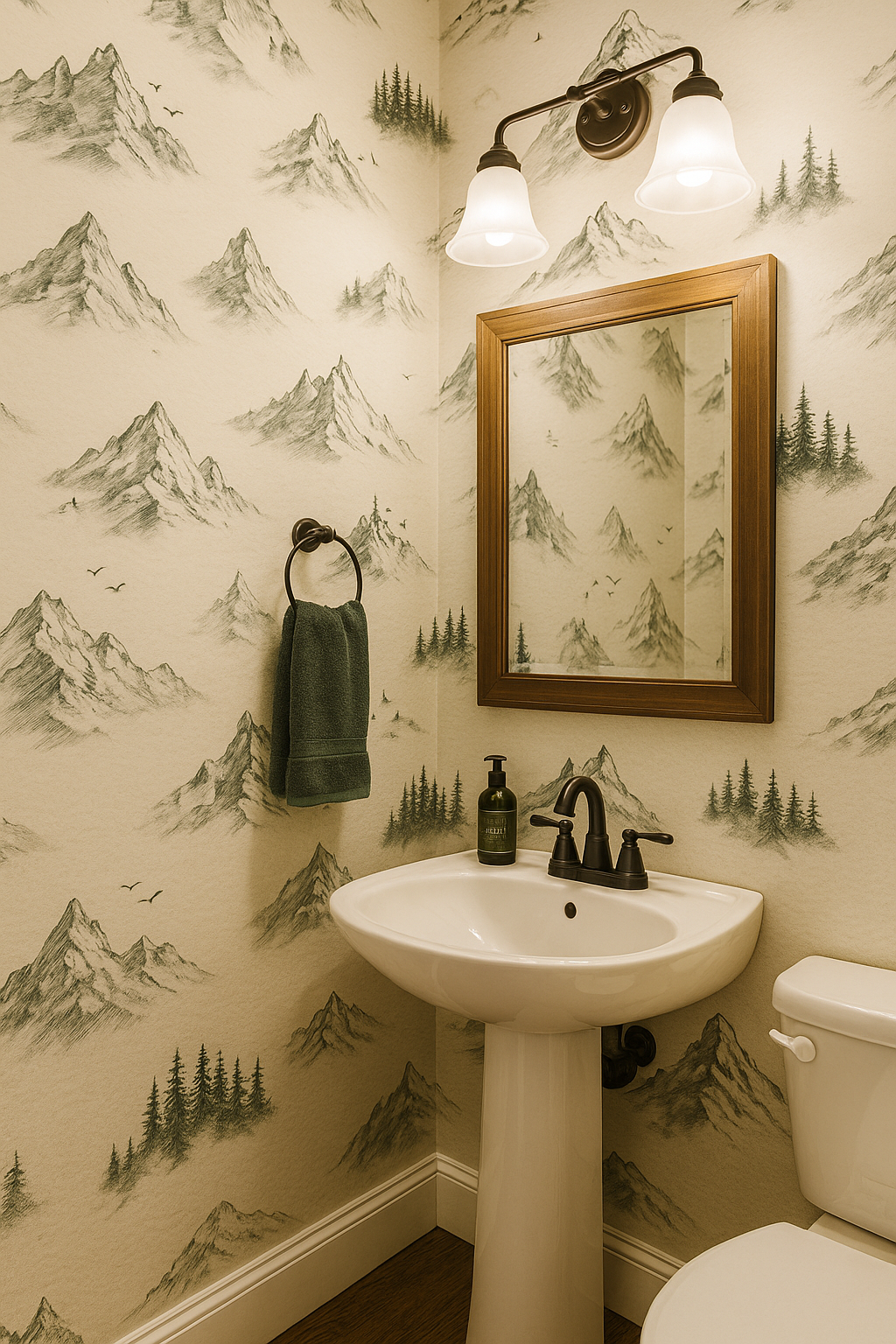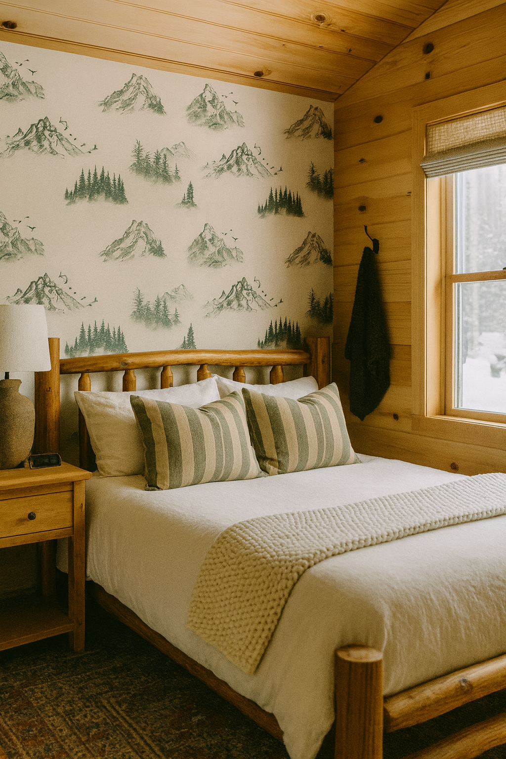 Hand-drawn mountain ranges with towering pine trees evoke the serenity of alpine landscapes. This neutral yet detailed wallpaper works well in offices, mudrooms, or any space channeling a minimalist cabin vibe. Ideal for those searching for mountain landscape wallpaper or sketched outdoorsy designs.