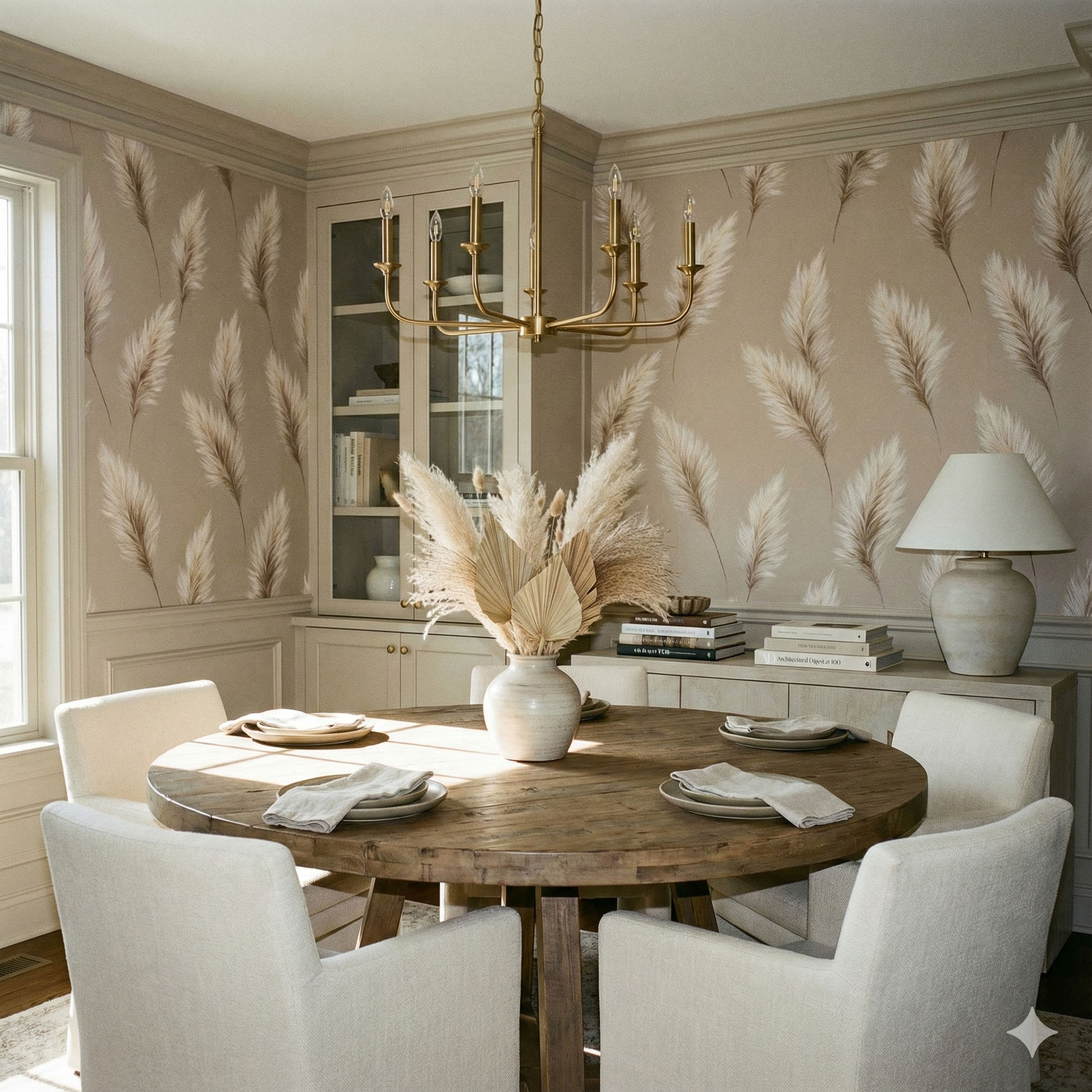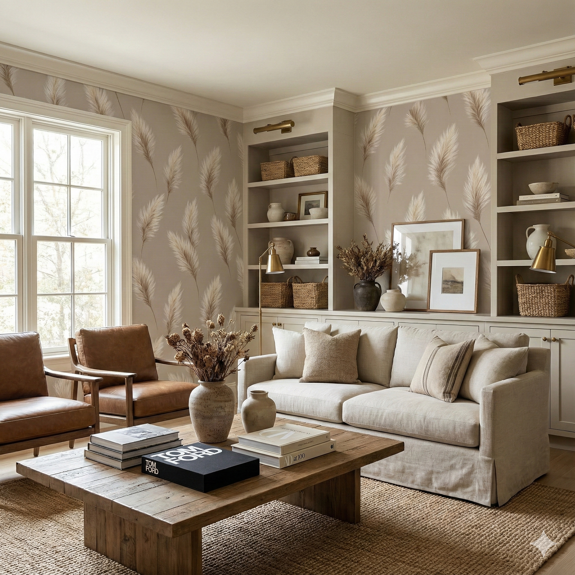 Alta Plumegrass distills the softness of pampas plumes into a series of weightless, drifting feathers rendered in warm ivory, wheat, and blonde beige. The plumes appear almost illuminated from within, each strand individually articulated to give a realistic, airy texture. Against a muted taupe-beige background, the arrangement feels graceful and cinematic—light enough to fill a room without visually crowding it. This pattern is ideal for coastal chic interiors, boho-lux spaces, nursery walls needing softness, or modern living rooms with warm, earthy palettes. Alta Plumegrass pairs beautifully with boucle furniture, rattan, oatmeal linens, vintage pottery, and soft matte gold accents.