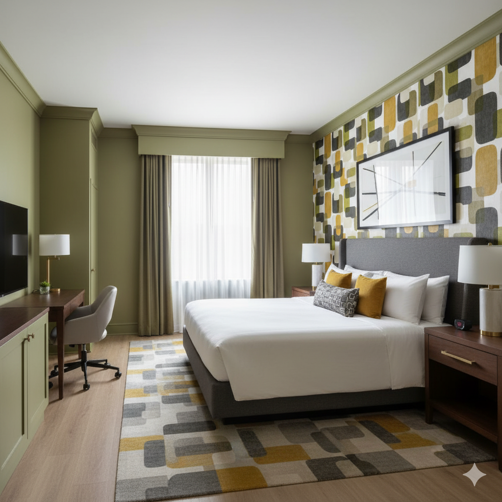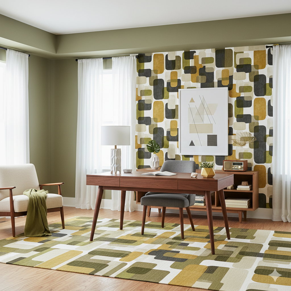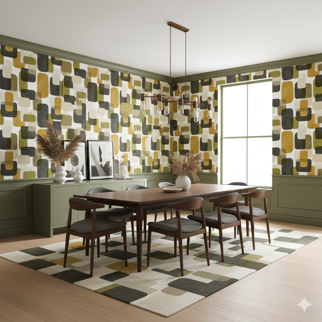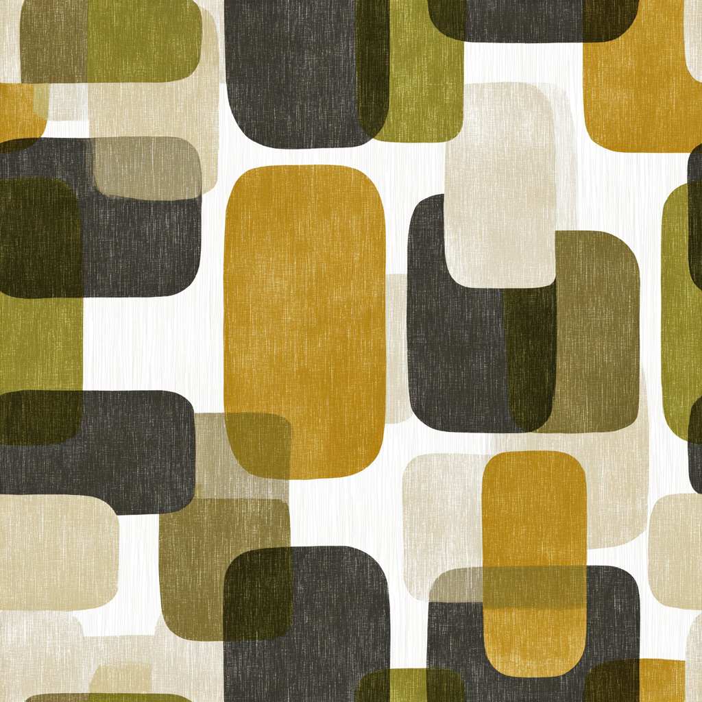 A celebration of mid-century optimism, Amberline features overlapping rounded rectangles in olive, ochre, black, and sand — each shape softly layered with painterly texture. The pattern channels vintage upholstery, Eames-era furniture, and retro cocktail lounges, yet feels distinctly contemporary in its abstract rhythm. Perfect for accent walls, office nooks, or creative studios, Amberline brings a sculptural sense of balance and warmth. It thrives in spaces with walnut wood tones, brass lighting, and minimalist furniture, delivering both nostalgia and modern refinement.