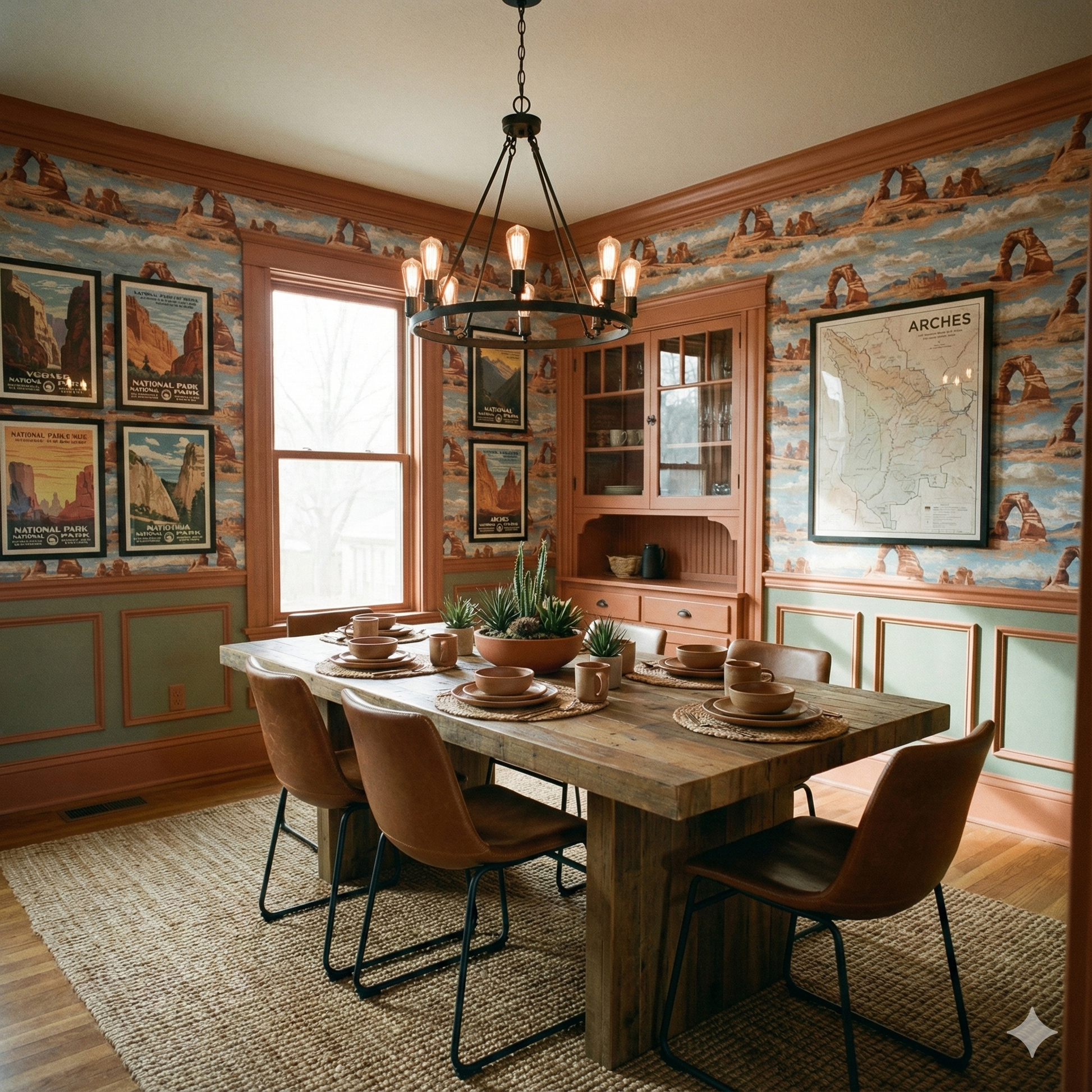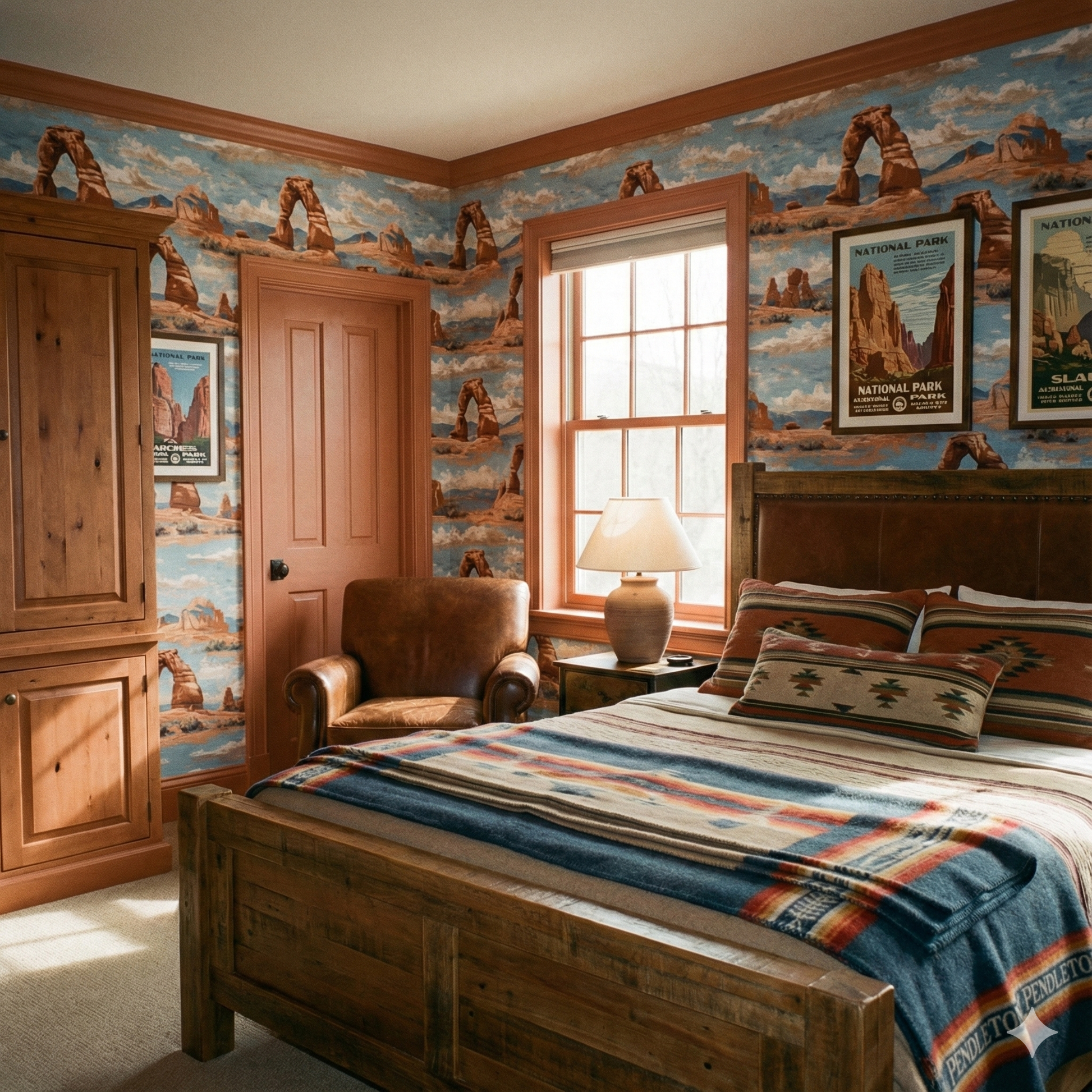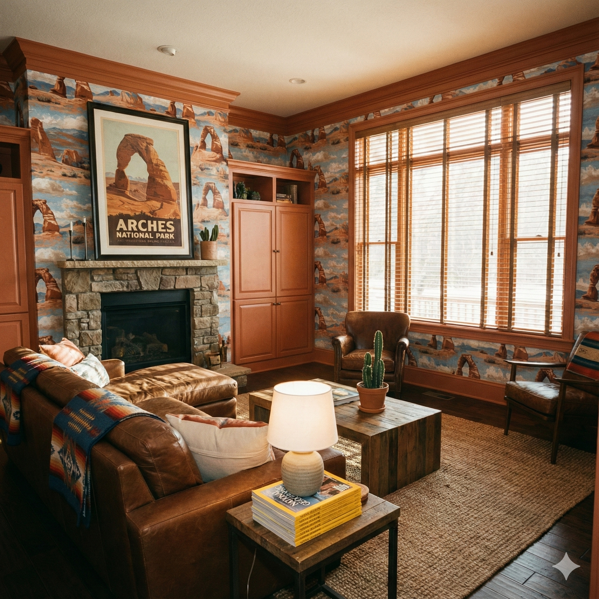 “Arches Horizon” celebrates the sculptural landscapes of the American Southwest — sweeping stone formations rising beneath endless blue skies. Rendered in hand-painted hues of rust, ochre, and sky blue, it captures the balance between light and shadow that defines the desert’s beauty. The painterly style feels timeless and tactile, lending warmth and narrative to any wall. Perfect for cabins, lodges, or eclectic homes craving natural grandeur, “Arches Horizon” transforms interiors into cinematic panoramas of sun, stone, and silence — where every wall tells a story of time and terrain.
