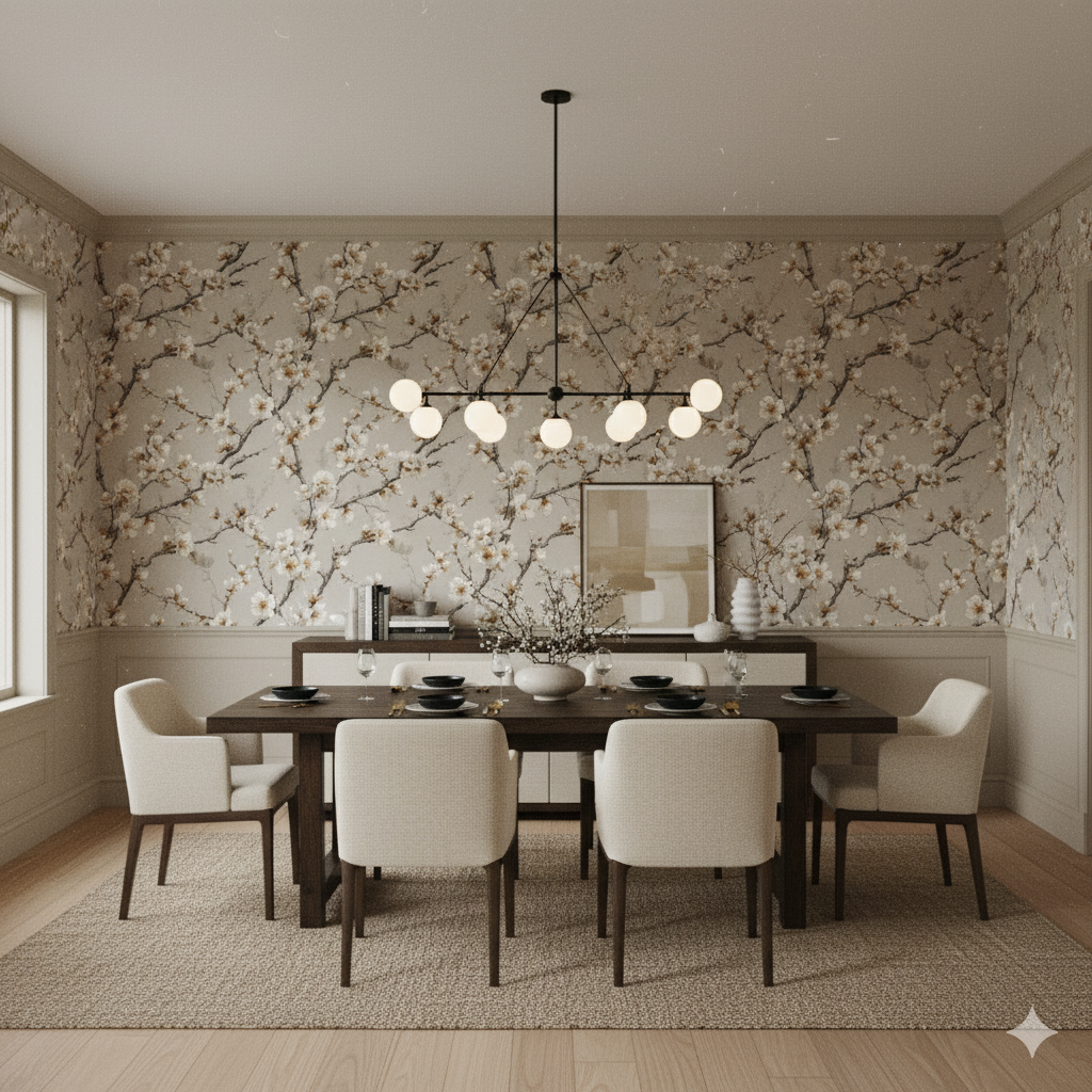 A study in quiet elegance, Ashen Bloom evokes the soft melancholy of early spring. Pale almond blossoms unfold along weathered gray branches, their petals rendered in delicate ivory with whispers of ochre at the stamens. Against a soft taupe background, the composition feels both romantic and architectural—balancing movement with restraint. This wallpaper transforms a room into a tranquil sanctuary, ideal for bedrooms, reading corners, or formal dining spaces seeking a serene, painterly grace. Ashen Bloom harmonizes beautifully with linen upholstery, warm metals, and muted neutral palettes, embodying that blend of refinement and impermanence found in nature’s earliest blooms.