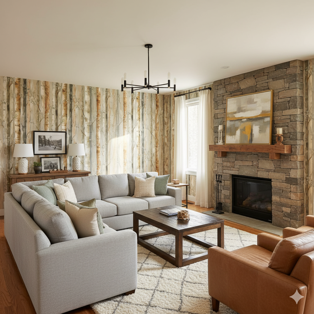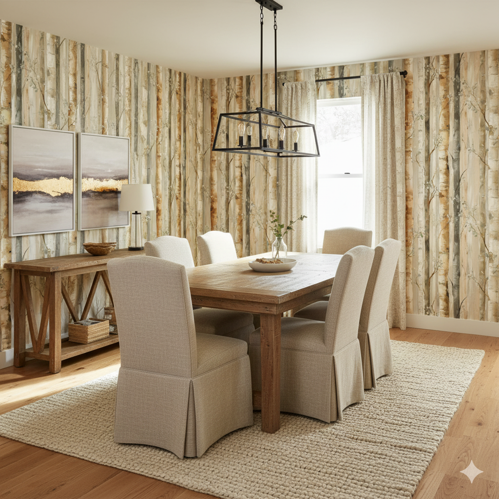 Vertical sweeps of aspen trunks in warm ivory, gray, and golden taupe create a woodland sanctuary feel. Soft brush textures and subtle branches weave in and out of the layered bark, lending authenticity and hand-painted artistry. Aspen Vale is ideal for mountain homes, rustic cabins, or modern living rooms wanting a touch of organic grounding. Its palette works in both bright and moody spaces, bringing a forest’s rhythm indoors. This design is equally suited for a retreat-style bedroom as it is for a statement-making hallway that feels expansive and inviting.