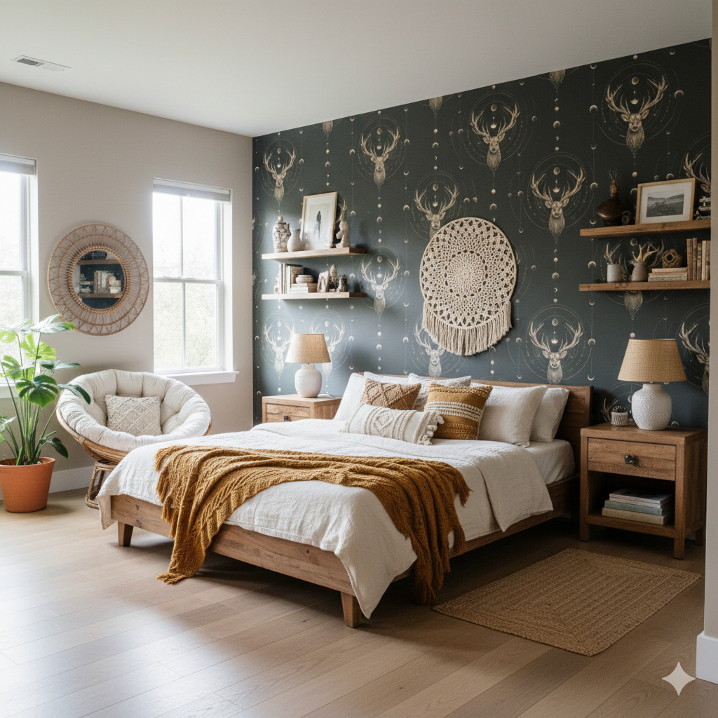 This design blends wilderness iconography with celestial mystique, featuring a stoic stag framed inside concentric lunar orbits and thin, delicate star paths. Rendered in warm antique-gold linework against a deep graphite background, the pattern feels mythic and modern at once, almost like a mural pulled from an illuminated manuscript or Nordic folklore. Constellations, half-moons, planetary spheres, and dotted radiuses create a sense of cosmic alignment, making the stag appear as a guardian spirit of sky and forest. It’s a striking statement pattern for moody libraries, masculine offices, whiskey lounges, lodge-inspired bedrooms, and boutique hospitality spaces seeking something atmospheric and symbolic. Pairs beautifully with walnut woods, dark leather, brass accents, and minimal styling so the artwork can stand center stage.