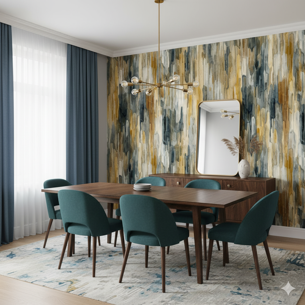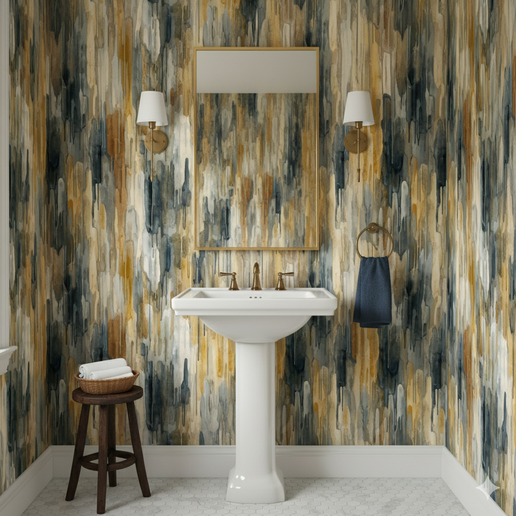 Fluid and dynamic, this pattern feels like molten metal poured into vertical drips of watercolor. Bands of gold, slate, charcoal, and pale ivory melt downward in rivulets, merging industrial grit with luminous elegance. It conjures the drama of candle wax dripping or mineral deposits forming over centuries, yet remains abstract enough to blend into a variety of modern settings. Perfect for feature walls in urban apartments or chic hotel lobbies, it carries a balance of raw energy and refined shimmer. The palette of ochre, smoky gray, and muted cream creates a grounding yet luxurious atmosphere, particularly striking when paired with black marble, metallic accents, or textured fabrics like velvet and linen.
