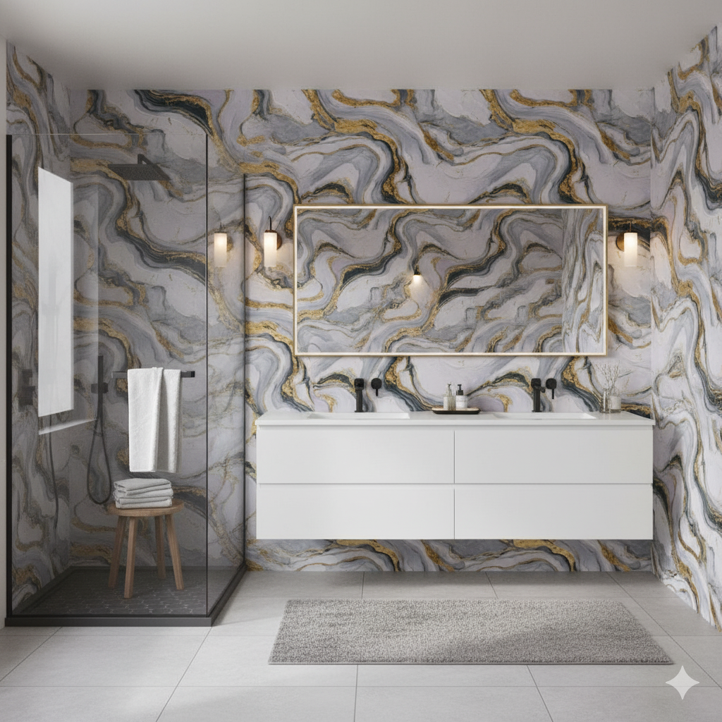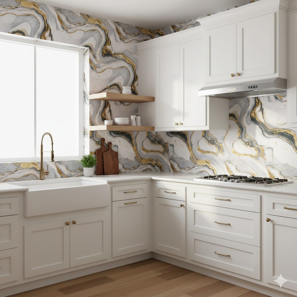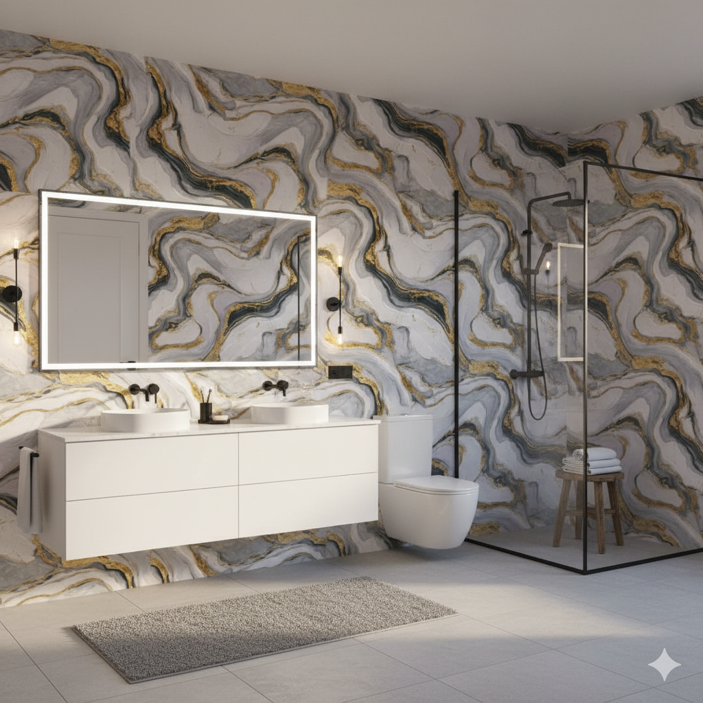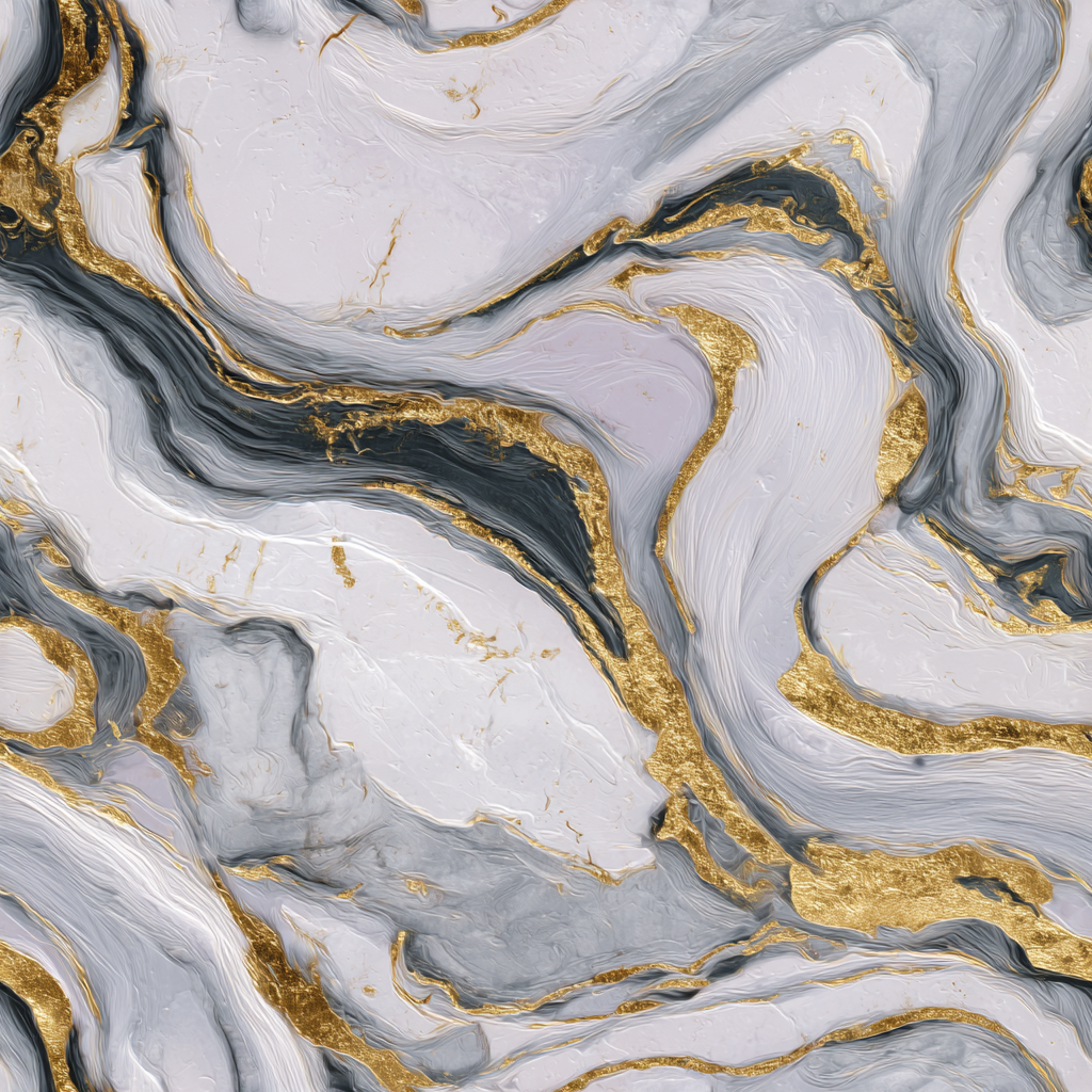 This marble-inspired composition blends milky whites, pale greys, and glimmering gold into sweeping, ribbon-like veins that feel as if carved by time and pressure. The result is both luxurious and soothing, striking a balance between natural stone realism and painterly abstraction. The gold detailing catches the eye with elegance, making it feel opulent yet understated. This wallpaper works especially well in dining rooms, bathrooms, and entryways where refinement is key, offering a timeless backdrop that pairs effortlessly with both modern fixtures and classical furnishings. Its fluid motion brings a sense of continuity, like a living surface that breathes sophistication into any environment.