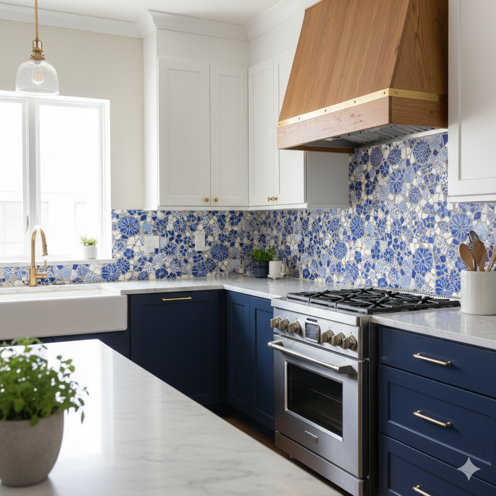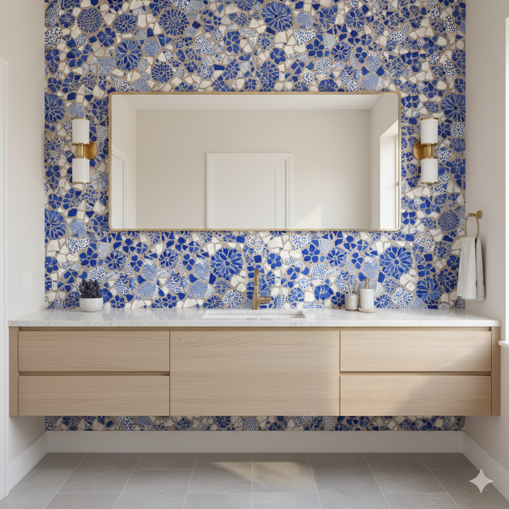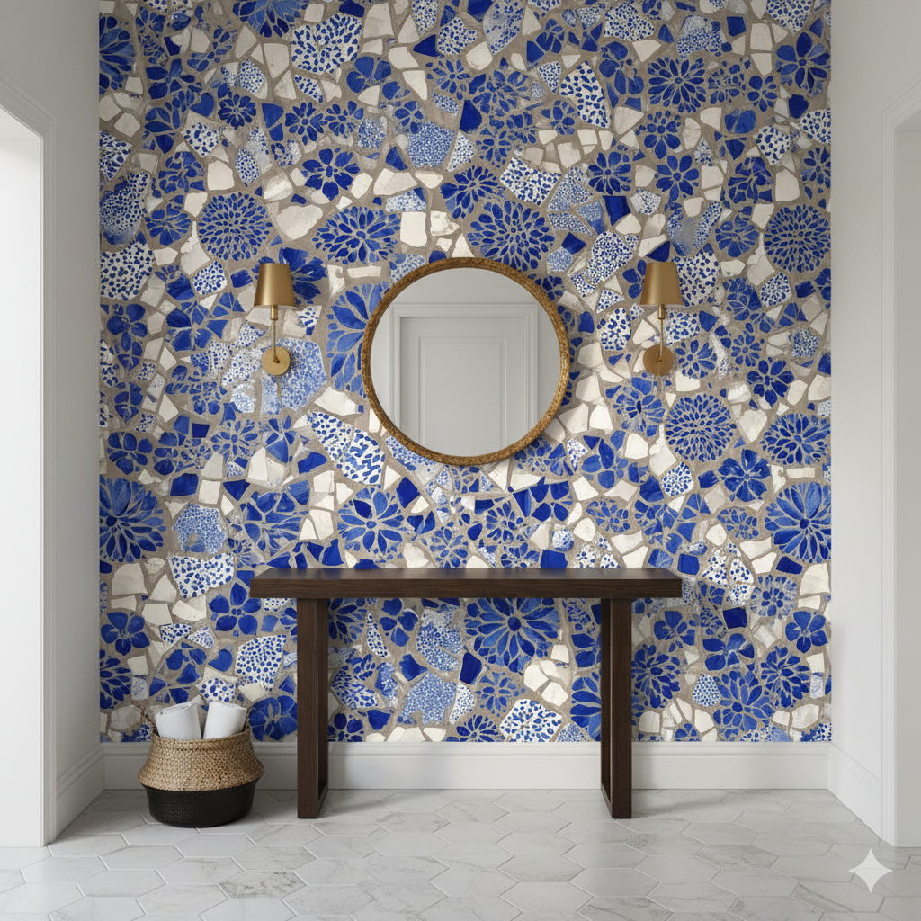This bold mosaic-like print evokes shattered pottery transformed into an artful tableau. The cobalt-blue florals and dotted shards are set in neutral grout, creating the illusion of Mediterranean tiles reimagined on a grand scale. Each fragment feels carefully composed, yet the overall effect is spontaneous and organic. This pattern works beautifully in kitchens, sunrooms, or entryways where natural light can bring out the striking contrast of blue against stone gray. It draws inspiration from Spanish ceramics and Gaudí’s broken-tile mosaics, making it feel both artisanal and cosmopolitan. Pair it with whitewashed wood, terracotta accents, or brushed nickel for a coastal or bohemian interior style.