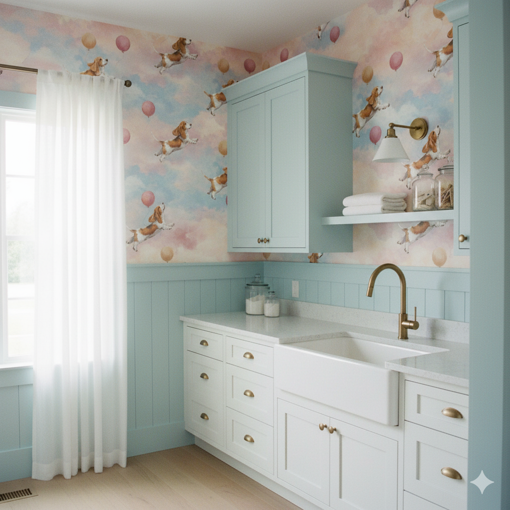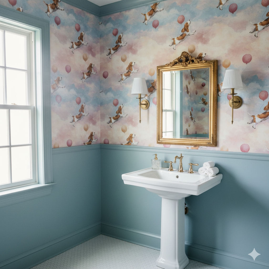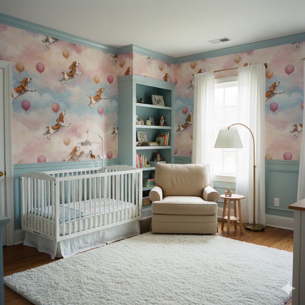 Balloon Chase captures pure joy in motion — playful Basset hounds floating weightlessly among watercolor clouds, chasing pastel balloons through the open sky. The palette blends powder blue, rose, and buttery cream, evoking storybook nostalgia without sacrificing sophistication. Designed to enchant both children and adults, Balloon Chase brings an imaginative lightness to nurseries, mudrooms, or eclectic hallways. It pairs perfectly with natural wood tones, woven rugs, and spaces that embrace whimsy with grace. A charming reminder to take life — and your walls — a little less seriously.