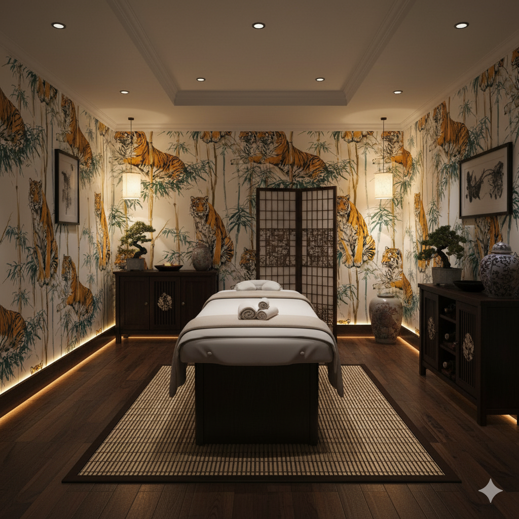 "Bamboo Royalty" is a striking wallpaper that features majestic Bengal tigers lounging and prowling through a delicate bamboo grove. Rendered in expressive brushstrokes of ochre, charcoal, and forest green, the composition is rich with texture and regal poise. The clean white background adds contrast and airiness, allowing each detail of the tiger’s coat and bamboo leaves to stand out vividly. Ideal for accent walls, powder rooms, eclectic offices, or safari-inspired nurseries, this wallpaper evokes wild elegance with an artistic flair.