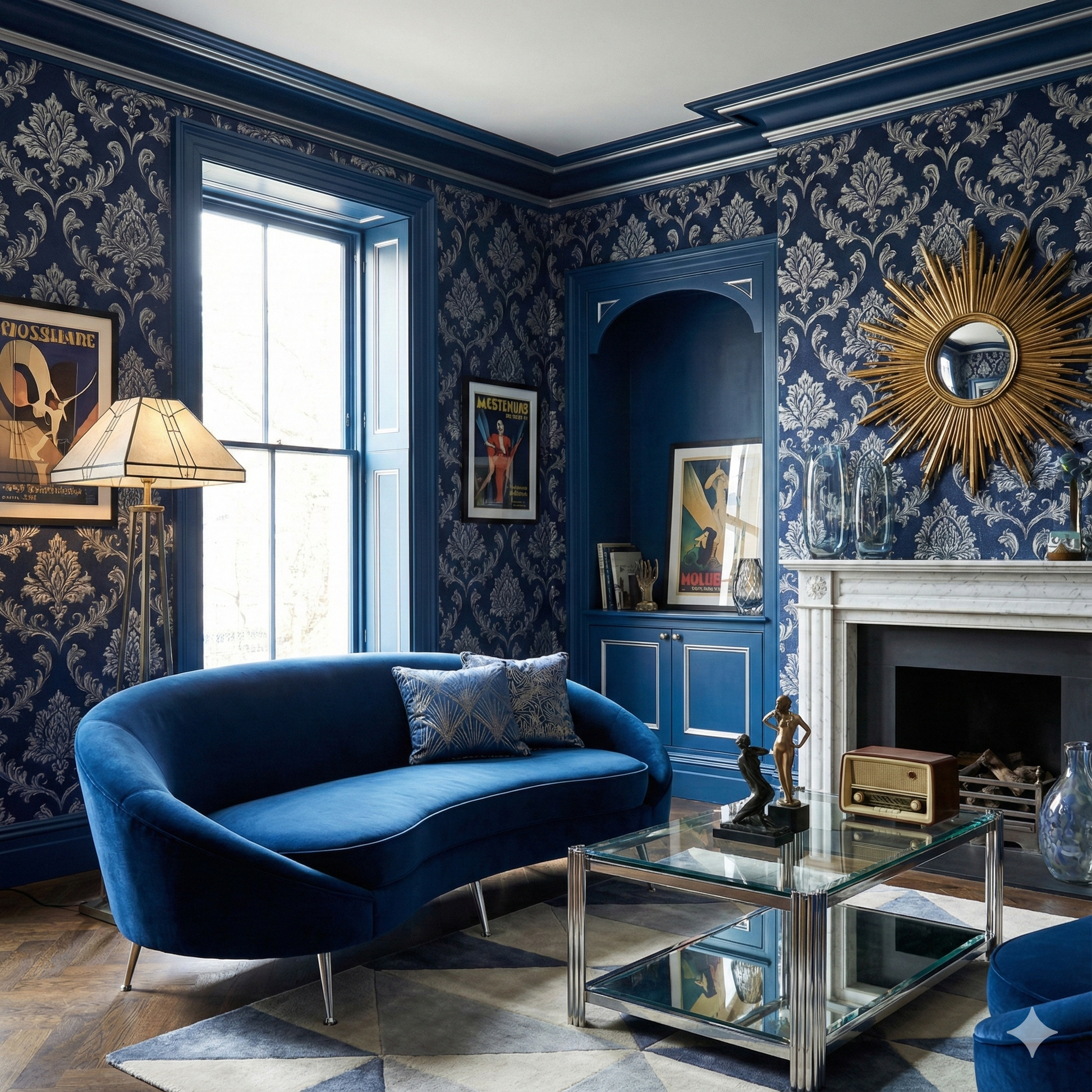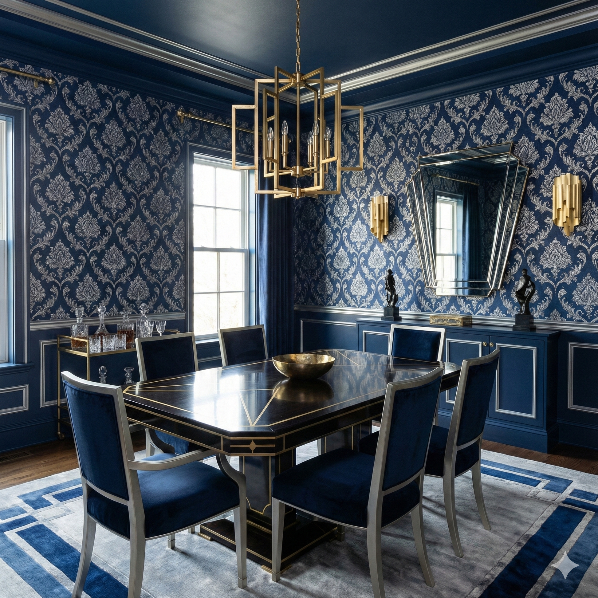 Rich and commanding, “Baroque Midnight” transforms classic damask into a statement of modern opulence. Metallic silver motifs unfurl against deep navy, their sculpted texture resembling hand-pressed leather or embroidered silk. The interplay of light and shadow gives this pattern a regal presence—perfect for dining rooms, lounges, or boutique interiors seeking an atmosphere of grandeur. It’s both stately and sensual, invoking old-world craftsmanship through a distinctly contemporary lens. When lit warmly, it glows with quiet luxury and depth.