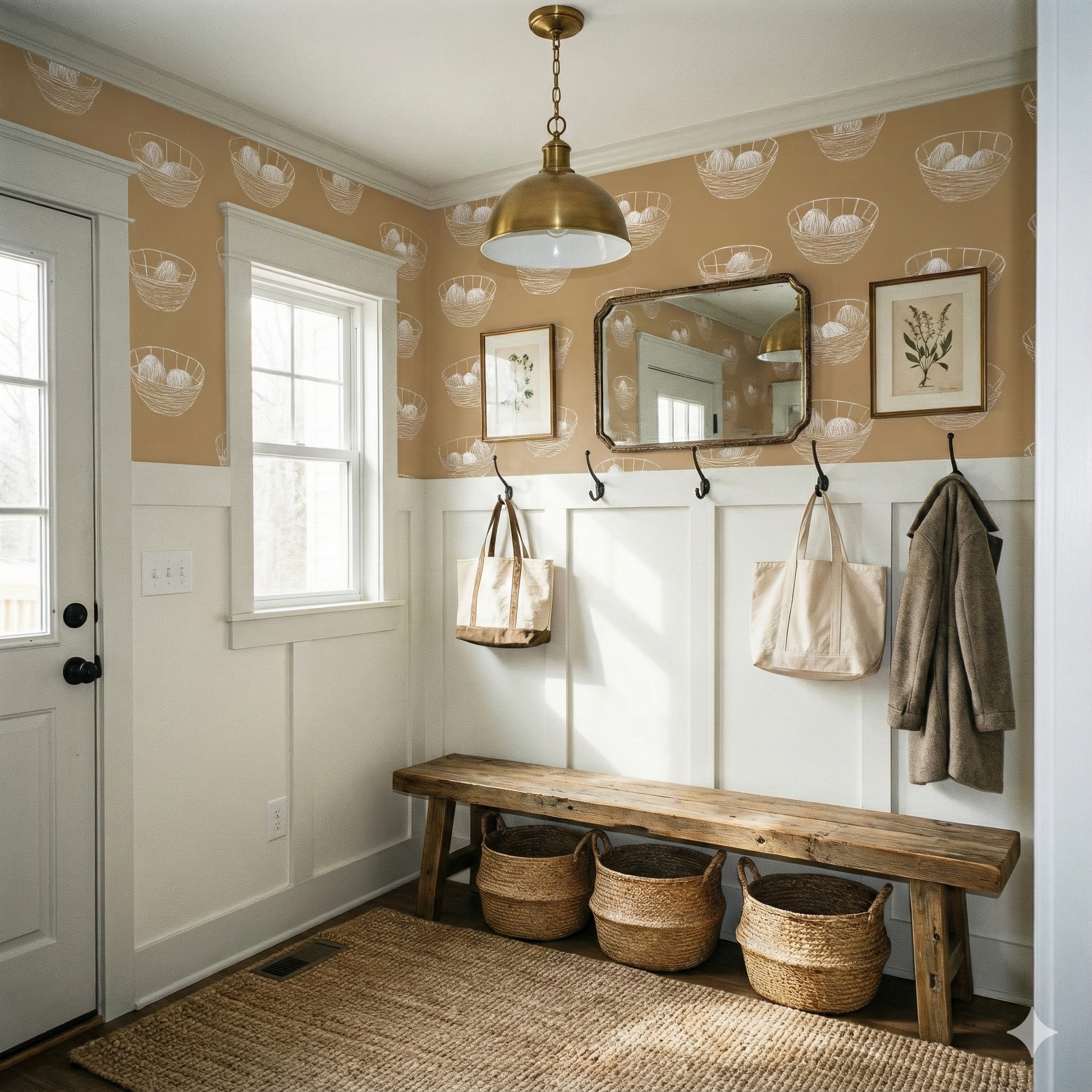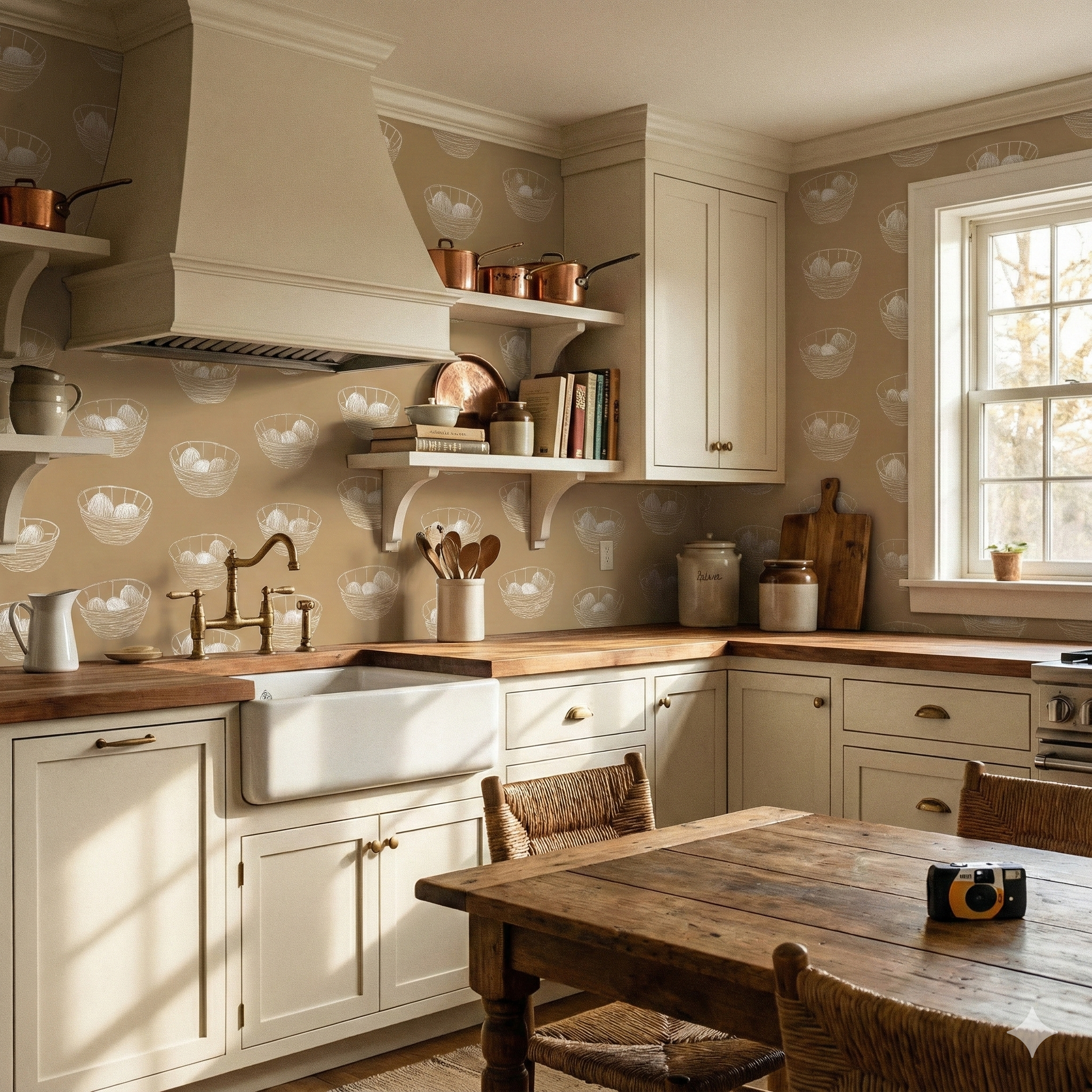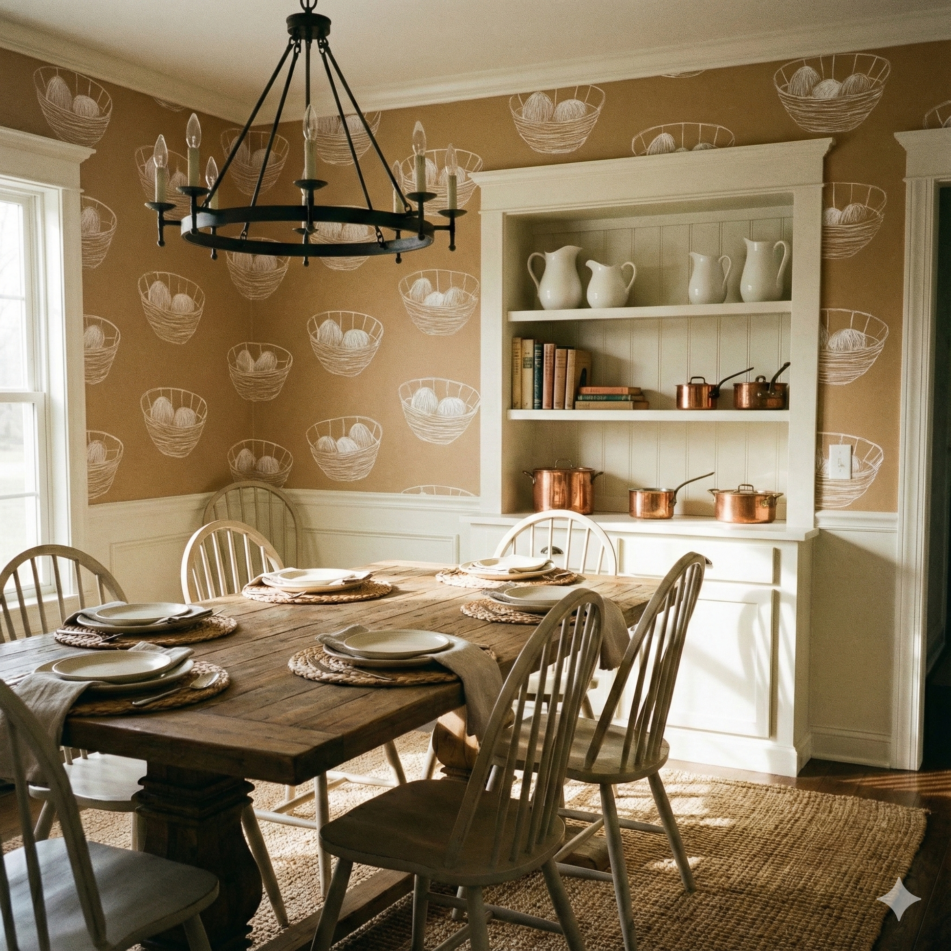Basket of Orlaine is a charming, folk-inspired motif of hand-drawn wire baskets filled with round, textured forms reminiscent of produce, eggs, or natural objects. Sketched in thin white linework against a honey-brown ground, the pattern feels playful and artisanal—like something found in a Provençal market illustration or a vintage cookbook. There’s an honest simplicity to it, making it ideal for kitchens, breakfast nooks, cottage-style mudrooms, farmhouses, children’s play spaces, or rental properties aiming for personality without bold color. It blends beautifully with butcher-block counters, brass hardware, open shelving, or rustic ceramics.