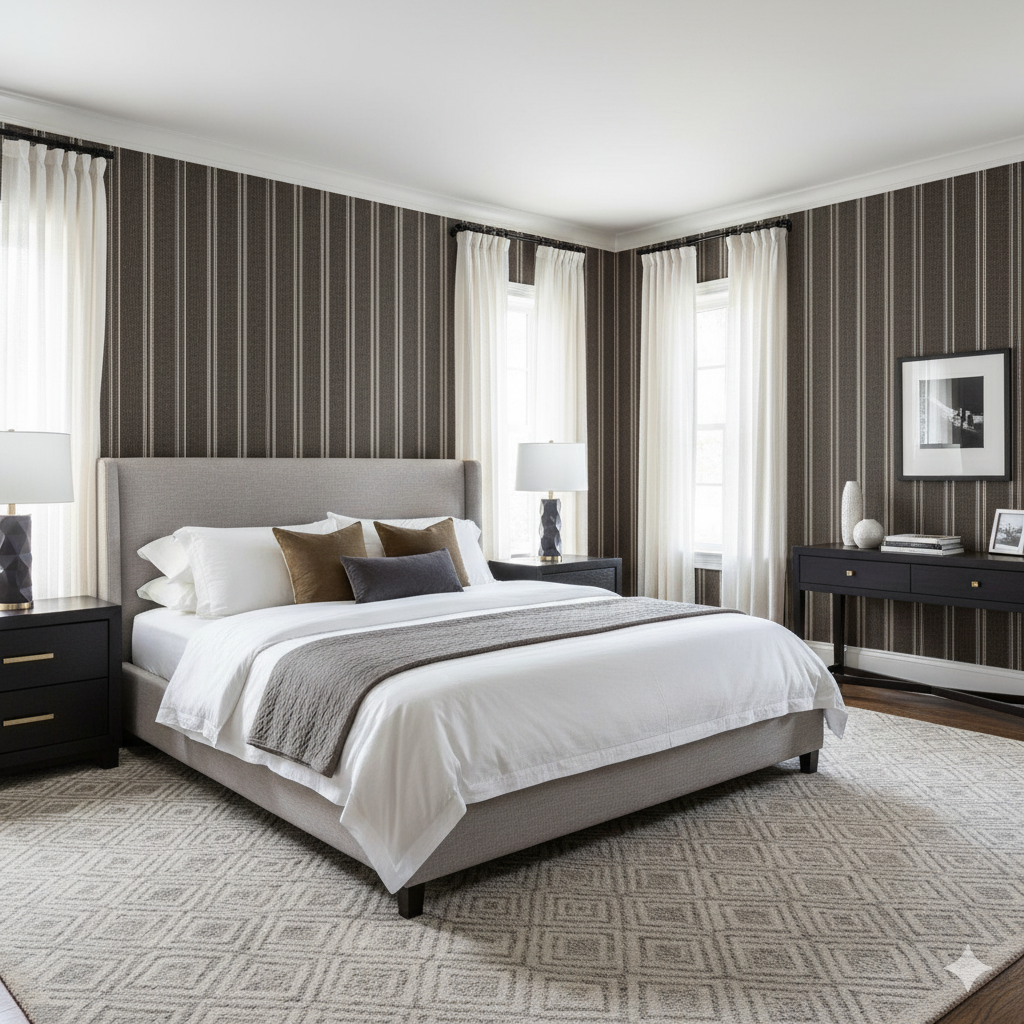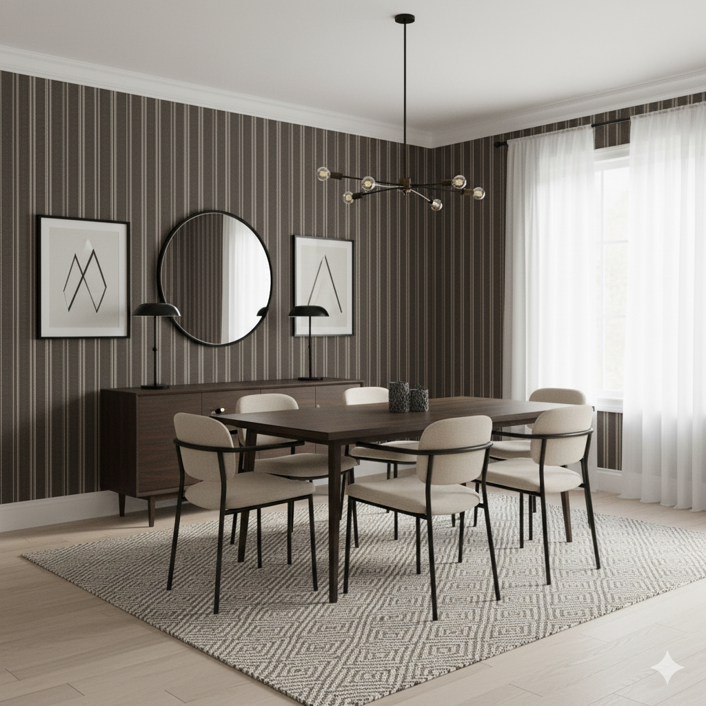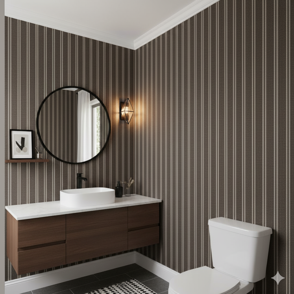 Bastion Stripe redefines the classic stripe with the tactile richness of woven textiles. Alternating espresso, taupe, and ivory bands create structure and sophistication while maintaining warmth through subtle fabric texture. This pattern feels timeless yet tailored—perfect for hallways, dining rooms, or offices that need a sense of rhythm and refinement. The tonal balance works beautifully in both traditional and modern interiors, complementing wood floors, stone surfaces, and warm metallic finishes. Bastion Stripe exudes quiet confidence—a contemporary heirloom that never tries too hard, yet always feels right.