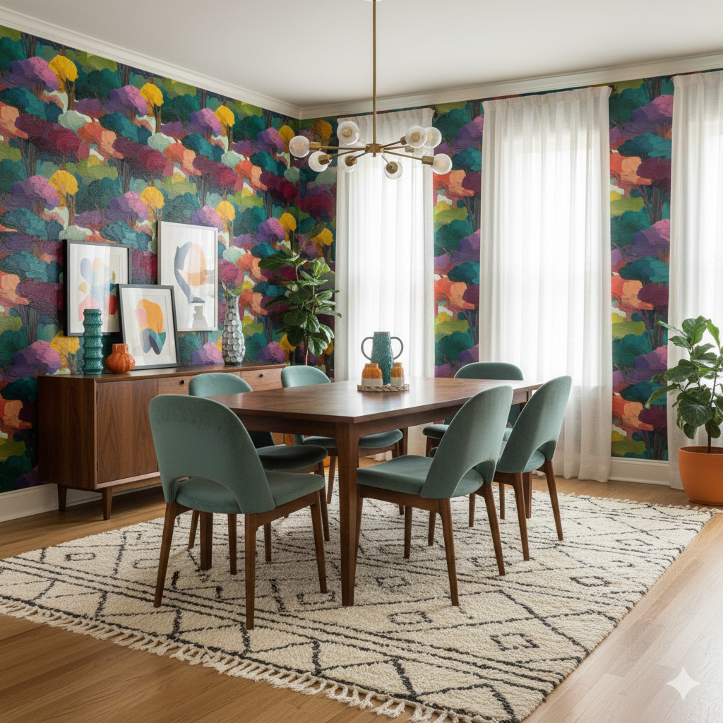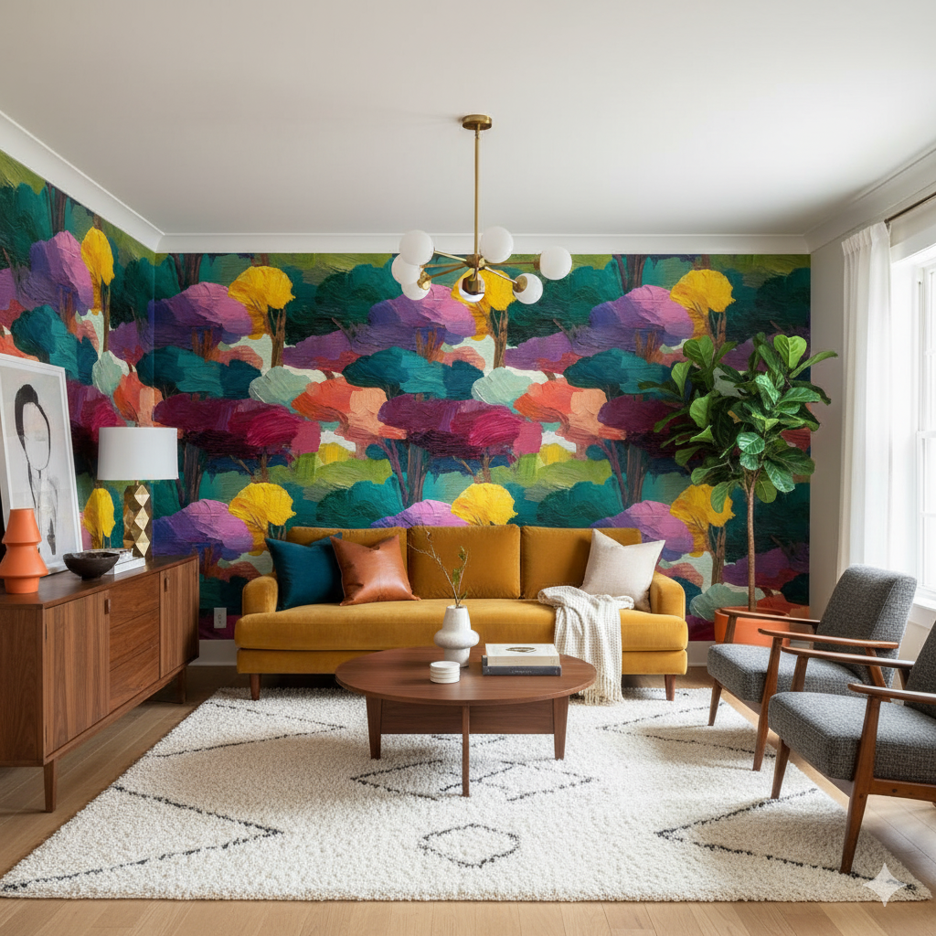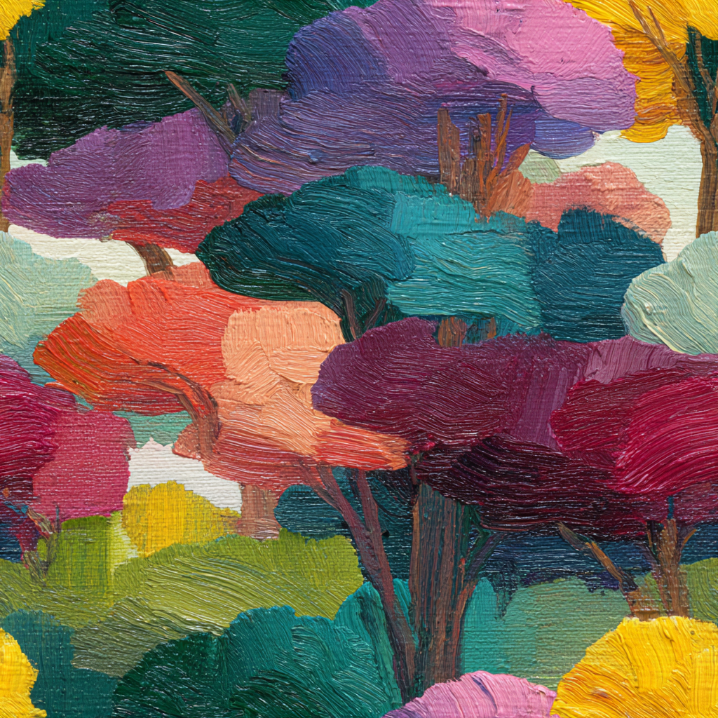 Belladonna Grove evokes the mystique of a painted forest at the edge of imagination — where brushstrokes become canopies, and color breathes like living light. Deep emeralds, plum purples, coral oranges, and ochre yellows intertwine in lush, impasto texture, resembling treetops glimpsed through afternoon haze. The palette feels both dreamlike and grounded — rich yet soothing. This wallpaper transforms any room into a poetic escape, perfect for moody dining rooms, art-forward offices, or bedrooms that crave warmth without predictability. Paired with walnut tones, matte brass, or velvet upholstery, it exudes painterly sophistication reminiscent of a 20th-century expressionist landscape.