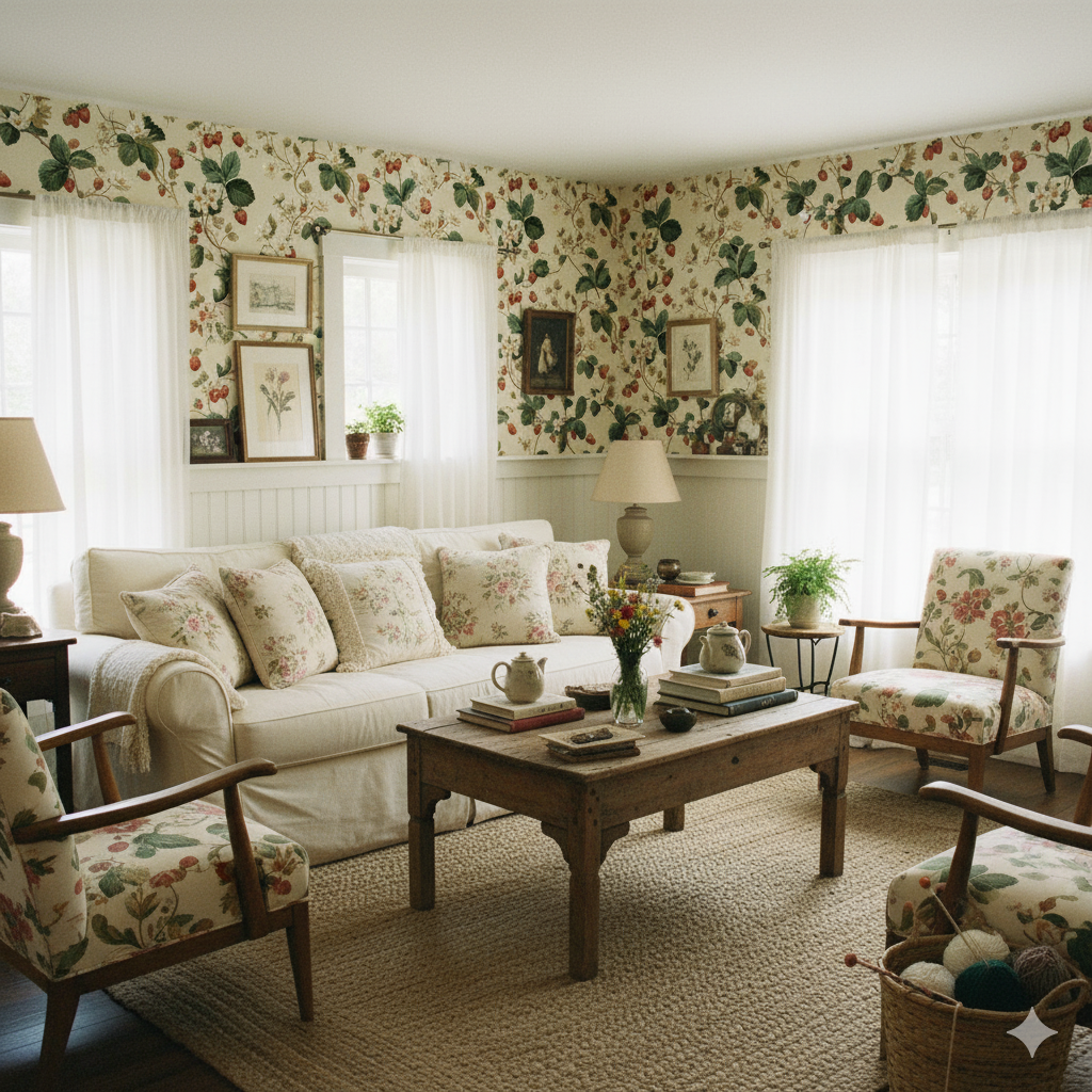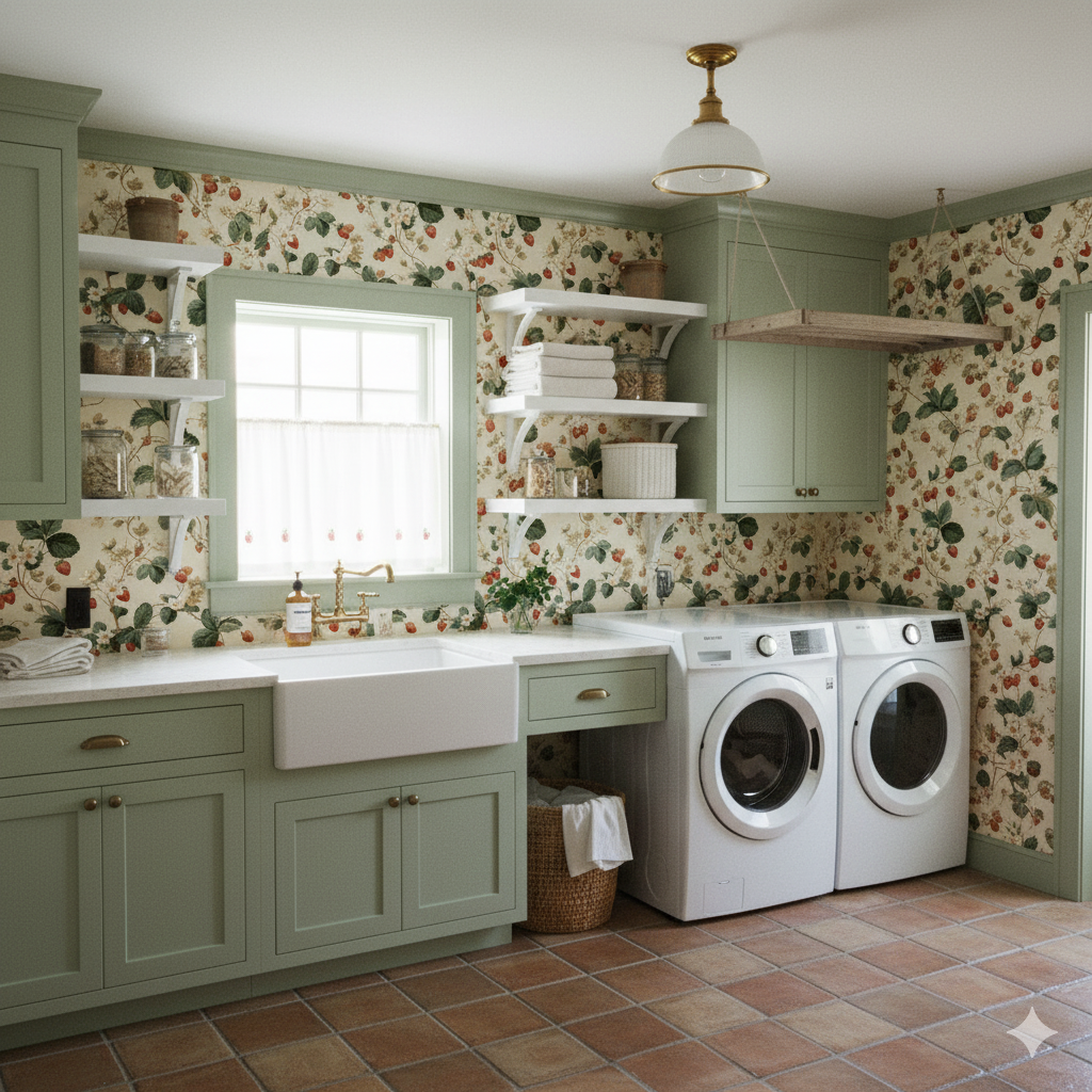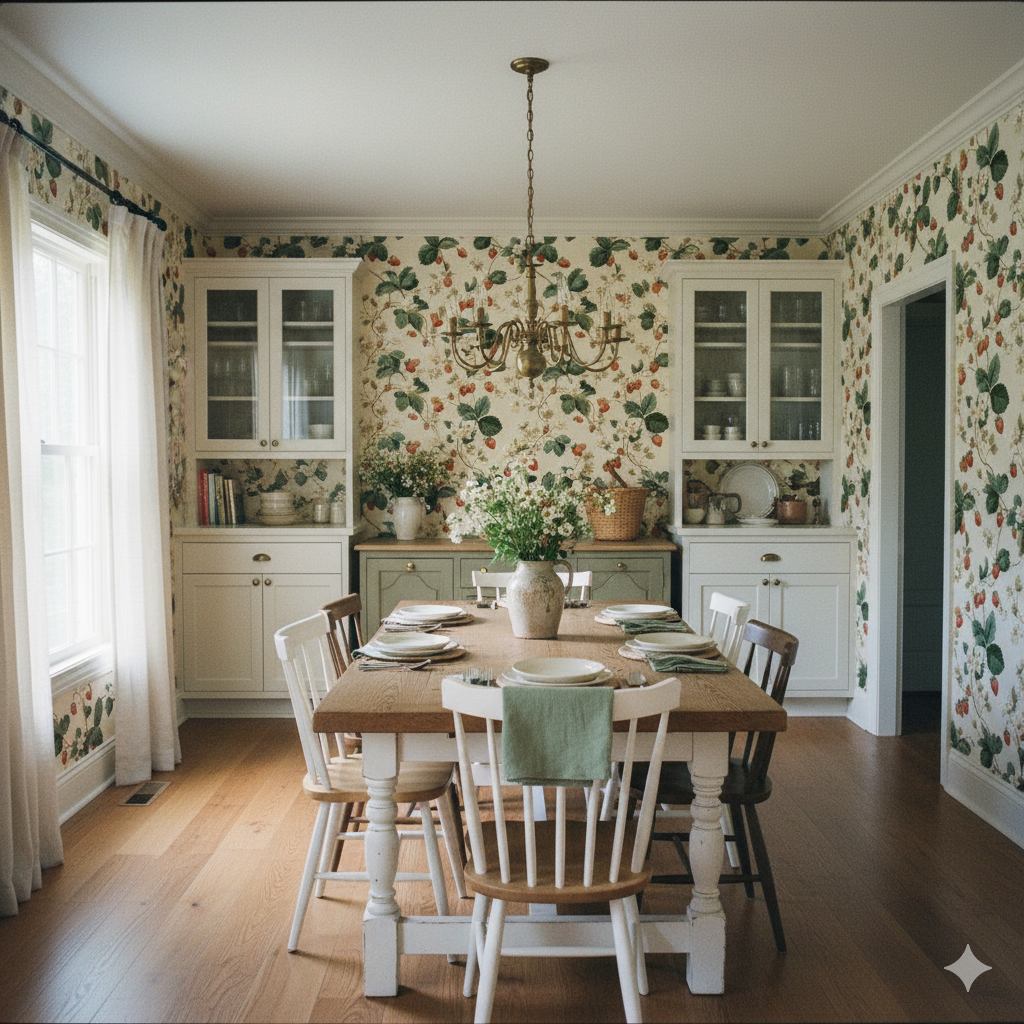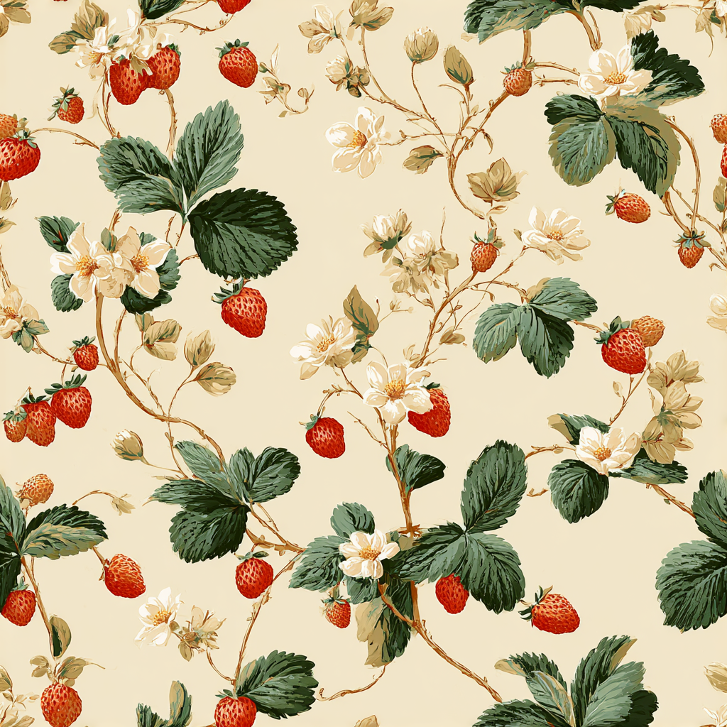 A pastoral dream reimagined for modern interiors, Berryvale celebrates the beauty of strawberry fields in bloom. Lush leaves, delicate blossoms, and ripened fruit intertwine across a butter-cream background, painted in soft botanical hues of green, ivory, and crimson. The detailing feels lifted from 19th-century engravings—refined yet comforting. Perfect for kitchens, conservatories, or countryside homes, Berryvale adds freshness and storytelling to the walls, capturing that feeling of summer abundance year-round.
