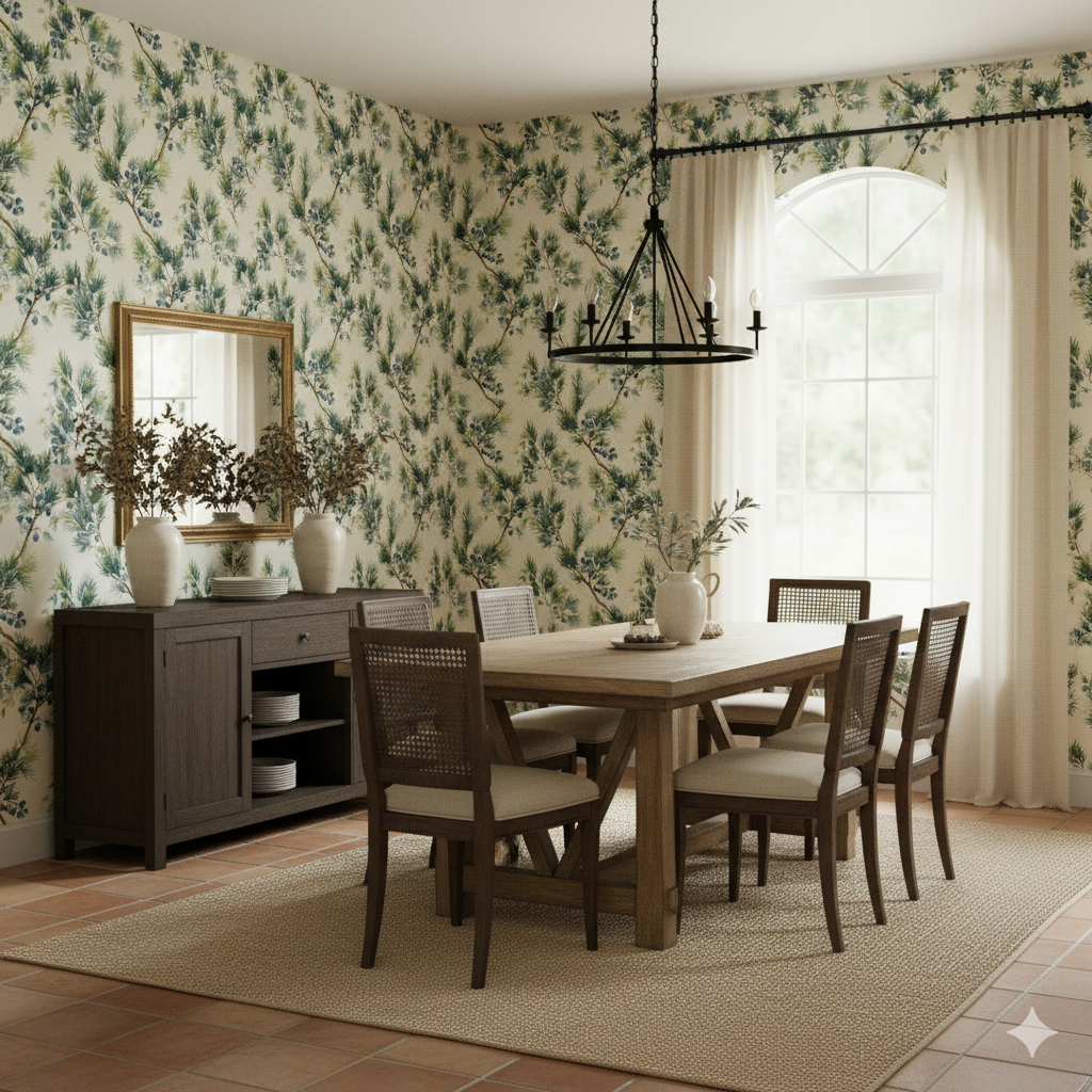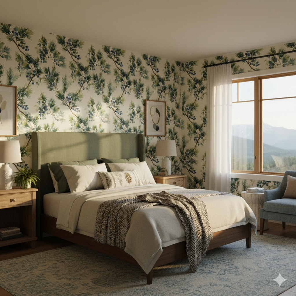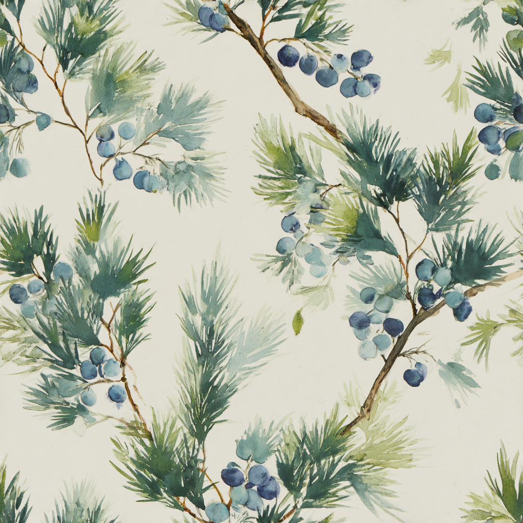 Loose watercolor juniper branches painted in shades of fresh green and cool blue scatter across a soft ivory background, dotted with clusters of indigo berries. The design captures both the sharp freshness of pine needles and the juicy abundance of berries, making it a lively yet grounded pattern. Bitterberry Field is ideal for rustic cabins, lakeside cottages, or cozy kitchens, but it also translates beautifully into modern interiors that crave a touch of natural whimsy. For search terms, this wallpaper connects to watercolor pine wallpaper, juniper berry wall coverings, and nature-inspired watercolor botanicals. Its airy watercolor style provides both freshness and texture without overwhelming a room.