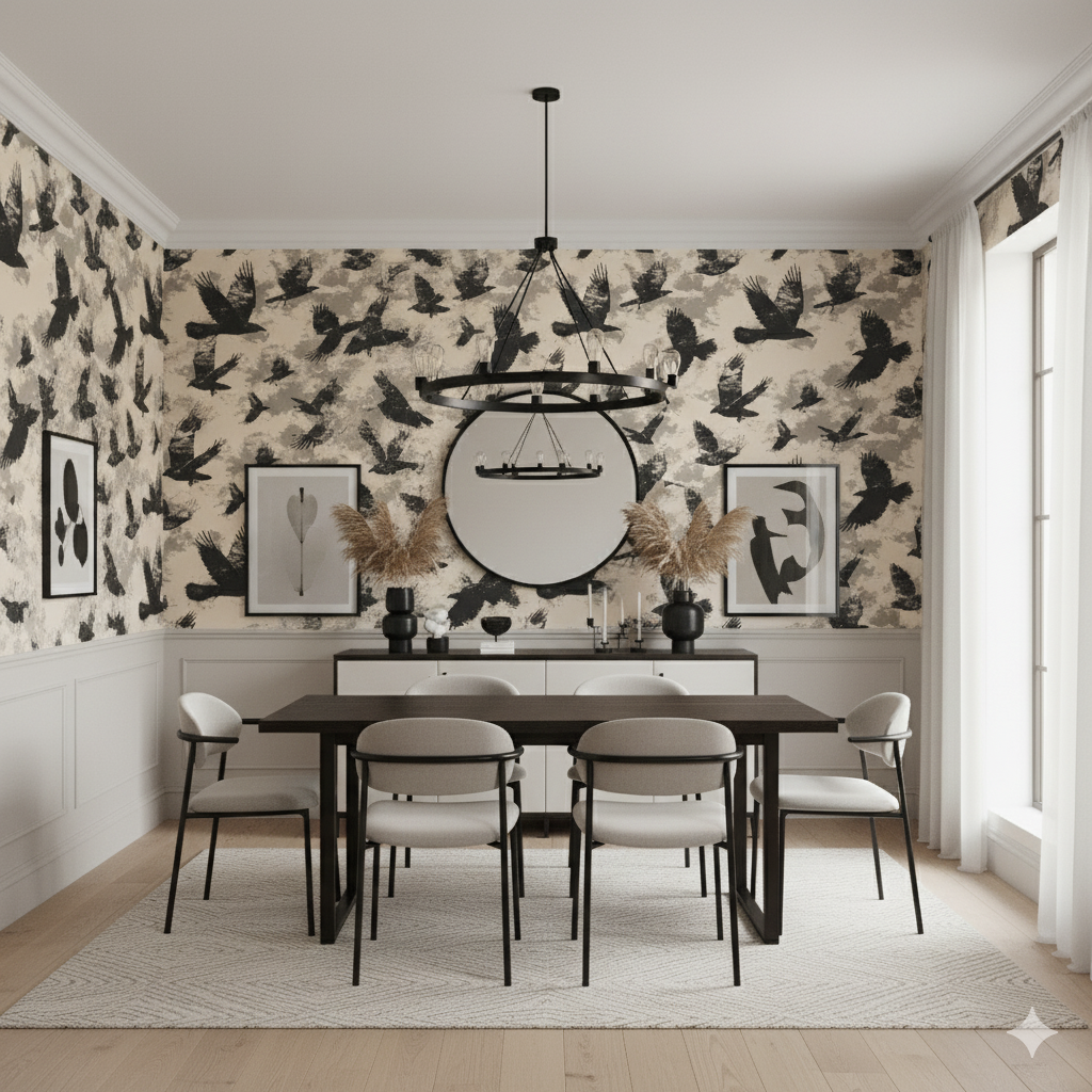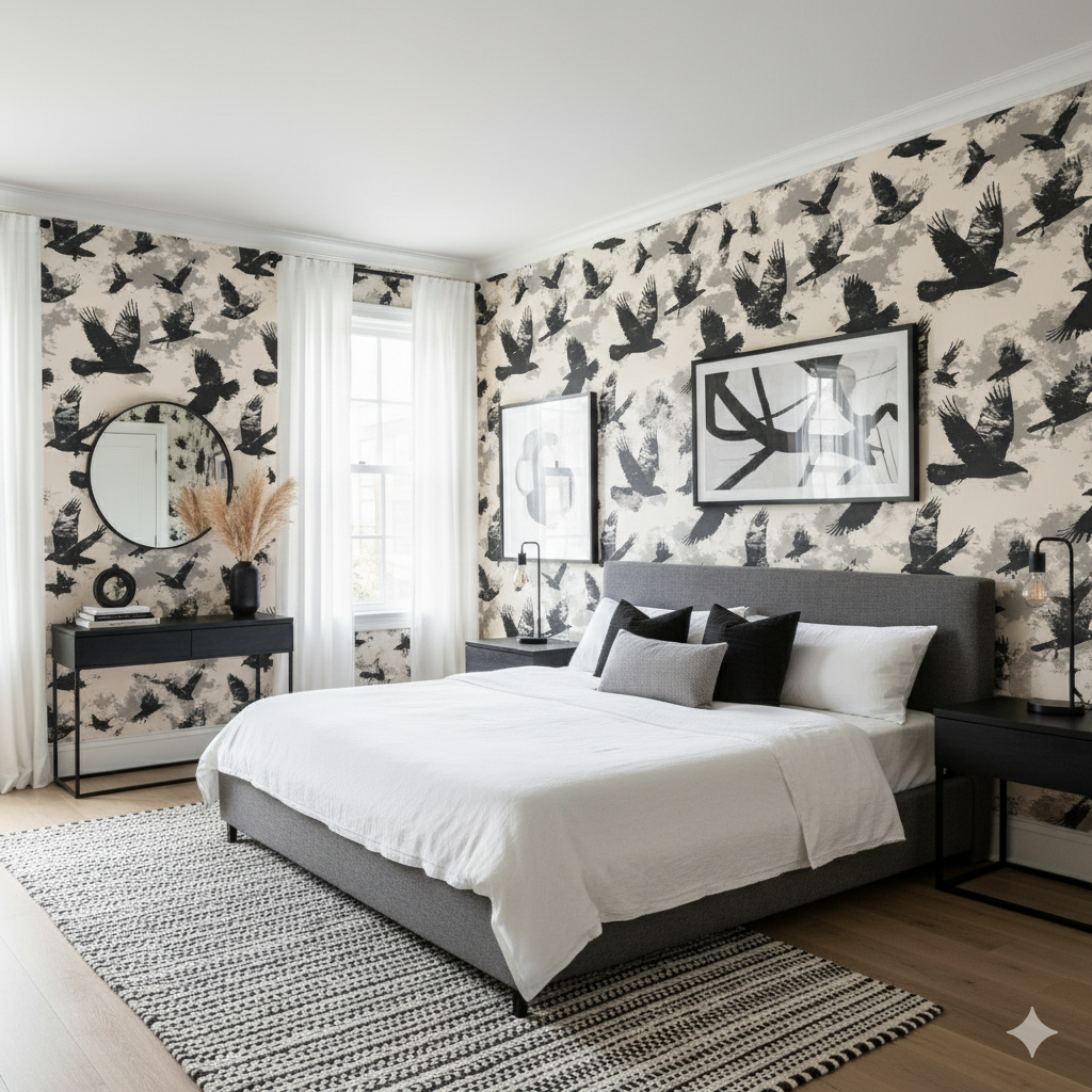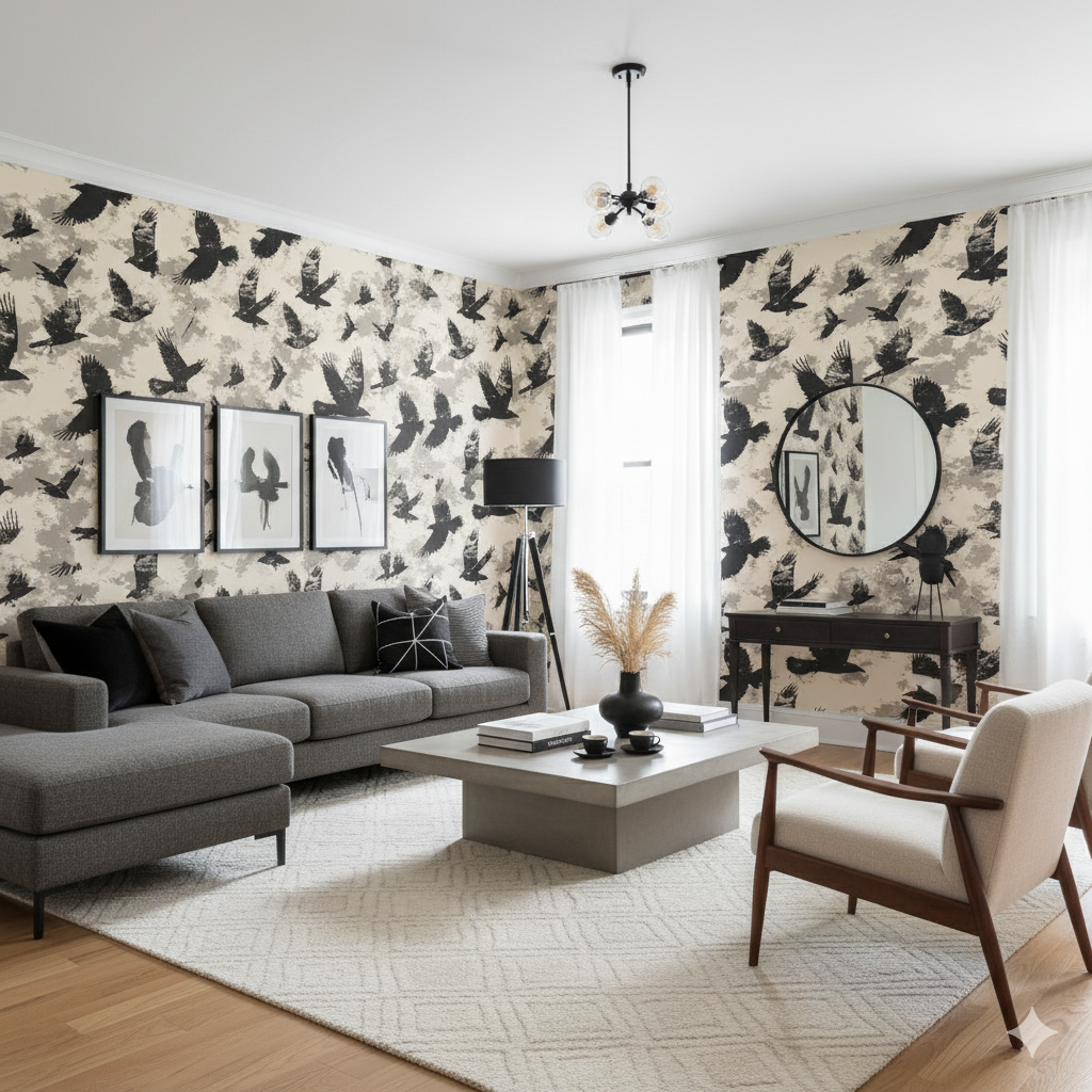 Dark, poetic, and untamed—Blackwing Hollow pays homage to flight, freedom, and the shadows that linger between. Charcoal silhouettes of crows drift across a parchment sky, their wings mid-beat against an ethereal mist of taupe and sand. The contrast of dark ink against warm neutral tones makes this design feel both moody and timeless, like a scene lifted from an old etching. Ideal for creative studios, reading rooms, or moody modern homes, it brings energy and storytelling into any space. Whether paired with worn leather, aged brass, or rich walnut, Blackwing Hollow transforms a room into something cinematic—mysterious yet grounded, wild yet elegant.