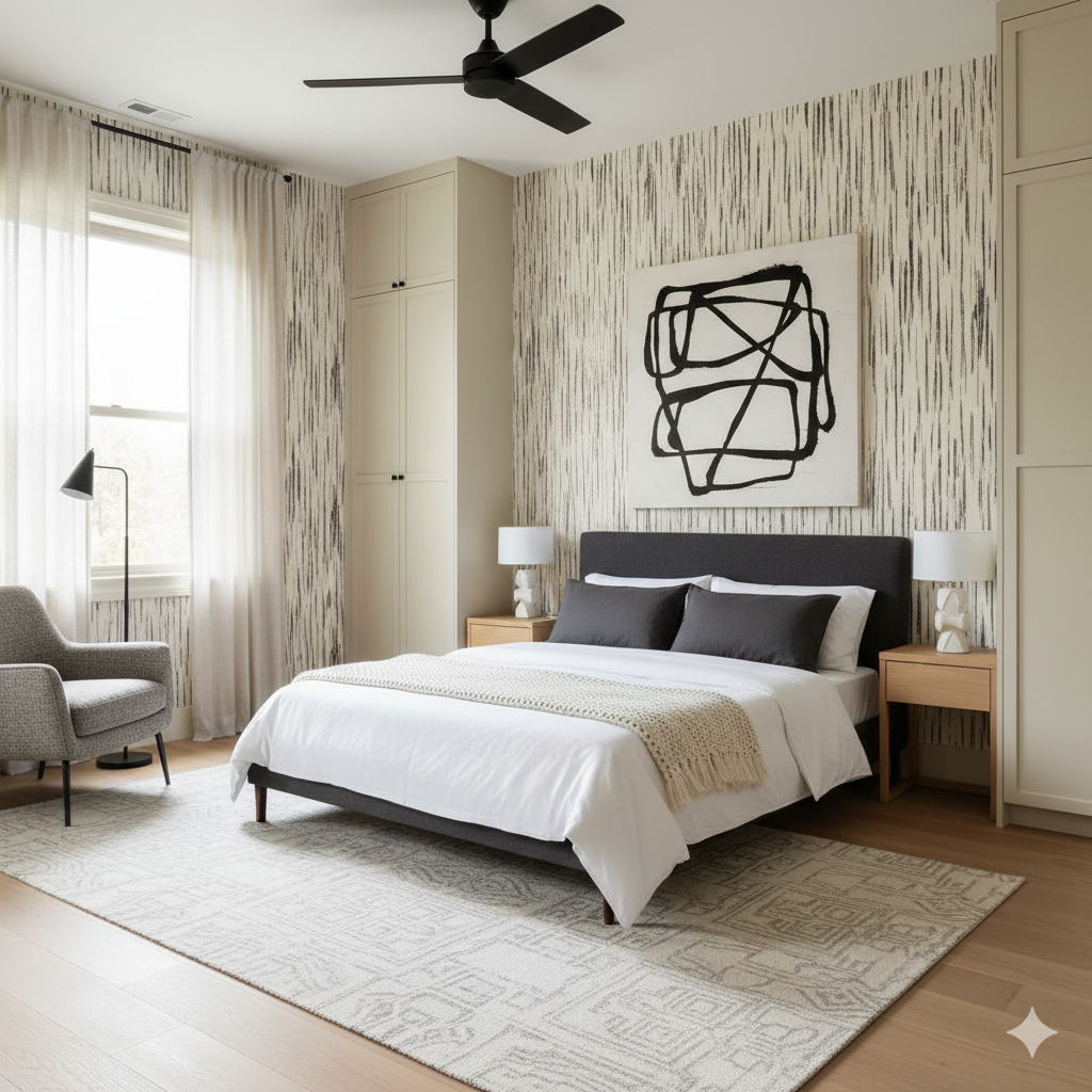Blackwood Etch is raw sophistication — a contemporary take on organic texture. Vertical charcoal streaks cascade down a warm parchment ground, like ink bleeding across handmade paper. It’s minimalist but alive with subtle irregularity, adding character to modern interiors without overwhelming. This design thrives in architectural spaces, dining rooms, or hallways that benefit from moody texture. It pairs flawlessly with black fixtures, soft neutrals, and layered materials like stone or rattan. The result feels modern, sculptural, and quietly bold.