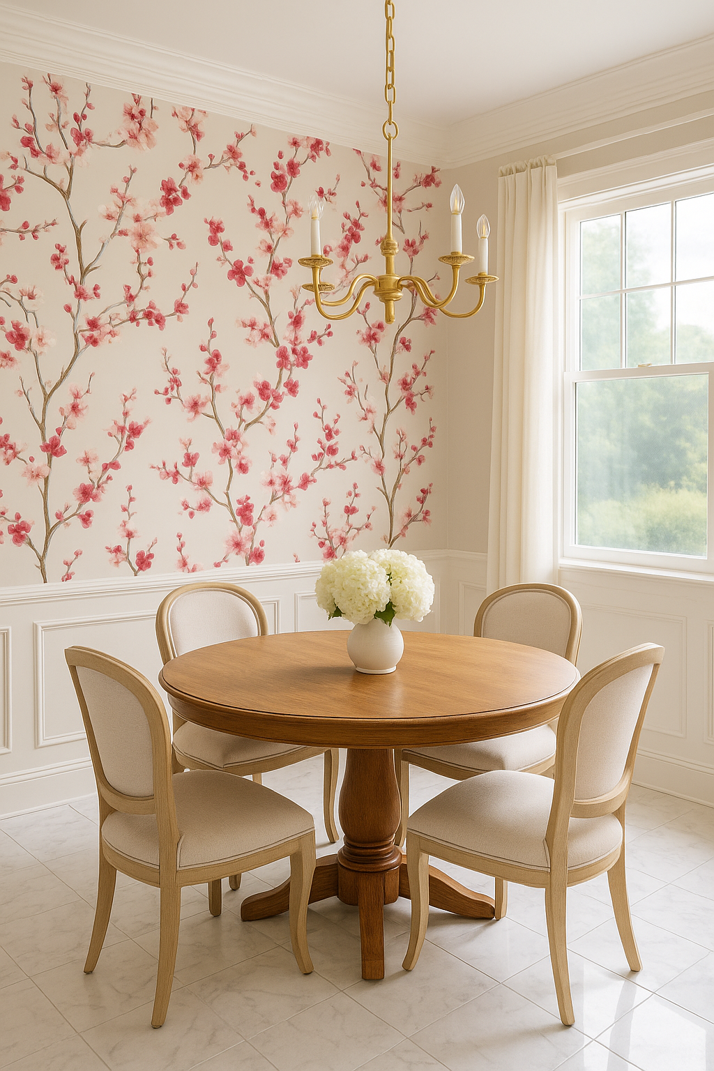 Poised like ink on parchment, Blossom Script is a light and lyrical floral featuring wispy cherry blossoms blooming from thin, twisting branches. Shades of soft rose, blush, and warm coral spread across a pale beige canvas, evoking the fleeting beauty of spring in full motion. This is the ideal wallpaper for feminine dressing rooms, French-inspired foyers, or baby nurseries with a soft vintage lean. A breath of elegance, light as a poem.