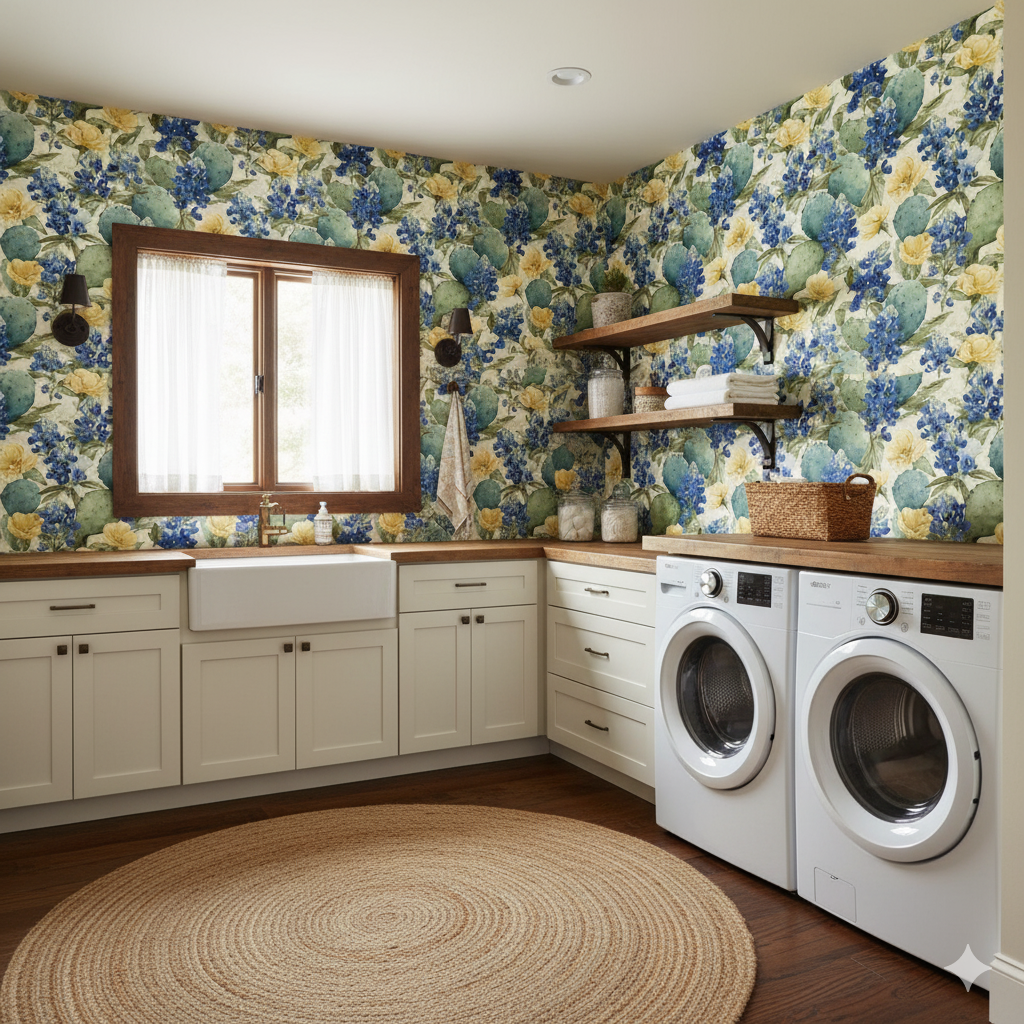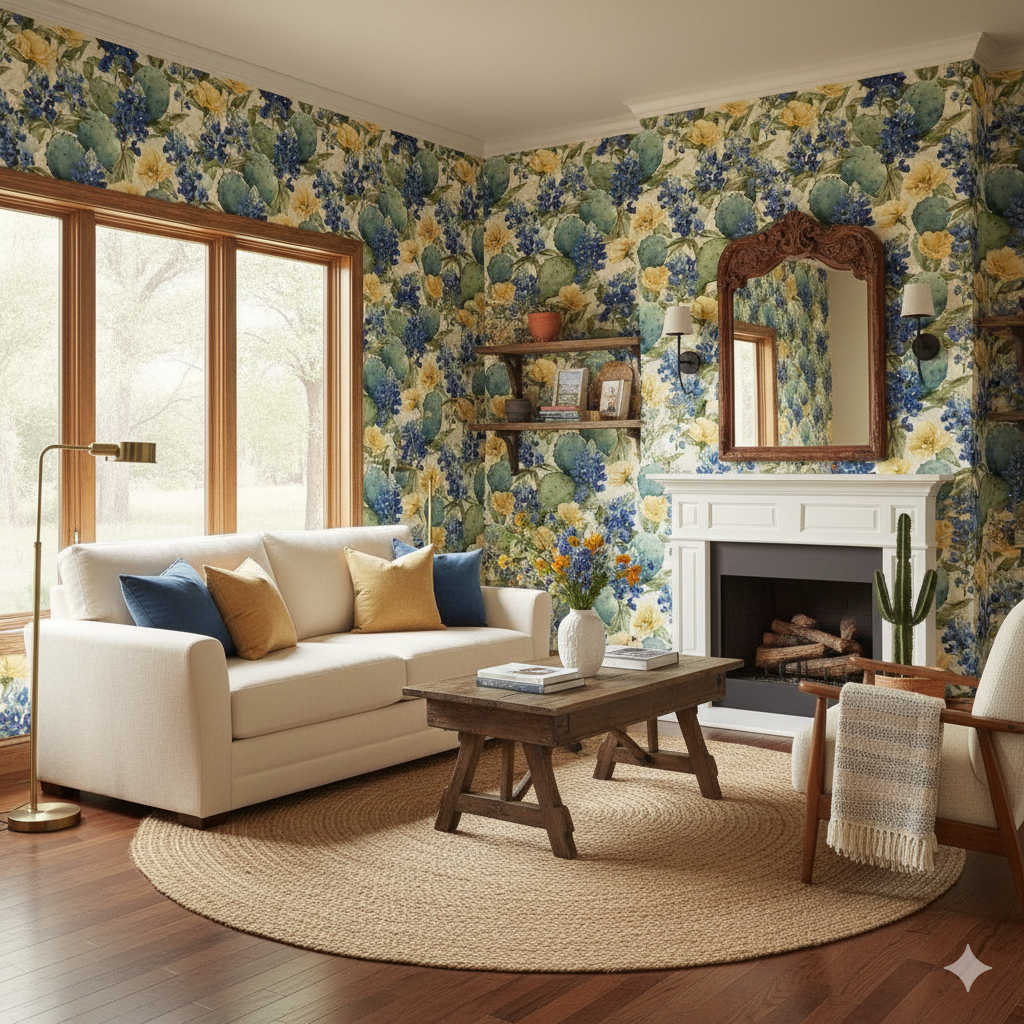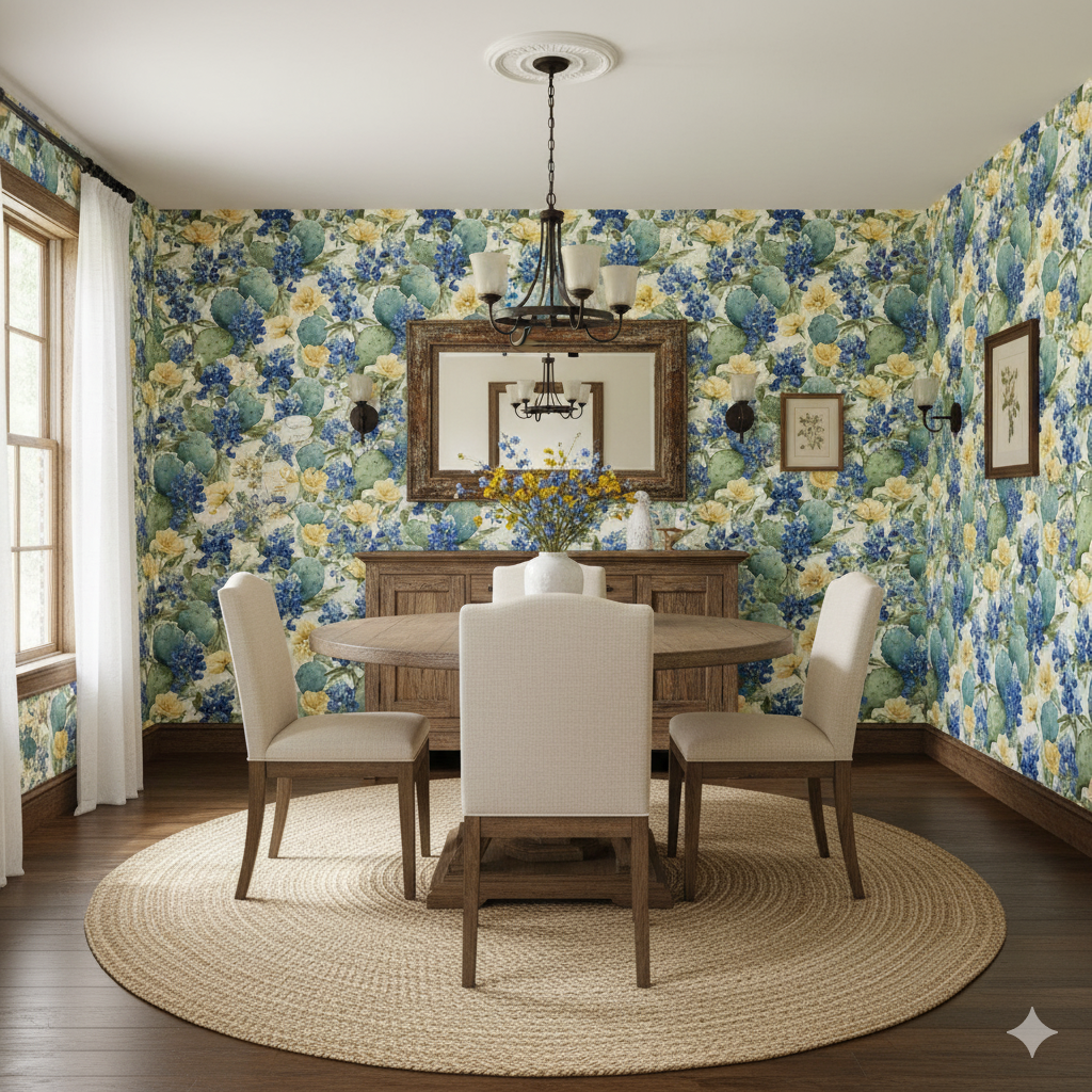 Inspired by Texas landscapes, this wallpaper combines prickly pear cacti in muted greens with bold splashes of cobalt and indigo bluebonnets, softened by sunny yellow blooms. The painterly rendering feels both wild and refined, capturing the rugged beauty of the desert while retaining an approachable elegance. This design would shine in Southwestern homes, ranch-style interiors, or creative studio spaces where regional character and natural vibrancy matter. Its appeal extends to those seeking cactus wallpaper, Texas bluebonnet designs, or Southwestern floral patterns with an authentic flair.