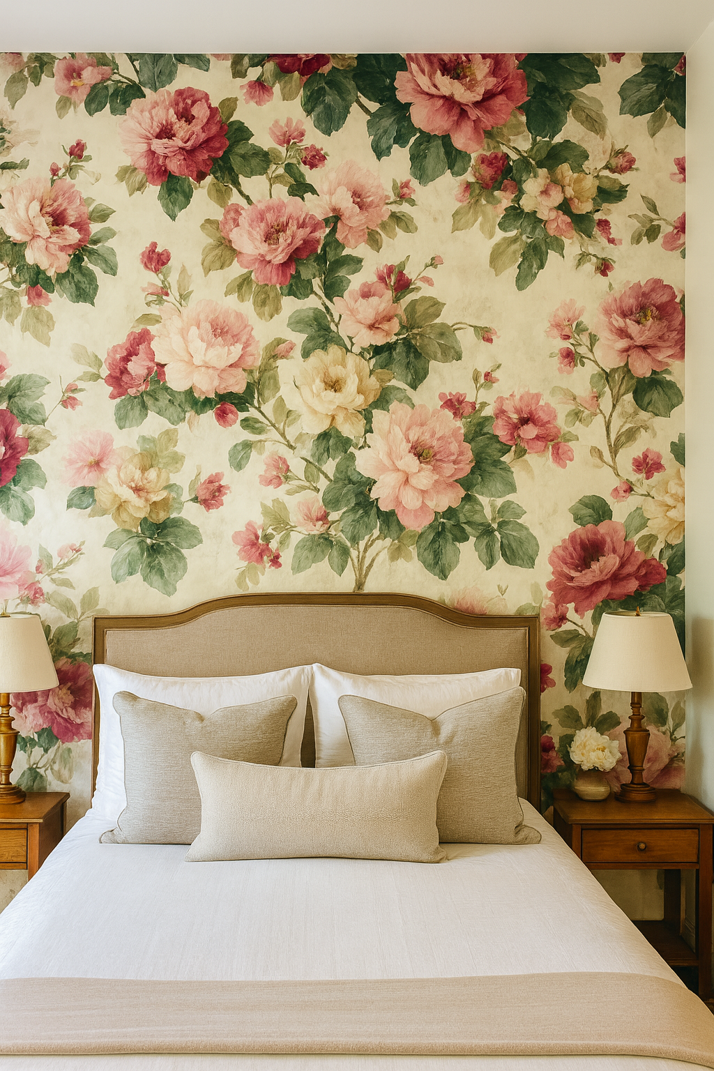 Blush Bloom Ballet is a lavish explosion of vintage charm, showcasing clusters of full-bloom peonies and roses in painterly strokes of blush pink, creamy ivory, and burgundy red. Set against a soft ivory backdrop with muted green foliage, this wallpaper brings classic elegance and romantic florals into any space. Ideal for feature walls in bedrooms, powder rooms, or Victorian-inspired parlors, this floral wallpaper is perfect for anyone craving a cozy yet sophisticated floral flourish.