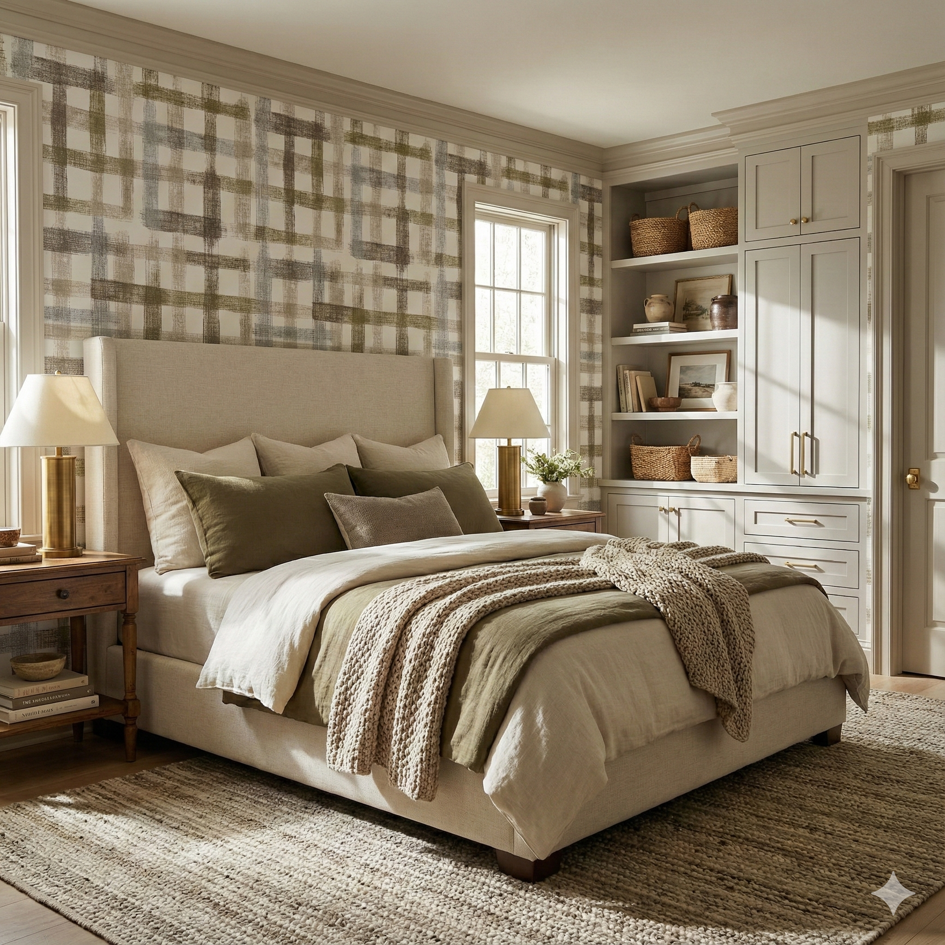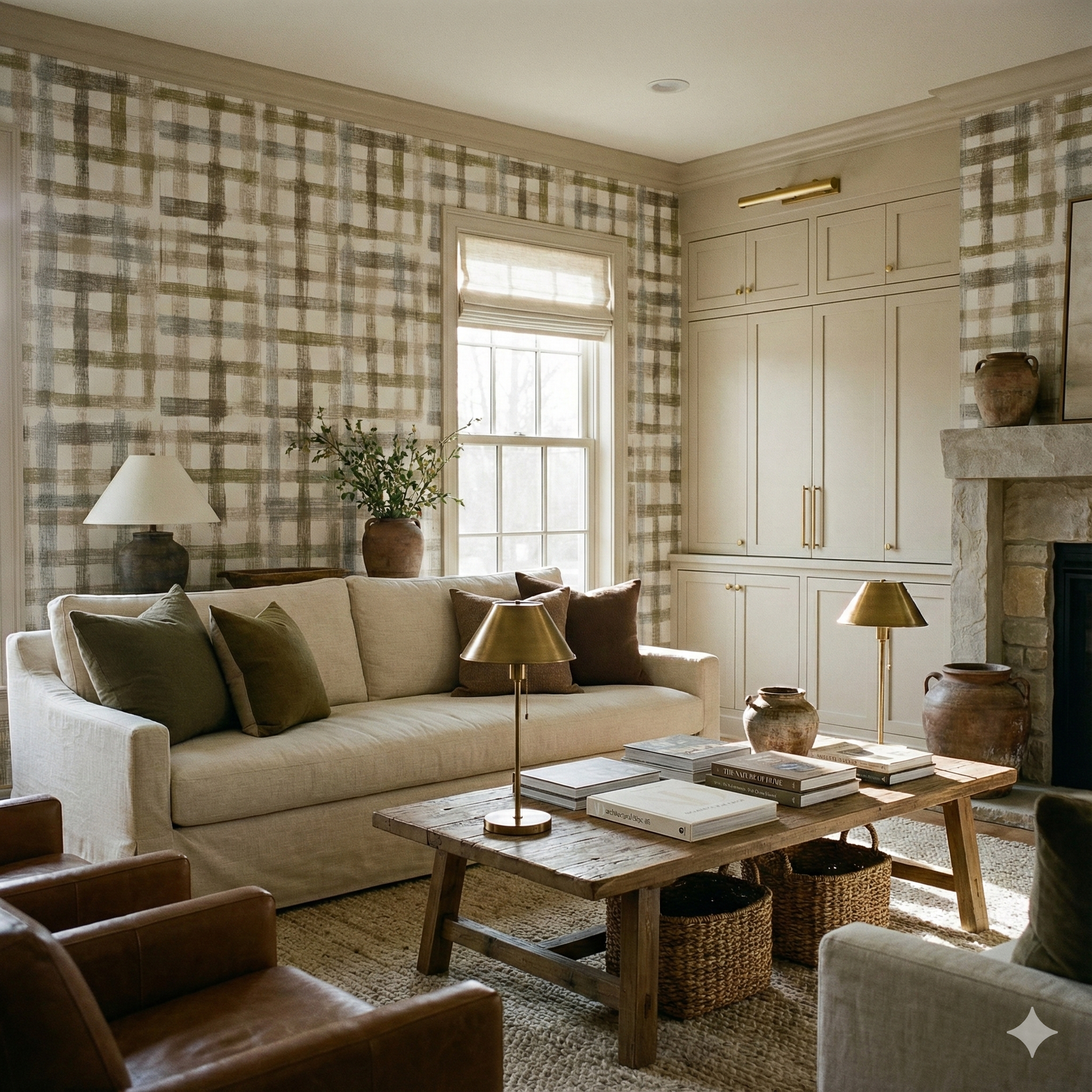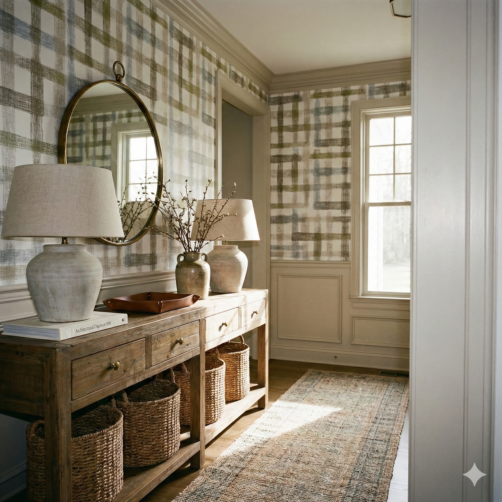 Brackenhold Check reimagines a classic grid through layered, painterly strokes in sage, stone gray, olive, khaki, and parchment. Each band is textured with cross-hatch marks that feel hand-brushed rather than digitally engineered, giving the pattern warmth and depth. The neutral palette keeps it grounded, while the subtle irregularity in the lines adds character and approachability. This wallpaper fits a wide range of interiors: farmhouse kitchens, Scandinavian living rooms, transitional bedrooms, laundry rooms, or modern cottages that want pattern without overwhelming color. Brackenhold Check works beautifully with natural wood cabinetry, cream paint, soft upholstery, and woven baskets—balancing structure with softness.
