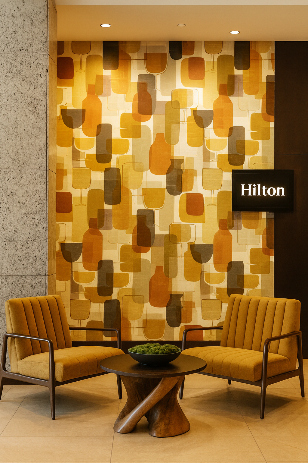 Cabernet Collage is a modern mashup of abstracted wine culture. With stylized overlapping silhouettes of bottles, wine glasses, and tumblers in amber, ochre, charcoal, and rust hues, this retro-mod wallpaper nods to mid-century design while offering contemporary flair. Excellent for bars, dining areas, or lounge walls, this pattern adds warm sophistication with a splash of vintage cocktail chic.