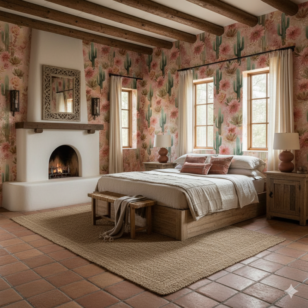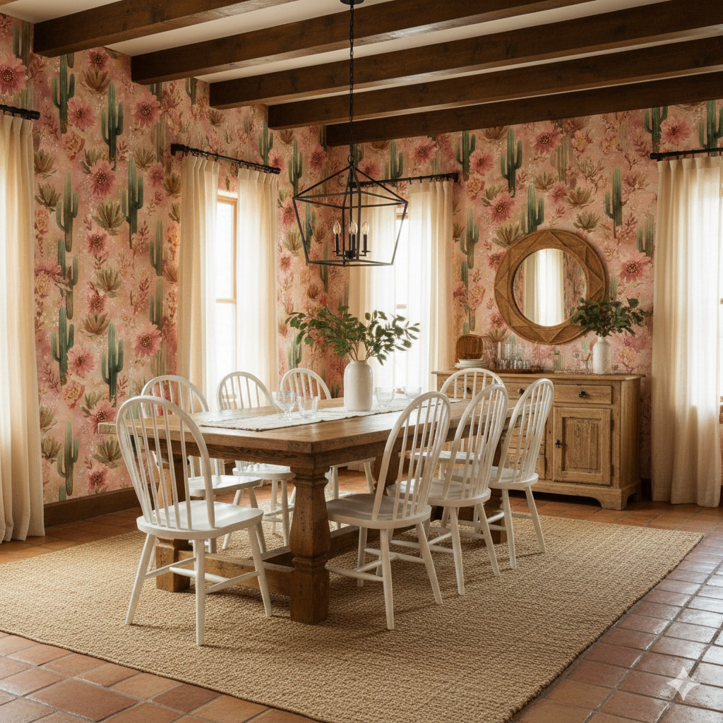 Towering watercolor saguaros stand tall among desert succulents, their forms softened by bursts of pink cactus flowers in full bloom. The sandy blush background gives the design a sunlit, romantic feel while still celebrating the rugged resilience of desert plants. Ideal for nurseries, garden rooms, or eclectic living spaces, this wallpaper captures the beauty of the Southwest in spring. It complements terracotta floors, rattan accents, and earthy clay pottery, bringing a fresh, whimsical desert vibe indoors.