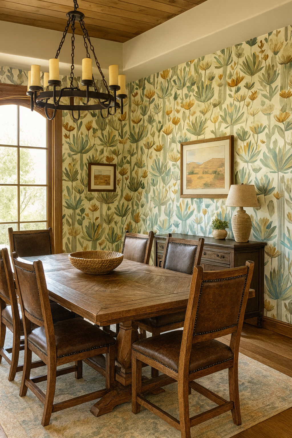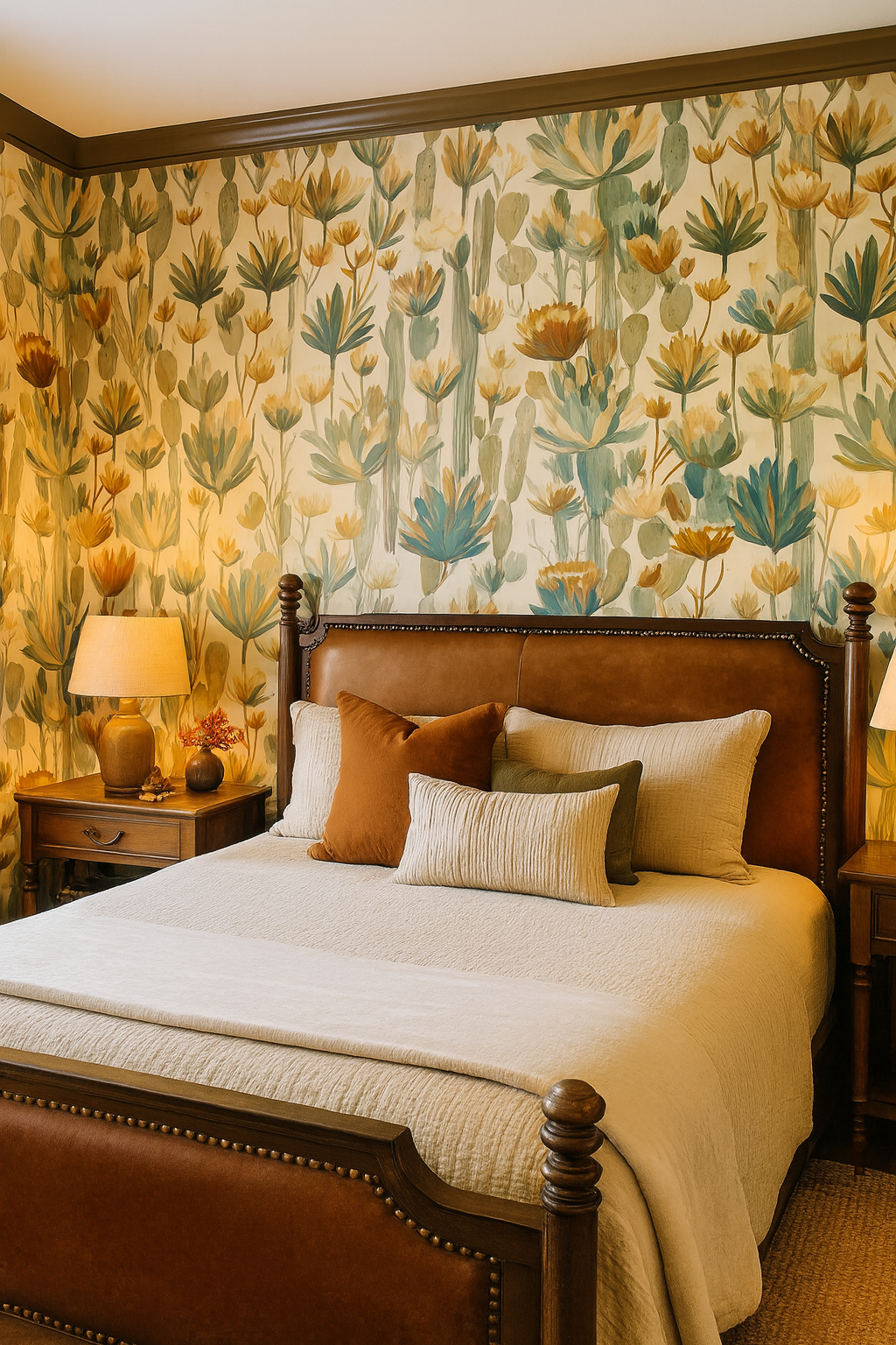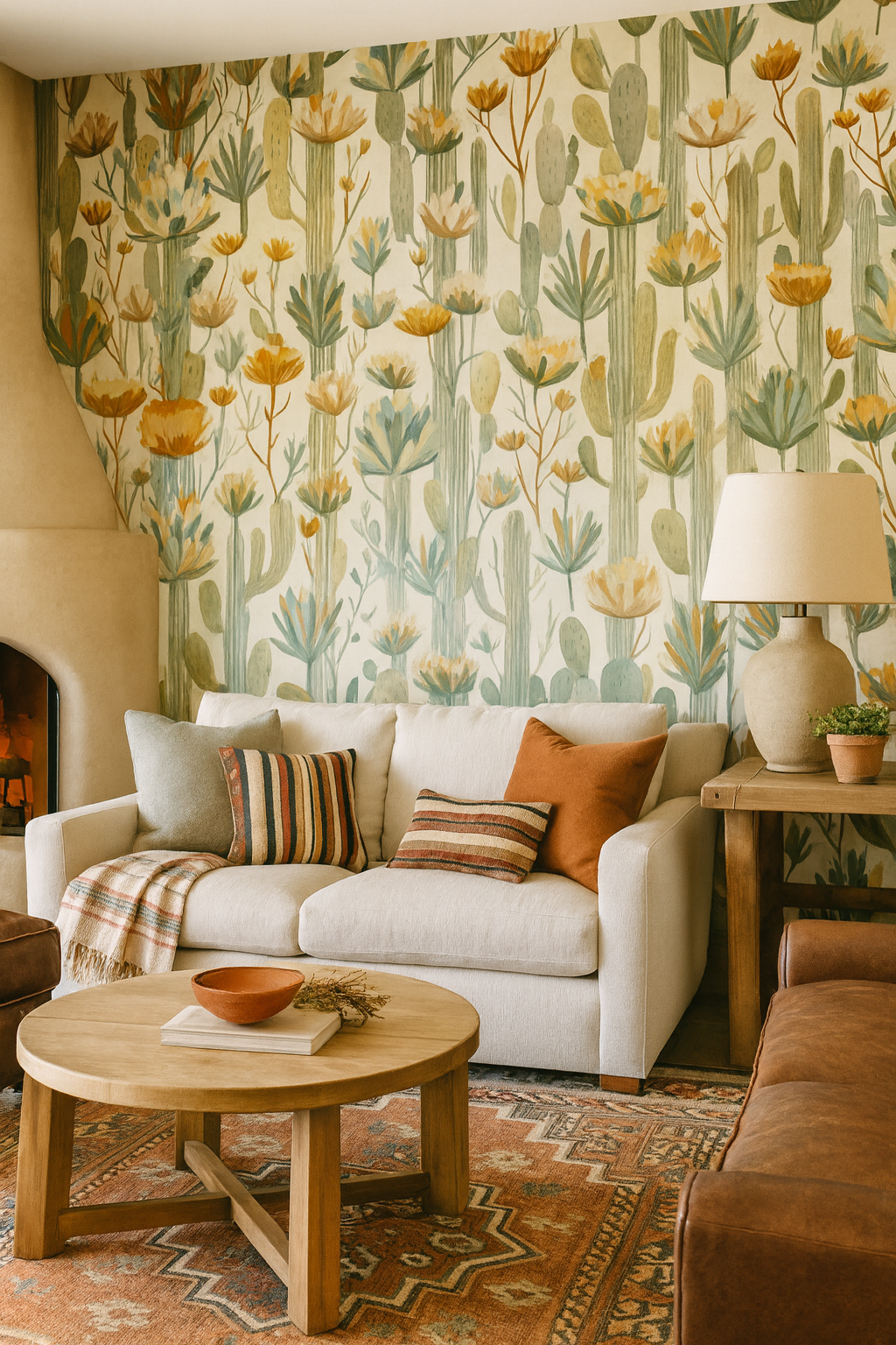 “Cactus Chorus” brings the serene beauty of the desert bloom to life in a botanical symphony of succulents, cacti, and yucca blossoms. Rendered in delicate earth tones—sage, soft peach, golden ochre, and muted teal—this pattern feels both contemporary and timeless. The layered illustrations provide depth while retaining an airy, minimal aesthetic. Perfect for sunrooms, entryways, or eco-modern interiors, this wallpaper offers a calm oasis with a warm, organic soul.