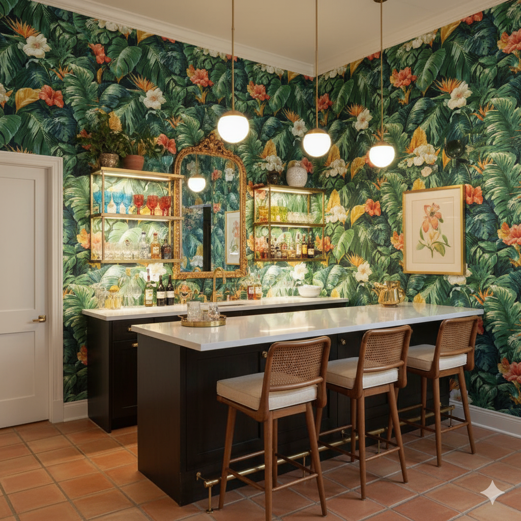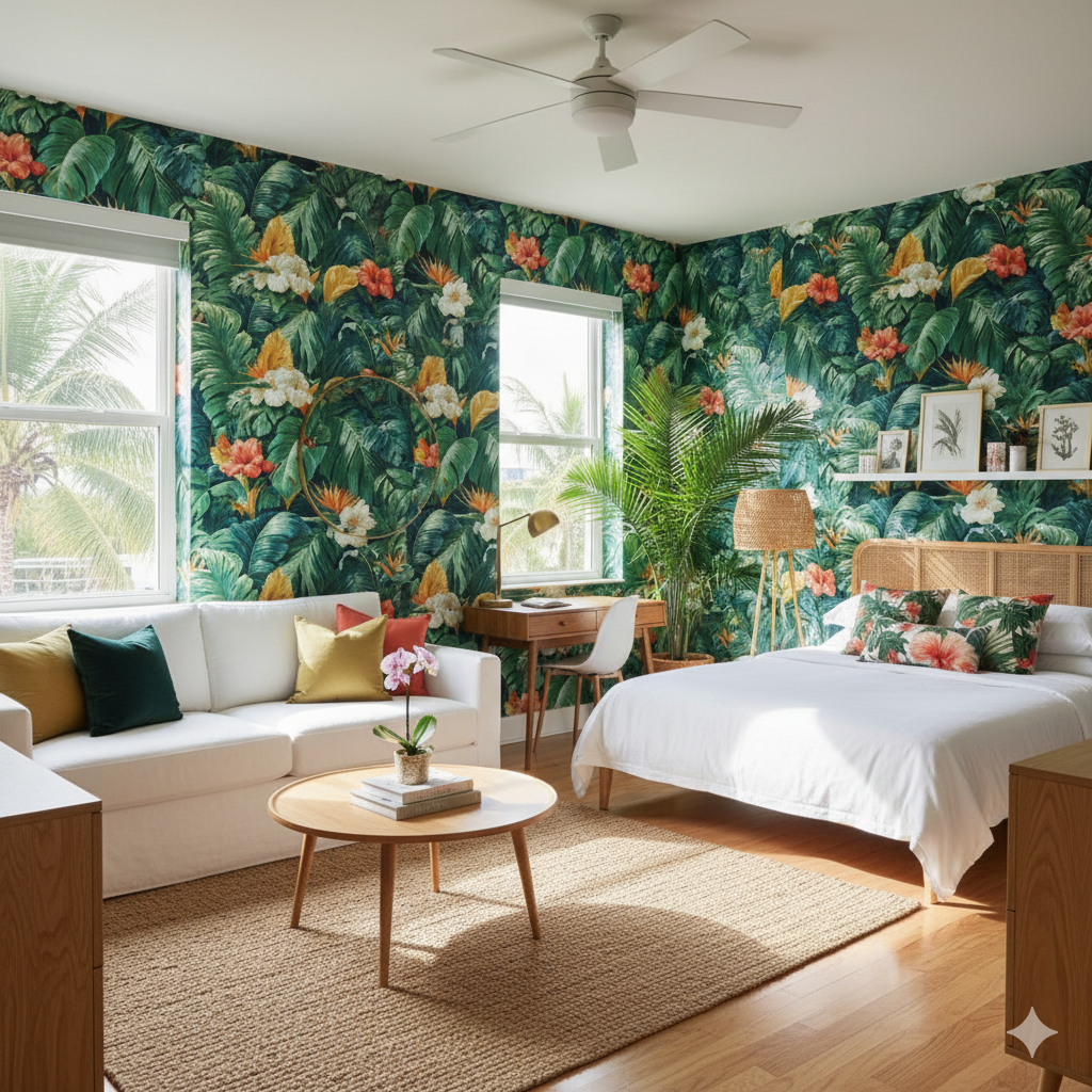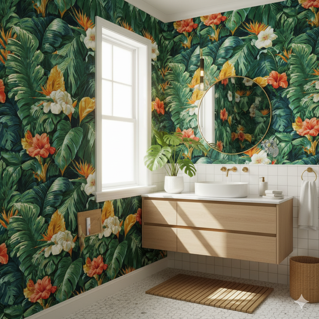 Dense tropical foliage comes alive with hibiscus blooms in coral red, buttery yellow, and creamy white nestled among broad banana and monstera leaves. The pattern is bold, lush, and dramatic—perfect for creating a vacation-like atmosphere year-round. Ideal for accent walls in living rooms, cabana-style bars, or outdoor-inspired dining spaces, this wallpaper brings an exotic vibrancy. Its layered greens and saturated florals pair seamlessly with rattan, bamboo, and warm-toned woods, making it a go-to for coastal and tropical-inspired interiors.