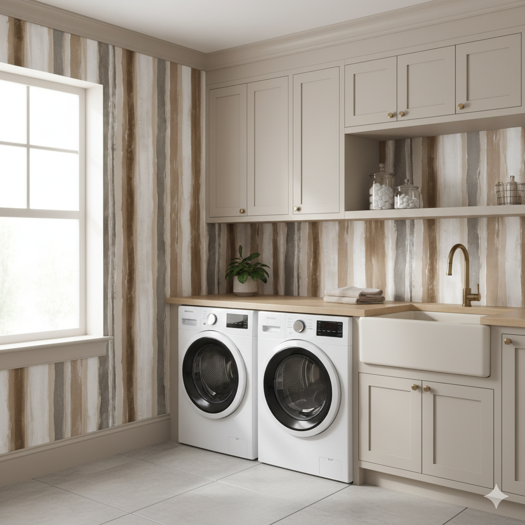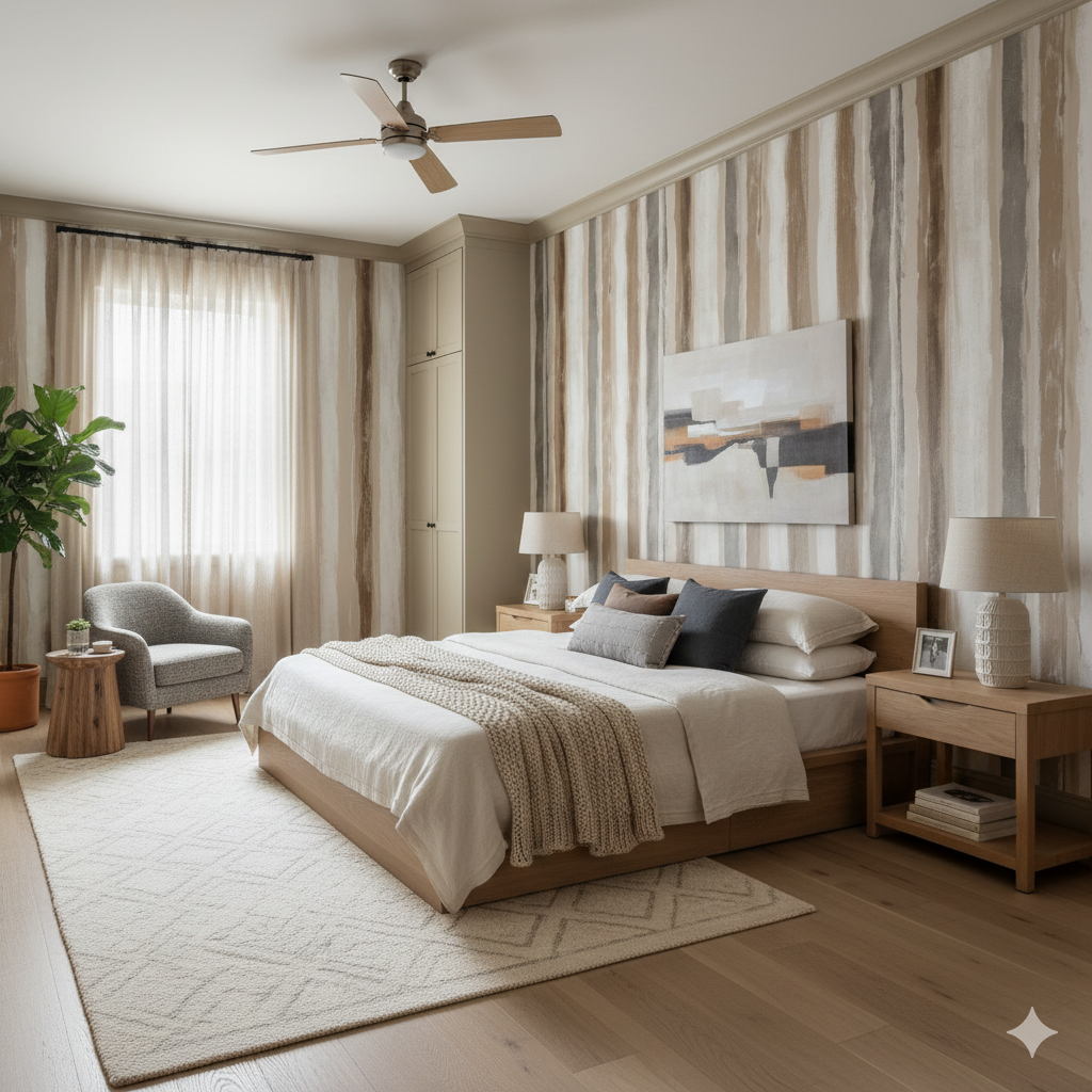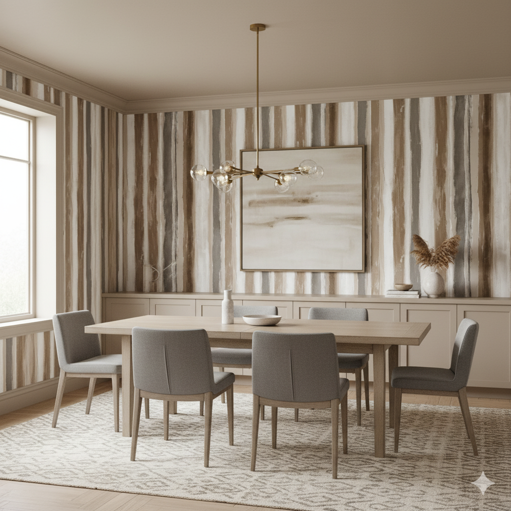 Warm, organic, and full of painterly charm, Canyon Wash celebrates natural tones through hand-brushed vertical stripes. Layered strokes of sandstone, ivory, taupe, and clay mimic the grain of weathered earth and desert cliffs. Each stripe feels tactile and authentic, lending a casual artistry that’s perfect for bohemian, coastal, or southwestern spaces. This wallpaper brings a feeling of movement and light — especially in rooms with warm flooring and natural textures. It’s the ideal bridge between structure and softness, naturalism and refinement.