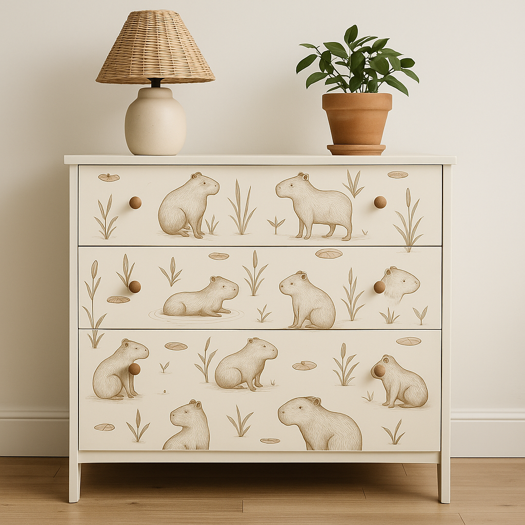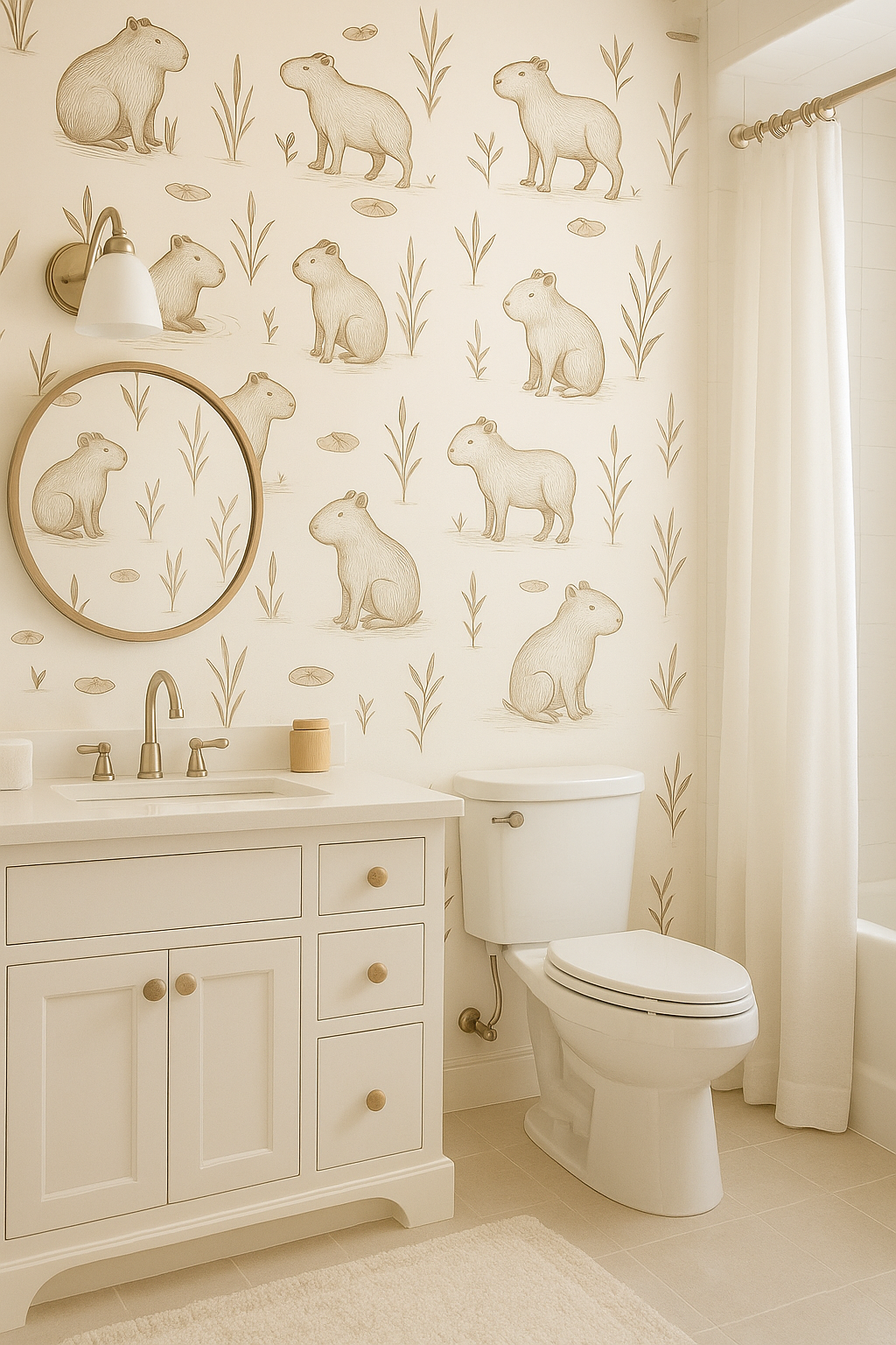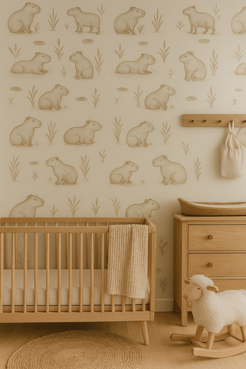 Capybara Club Wallpaper brings playful charm to your walls with an adorable parade of capybaras lounging amidst tropical foliage and water lilies, illustrated in soft neutrals and earthy greens. This whimsical, lighthearted design is perfect for nurseries, kids’ rooms, playrooms, or eclectic living spaces. A must-have for customers searching for capybara wallpaper, whimsical animal wall coverings, playful nature wallpaper, or modern maximalist wallpaper with personality.
