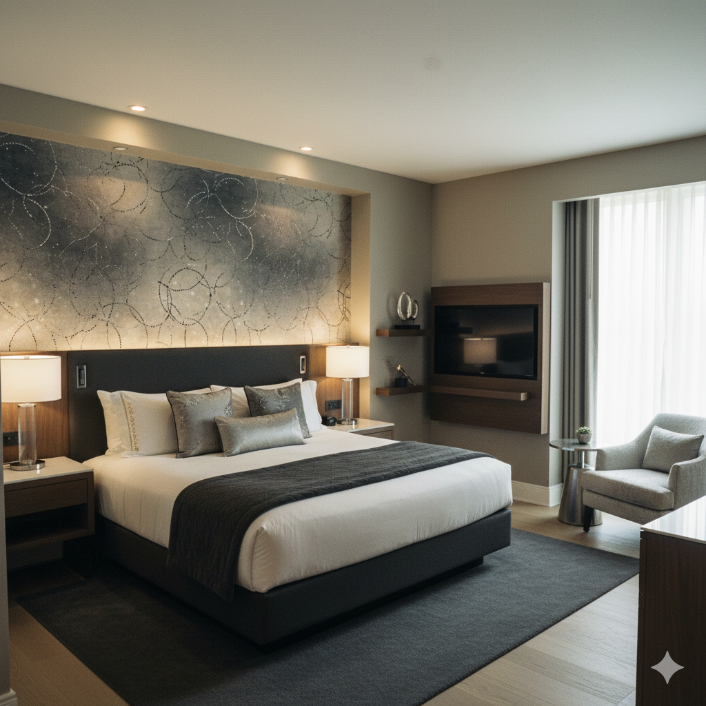 Carbon Halo unfolds like celestial cartography — looping dotted rings drift across a storm-washed gradient of graphite, sand, and ash. The effect is smoky, mysterious, and quietly glamorous. Each arc catches light differently, evoking constellations traced across fogged glass. This wallpaper suits moody lounges, bedrooms, or transitional spaces that call for depth and intrigue. Carbon Halo blurs the line between industrial and ethereal, wrapping interiors in texture, shadow, and an understated shimmer of cosmic sophistication.