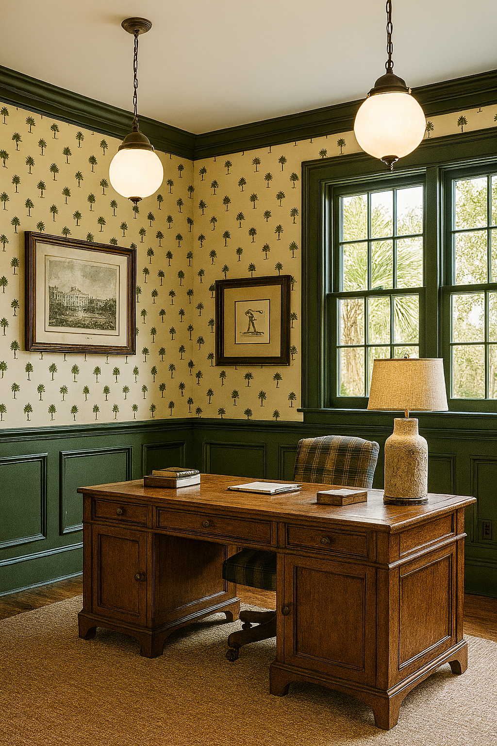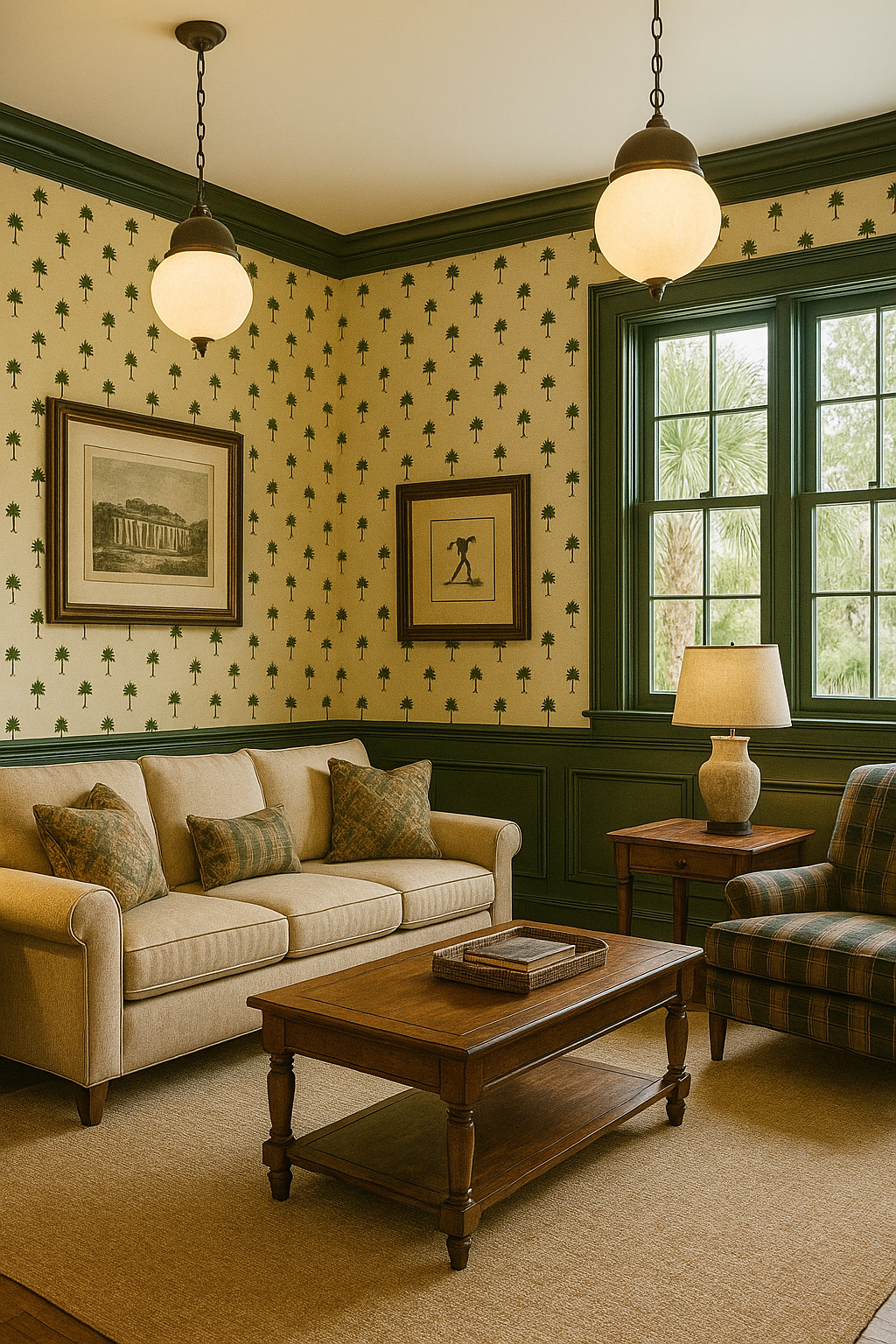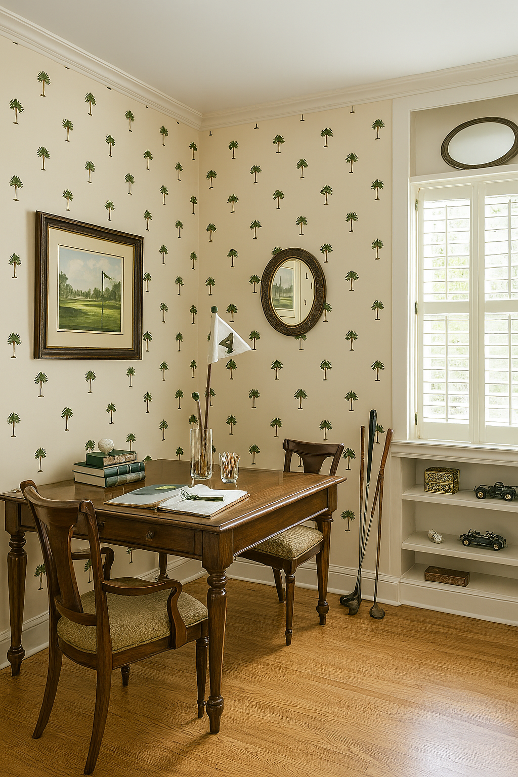With a block print feel and clean repetition, "Carolina Palms" features single palmetto trees evenly spaced across a creamy linen background. The faded ink look gives it a screen-printed quality, perfect for Southern modern design. Use this wallpaper in beach homes, coastal kitchens, or laid-back laundry rooms that want a subtle, charming nod to the Lowcountry.