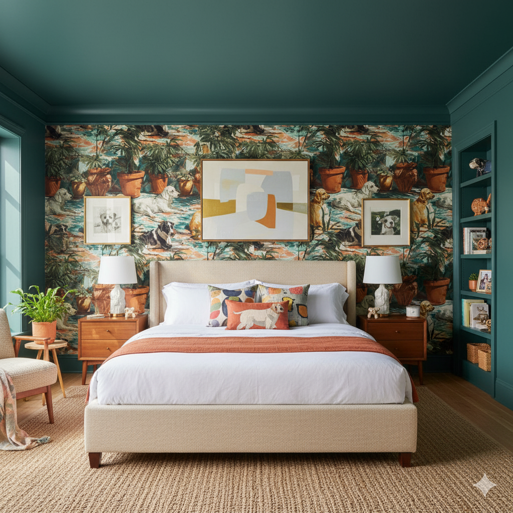 Evoking the warmth of a Mediterranean courtyard, Casa Solana brings together painterly dogs lounging among terracotta pots and sun-washed tile. The palette—teal, rust, sand, and olive—radiates light and life, making it ideal for eclectic interiors, garden rooms, or boutique hotels seeking narrative design. Every brushstroke feels tangible, from the dappling of sunlight to the relaxed posture of the dogs basking in its glow. Casa Solana transforms a wall into a tranquil escape—equal parts nostalgia, artistry, and summer afternoon.
