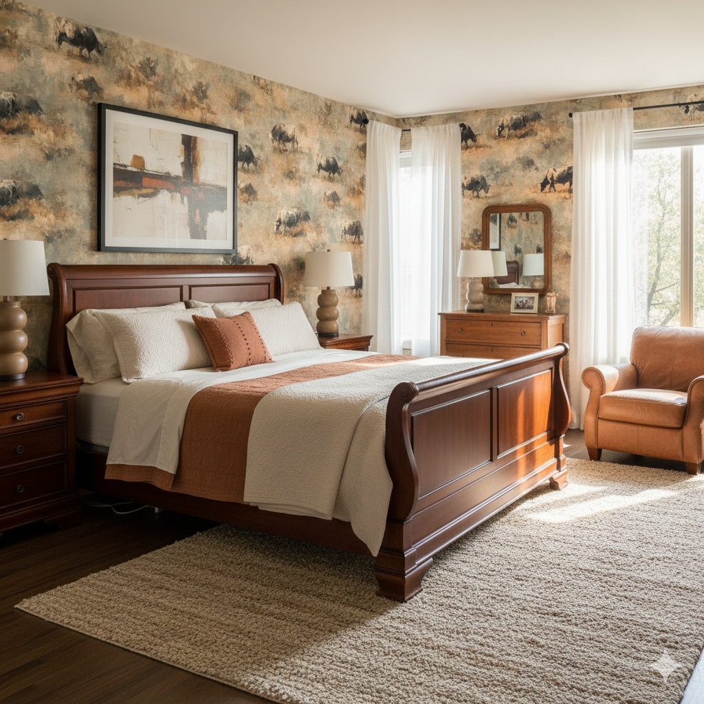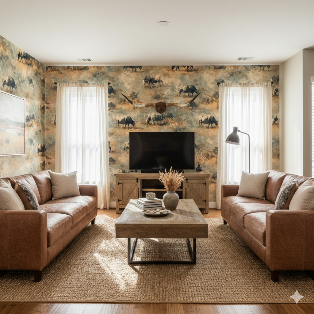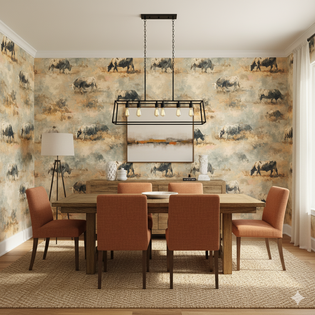 This painterly scene depicts herds of cattle grazing across a soft, impressionistic brushland landscape. The muted earth tones of sage, wheat, and dusty taupe capture the golden light of dusk on the plains. Each cow feels alive within the sweeping strokes, offering a mural-like presence that brings depth and narrative to a space. Ideal for dining rooms, great rooms, or ranch entryways where you want to evoke Western storytelling. The texture of the brushstrokes gives it an oil-painting quality, making it feel more like art than wallpaper.