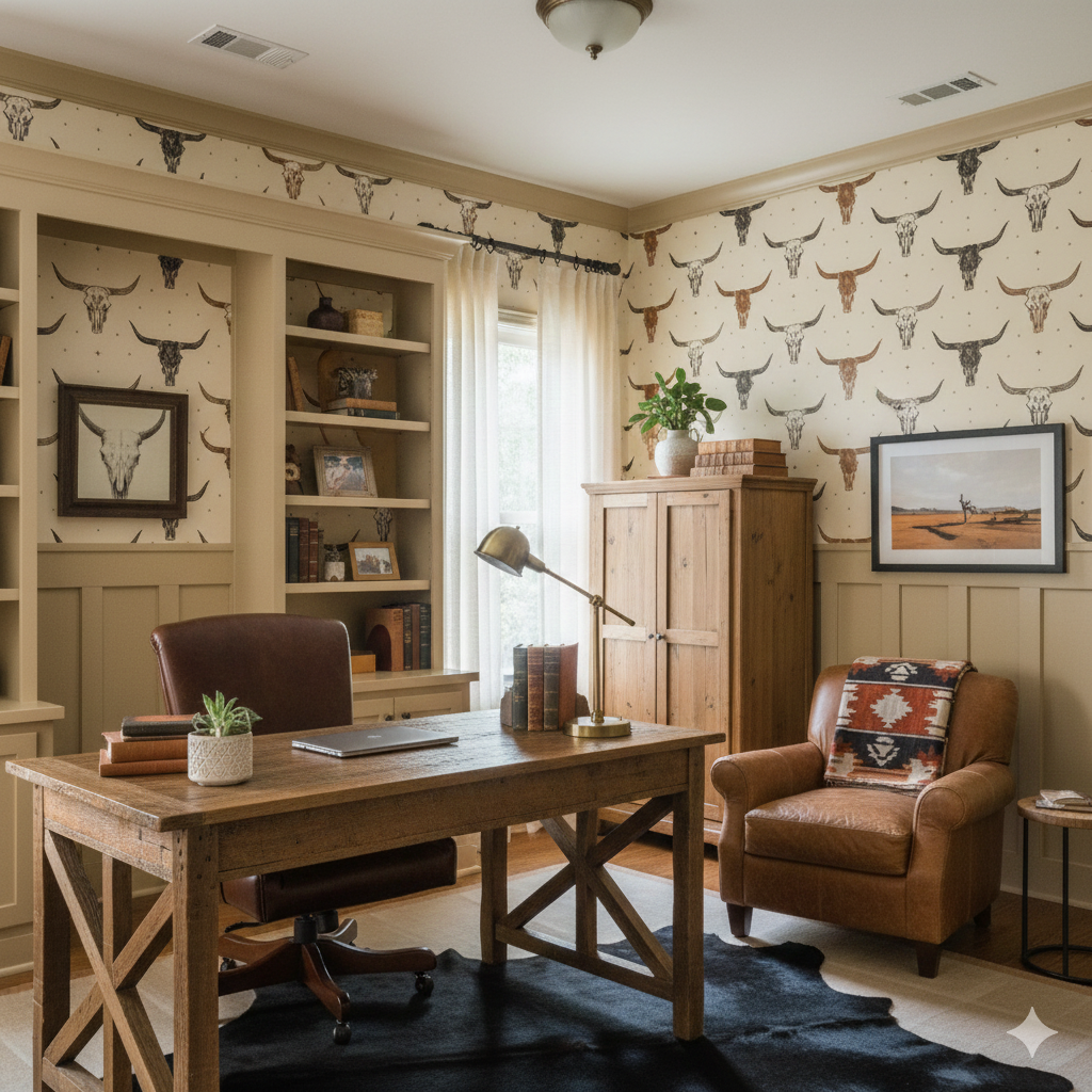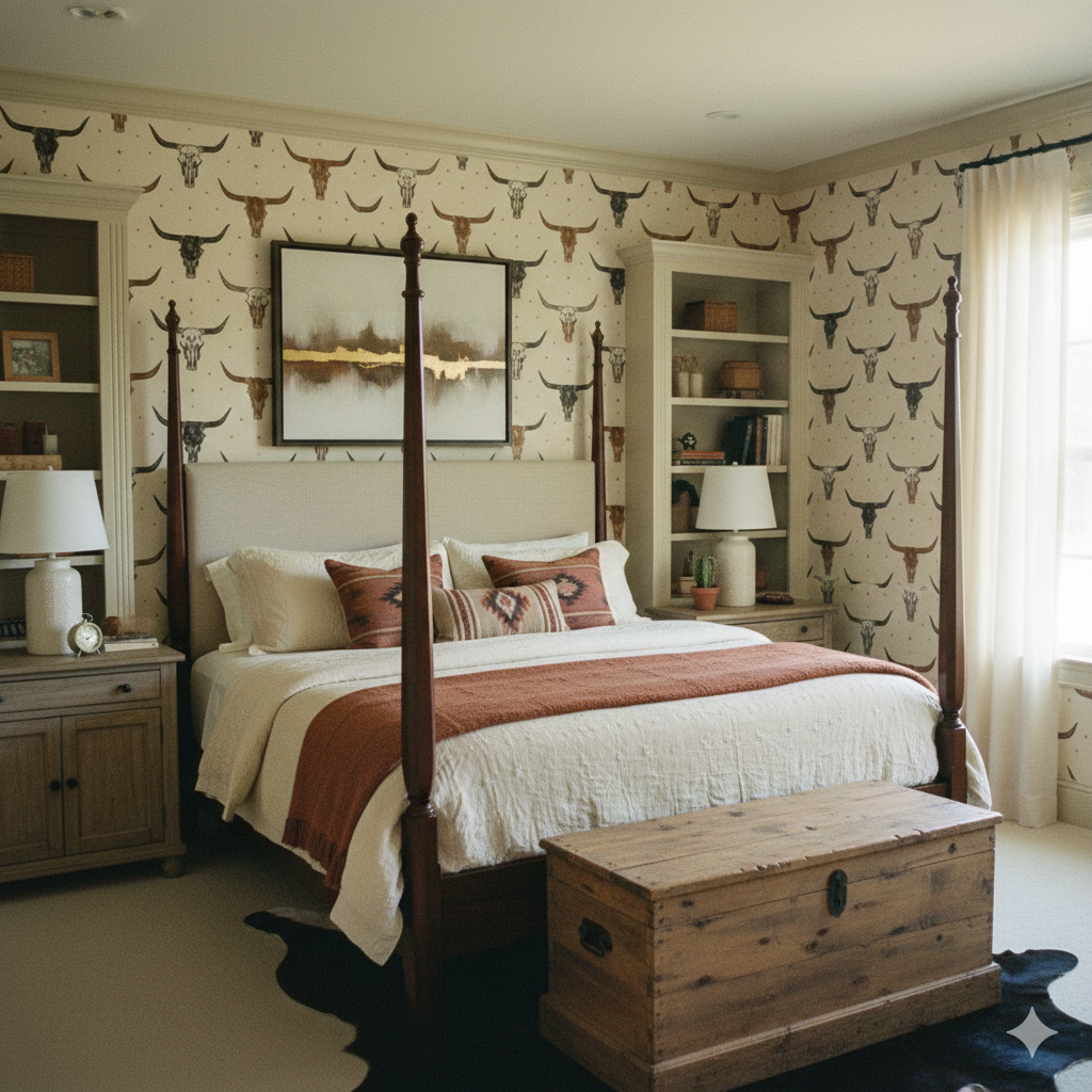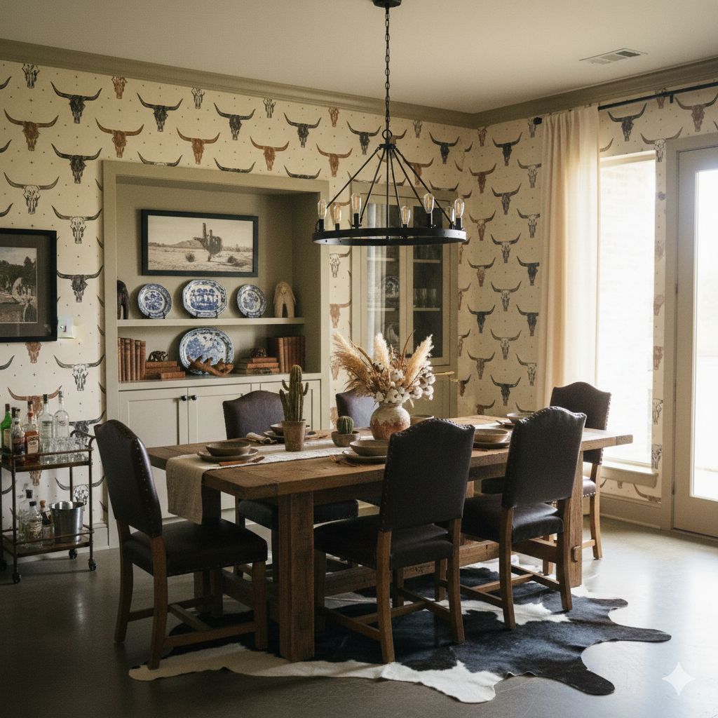 This pattern lines up longhorn skulls in a rhythmic, almost celestial repeat, creating a Western motif that feels more curated than kitschy. Detailed linework in deep charcoal and warm saddle brown is set on a soft, parchment-like ground, with tiny star icons scattered between each skull to echo desert night skies and open rangeland. The spacing is generous, making the artwork feel graphic and elevated rather than busy. This design is perfect for ranch-style homes, bar areas, game rooms, boutique hotels with Western influences, or any space where you want a nod to cowboy culture with a clean, modern edge. It pairs beautifully with leather upholstery, raw woods, and iron accents, adding grit and character without overpowering the room.