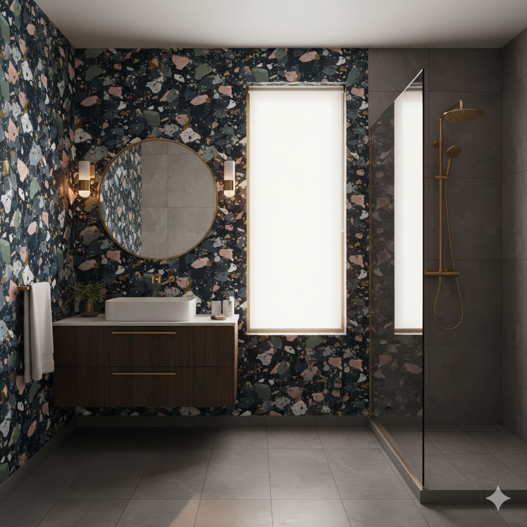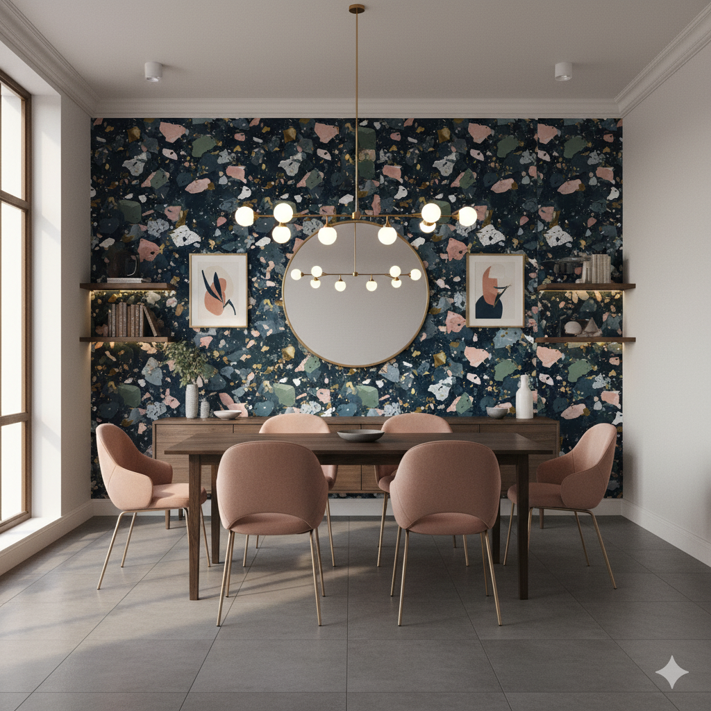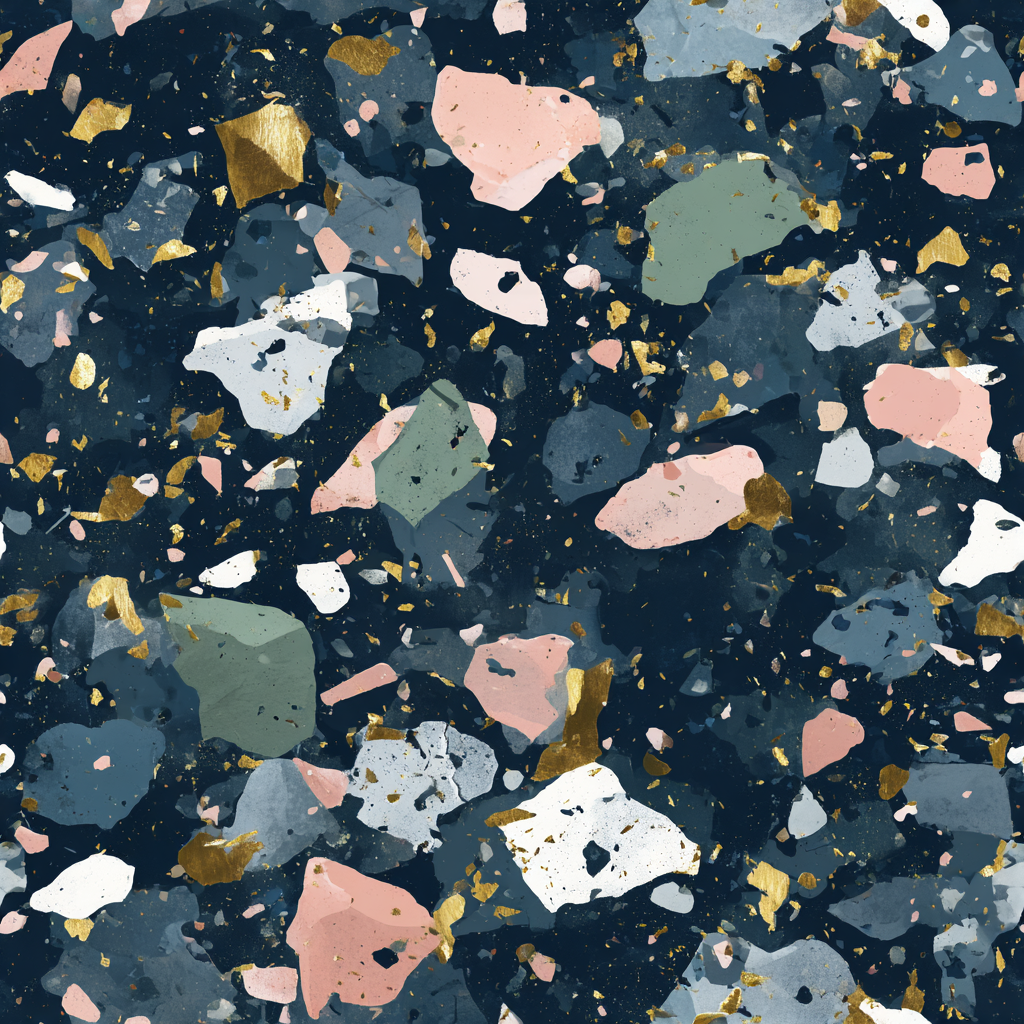 A dramatic statement terrazzo with a cosmic sensibility, Celeste Oro blends deep navy and midnight blue with splintered accents of blush pink, sage green, and pale stone. Golden flecks glimmer like stardust across the fractured composition, giving the impression of marble shards illuminated under moonlight. This wallpaper works beautifully in dining rooms, cocktail lounges, or moody home libraries, where its sense of depth and elegance enhances the atmosphere. The metallic accents make it especially suitable for spaces designed to impress, offering both grounding sophistication and celestial glamour.