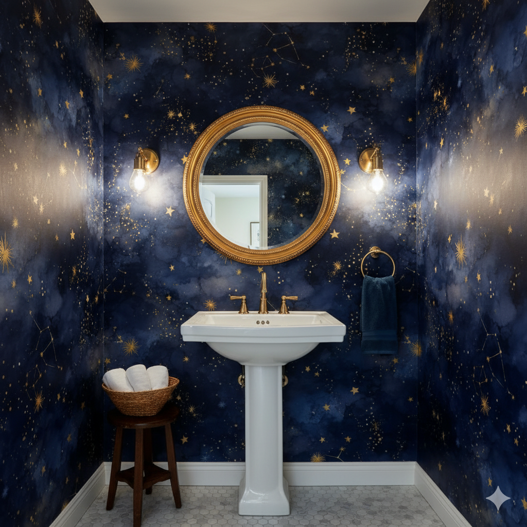 A deep navy backdrop becomes a canvas for constellations and golden starbursts, rendered as if in fine ink. The watercolor texture of the sky adds softness, while clusters of stars gleam in scattered arrangements. The effect is both dreamy and intellectual, like a star chart brought to life. This design is perfect for children’s rooms, observatories, or anyone who wants to bring the romance of stargazing indoors. It feels expansive, turning walls into windows that look out to infinite possibility.