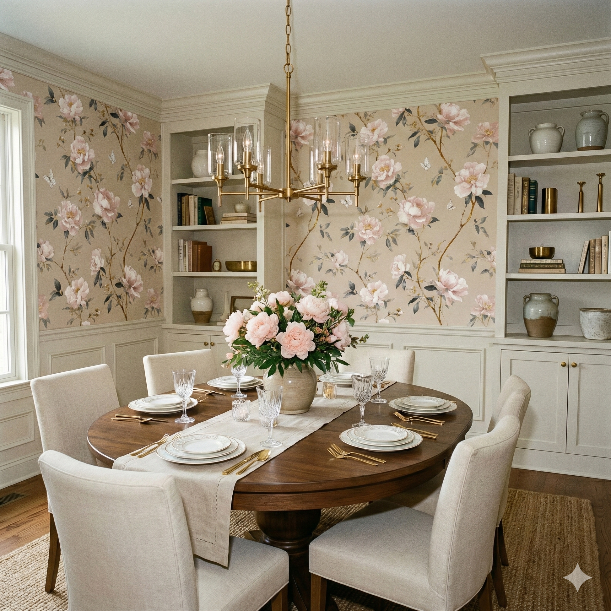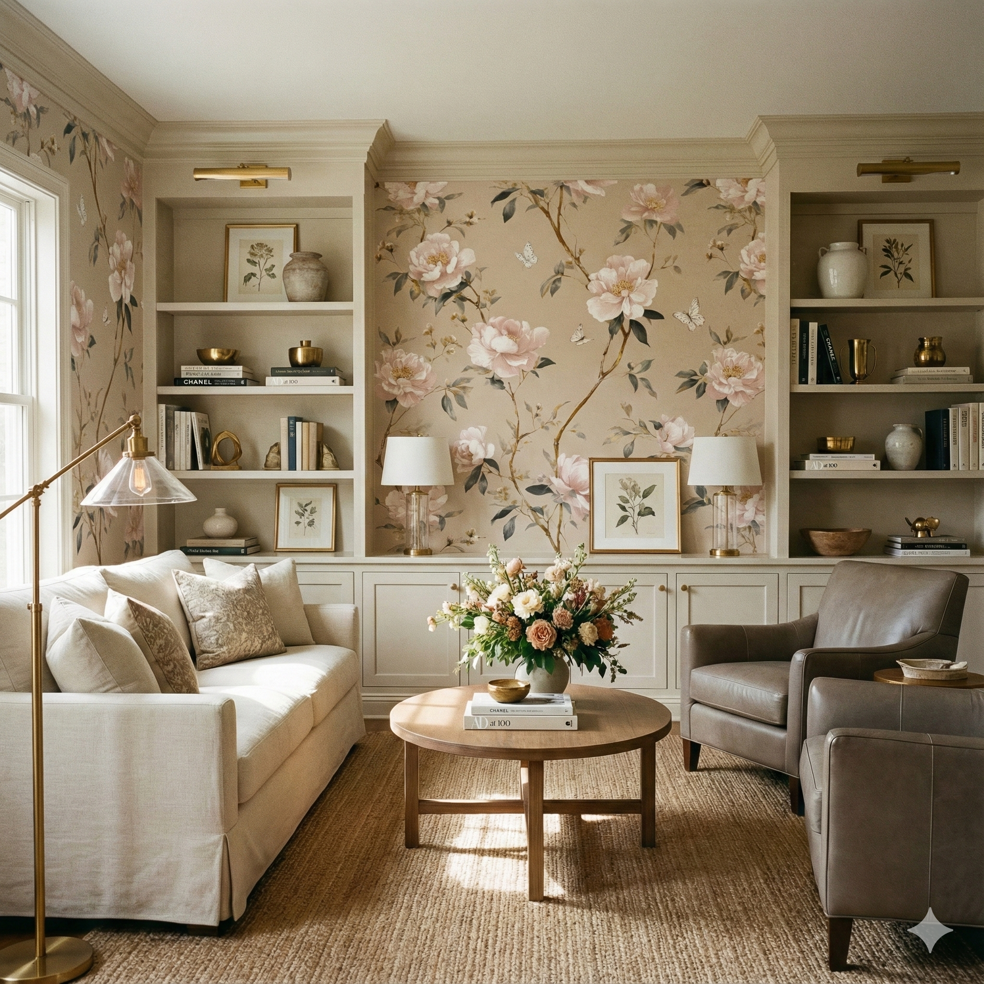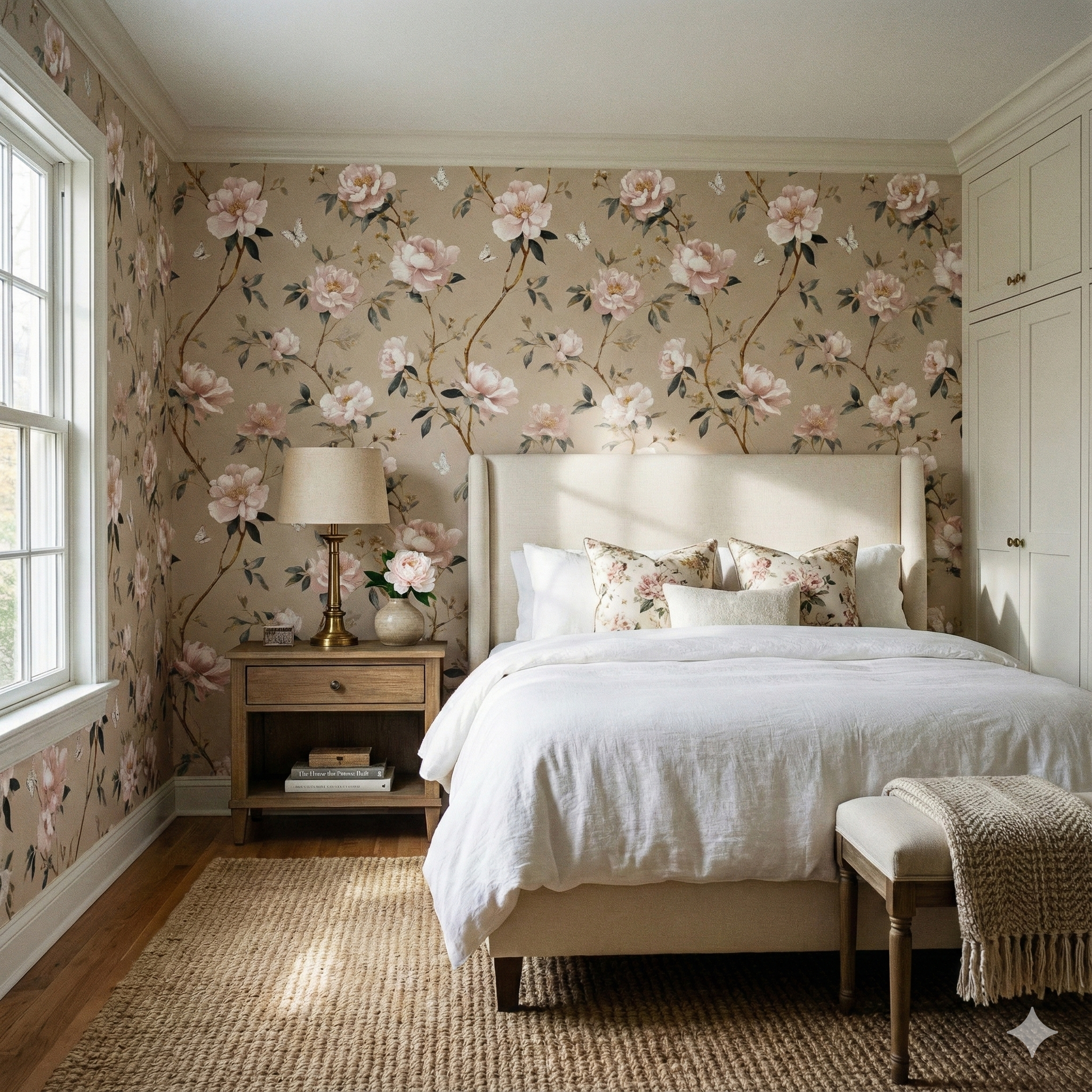 Soft blush peonies drift across a warm champagne-toned ground, creating an airy, romantic aesthetic reminiscent of late-afternoon sunlight glowing through silk curtains. Each petal is painted with a feather-soft translucence, leaning into ivory, warm rose, and pale apricot, while slender botanical branches in muted gold and soft sage weave through the composition. White butterflies flutter between blossoms, adding a gentle sense of movement and springlike optimism. The tone is deeply feminine yet sophisticated, far from overly sweet, making it ideal for bedrooms, nurseries, dressing rooms, boutique hotel suites, or serene reading spaces. The palette complements warm neutrals, natural stone, and brushed gold fixtures, adding quiet luxury without overwhelming a room. Its softness makes even large walls feel gentle and inviting.