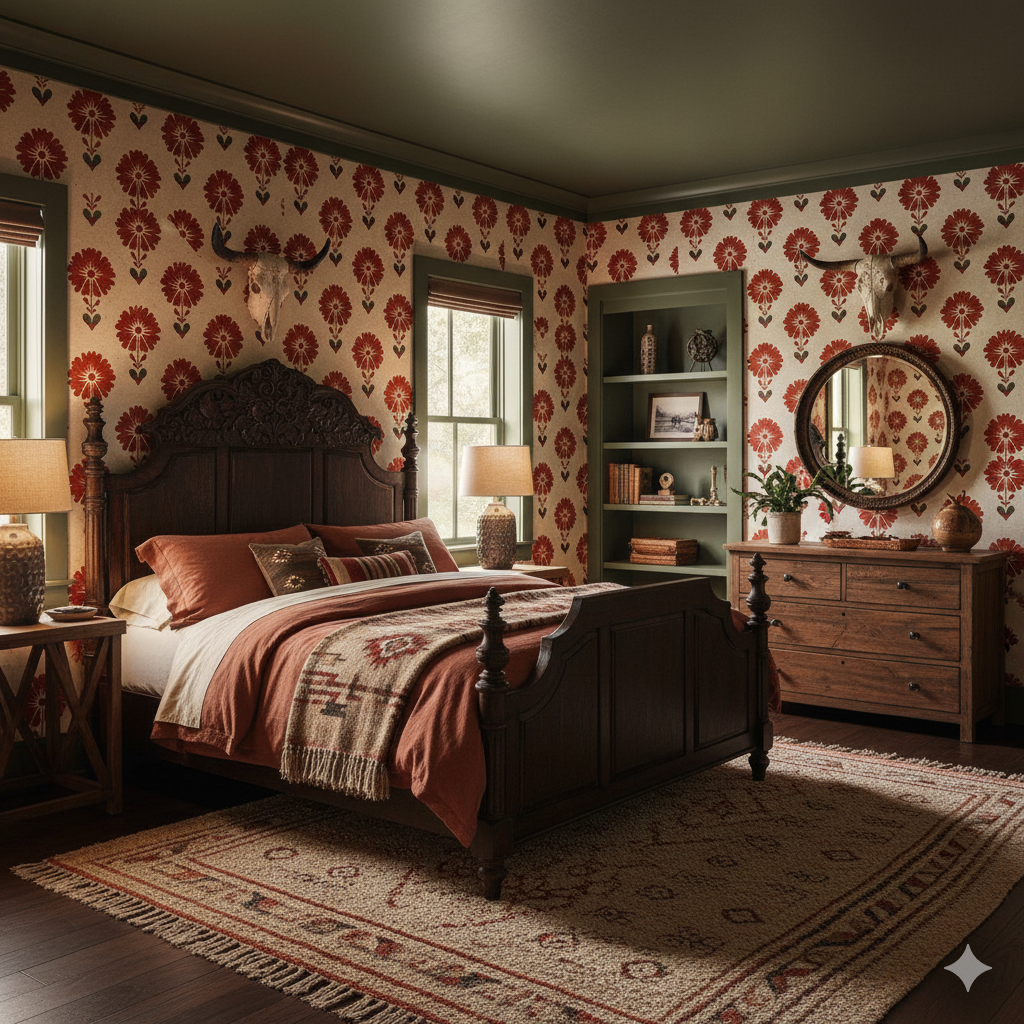 Ciderfolk embodies rustic charm with a folk-art spirit. Red ochre blooms and olive heart motifs are hand-printed against a warm cream base, their imperfect edges lending tactile authenticity. The palette feels sun-aged—earthy, romantic, and full of nostalgia. This pattern feels right at home in kitchens, cozy breakfast nooks, or country-inspired bedrooms, bringing a handcrafted character to modern spaces. It’s a love letter to vintage block printing, aged paper, and the beauty of imperfection.