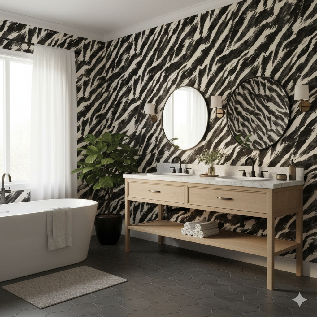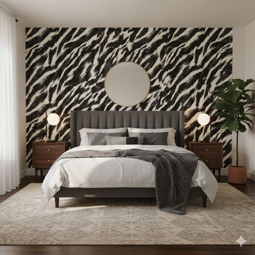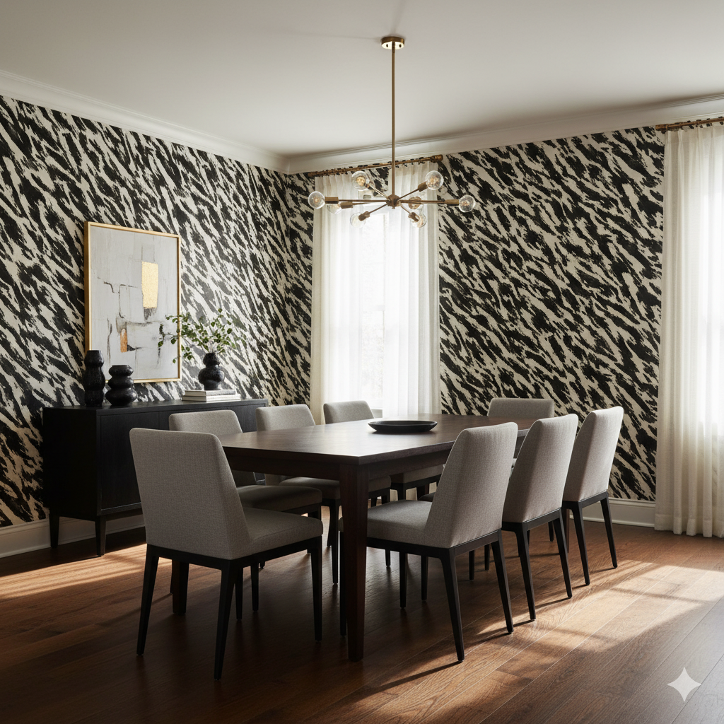 A kinetic reinterpretation of zebra striping, this wallpaper trades traditional precision for an energetic, brushstroke aesthetic. The bold black and gray slashes gallop across an ivory backdrop with painterly confidence, resembling both calligraphic gestures and the wild elegance of untamed herds. Its raw, hand-done quality makes it ideal for modern eclectic spaces, art studios, or adventurous bedrooms. In minimalist interiors, it introduces movement and visual rhythm, while in maximalist schemes, it becomes part of a layered, global-inspired story. When paired with matte black accents or natural textures like raffia and wood, it balances primal energy with refined design.