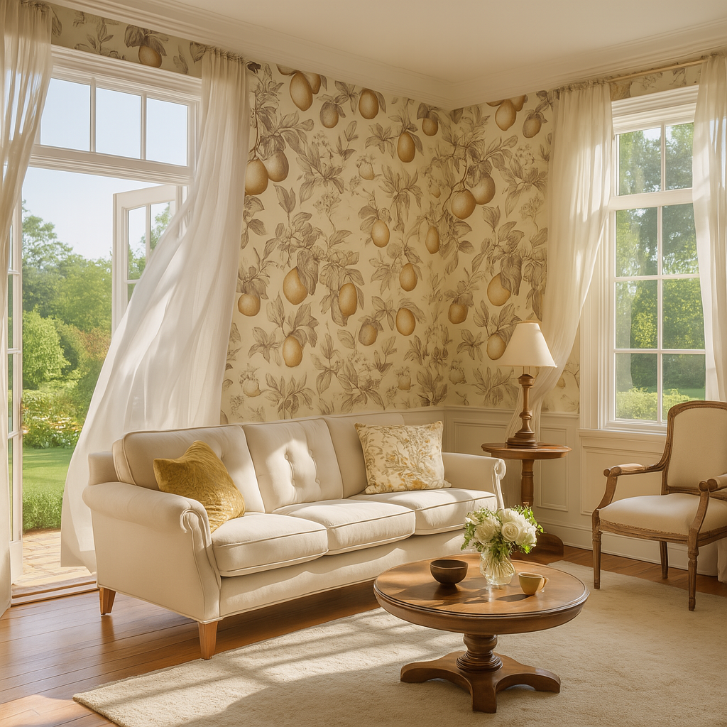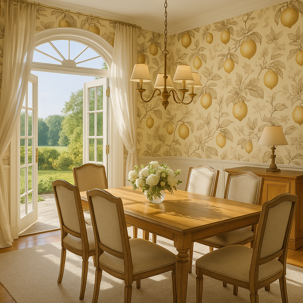 Search terms: lemon toile wallpaper, vintage fruit pattern, French country citrus, etched botanical mural.