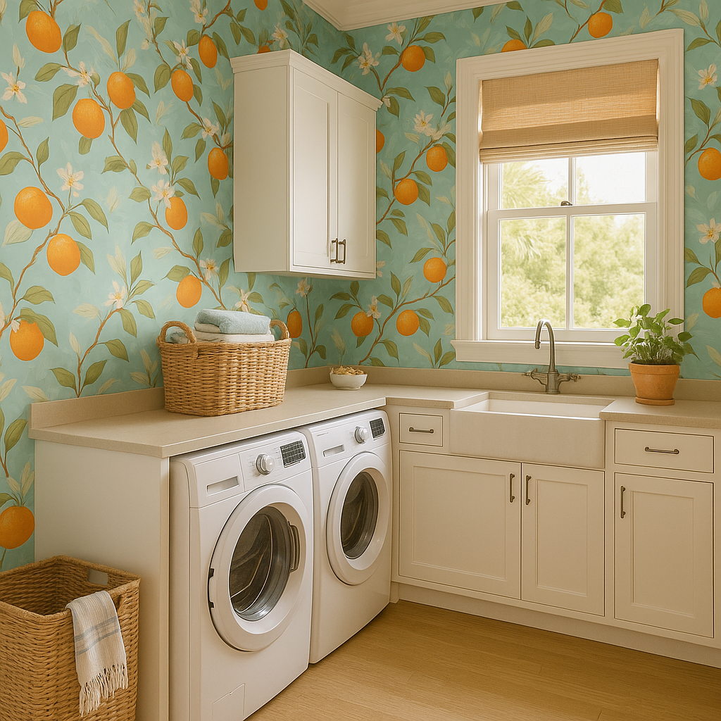 A lively and refreshing wallpaper design featuring hand-painted citrus branches bursting with oranges, delicate white blossoms, and lush green leaves. This pattern brings a bright, Mediterranean-inspired charm to any kitchen or breakfast nook. Ideal for those seeking vibrant fruit wallpaper with a natural, hand-illustrated touch.