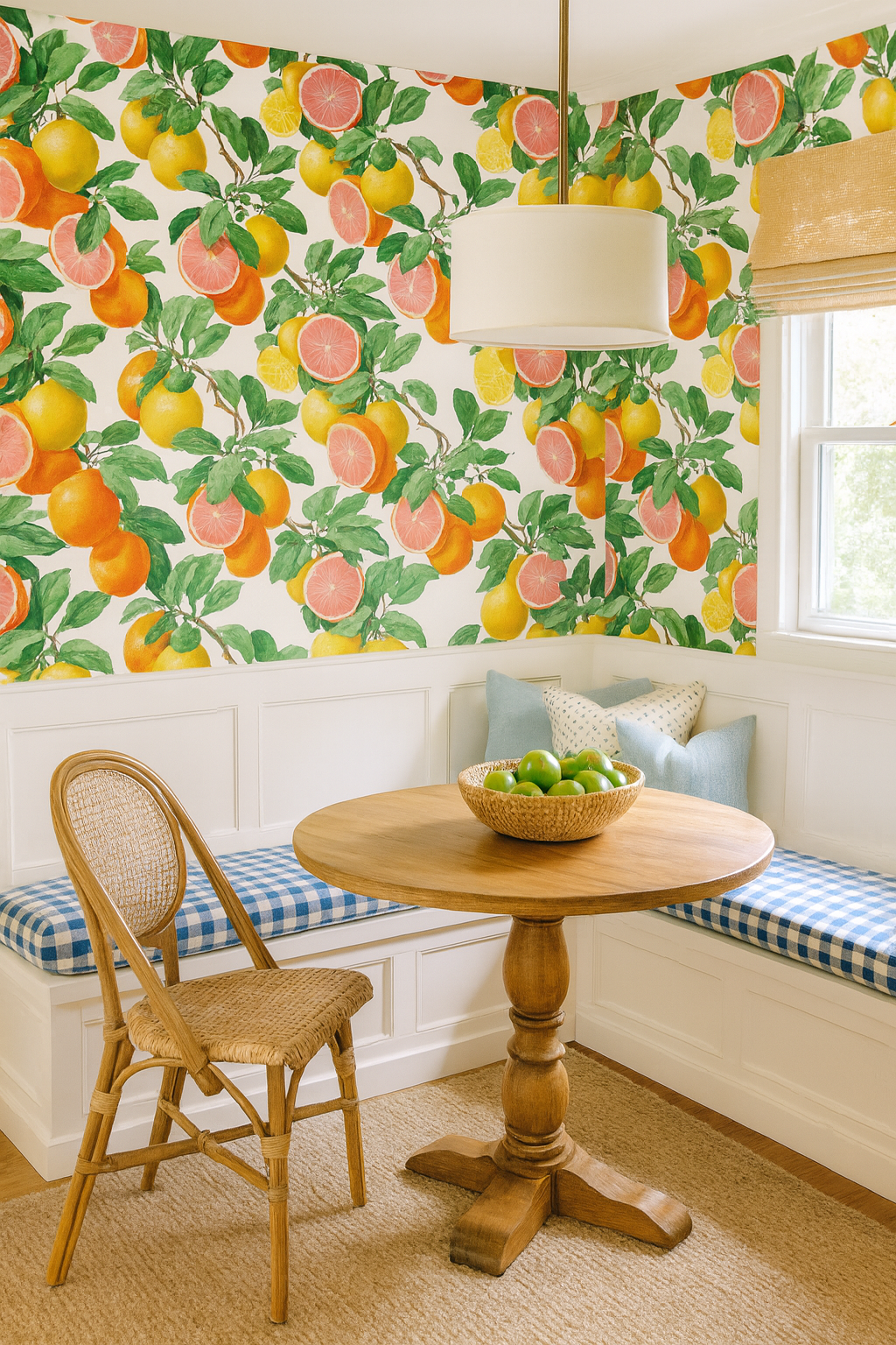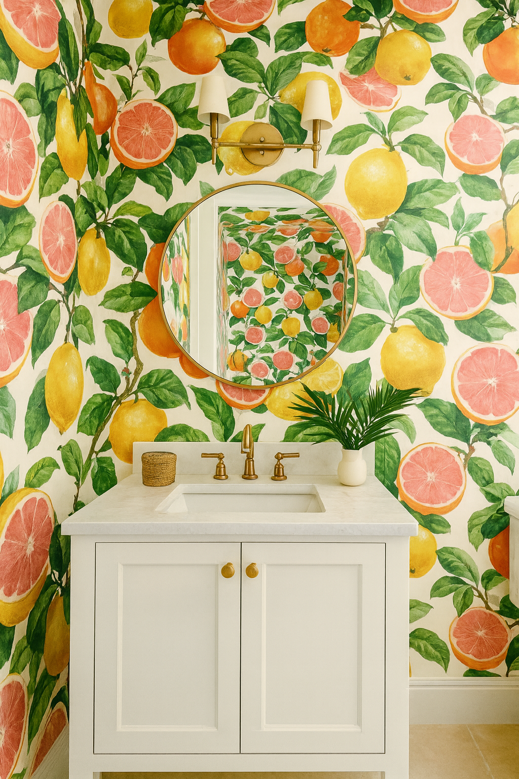 Bursting with zesty personality, Citrus Parade showcases oranges, grapefruits, and lemons—whole and sliced—on leafy branches against a crisp ivory backdrop. The saturated colors feel fresh off the tree, perfect for kitchens, dining nooks, or a juicy juice bar. It’s fruit-forward and fabulous.