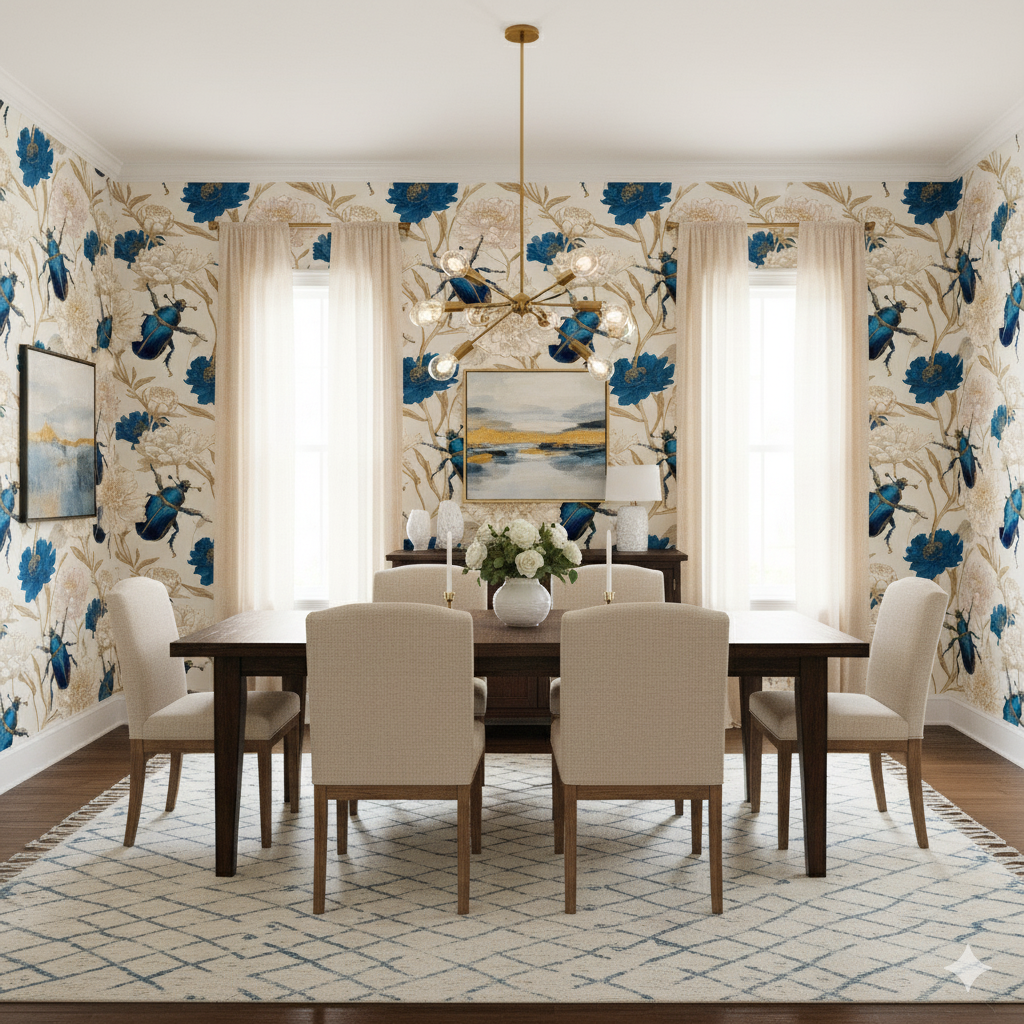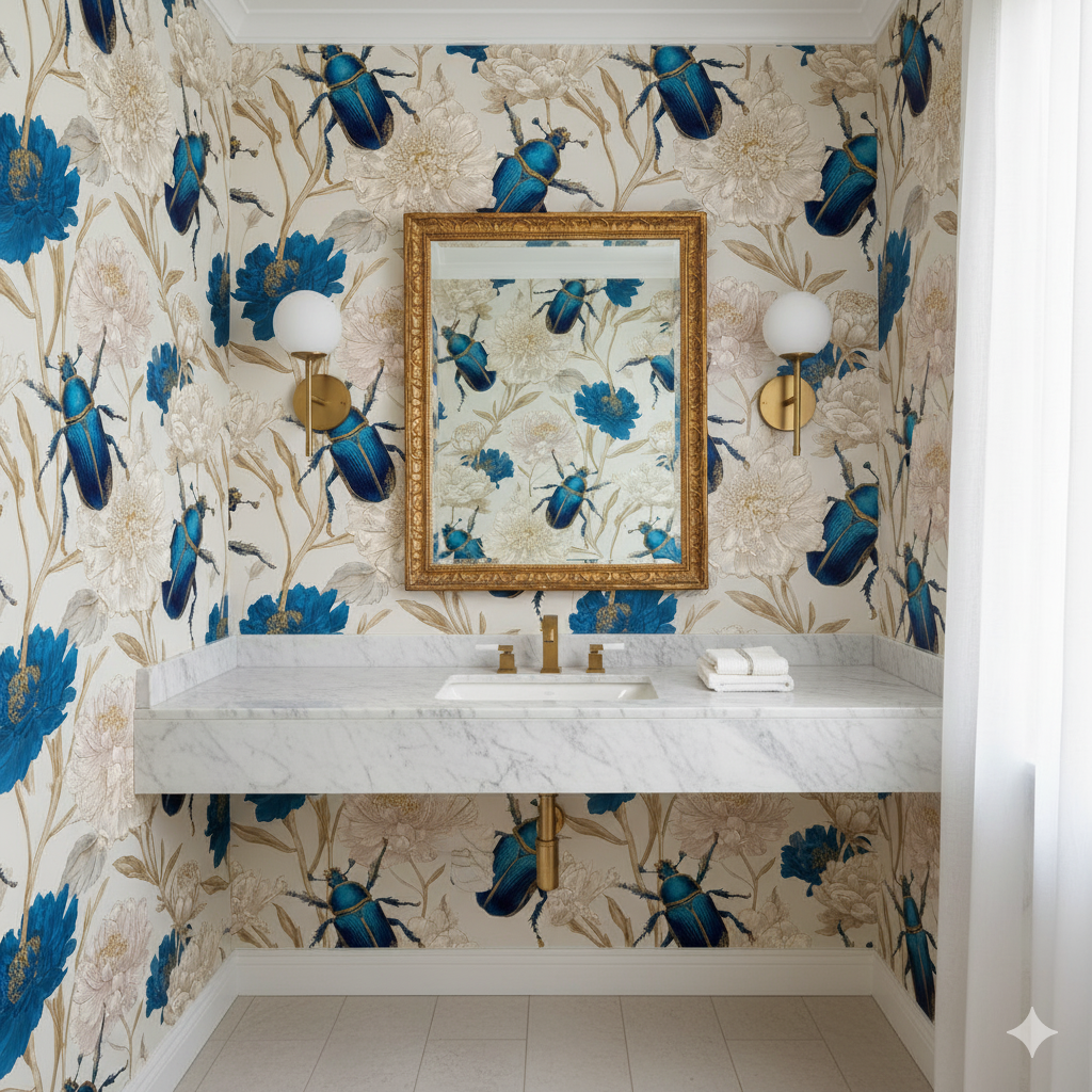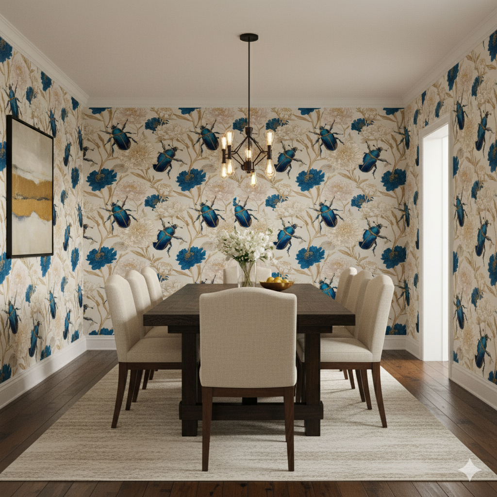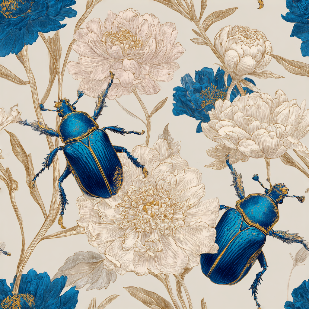Richly detailed scarabs in jewel-toned sapphire blue sit against oversized peonies painted in ivory, beige, and indigo, merging natural wonder with old-world curiosity. The metallic sheen of the beetles contrasts with the delicate botanical render, creating an almost cabinet-of-curiosities effect that feels refined, edgy, and slightly surreal. Cobalt Relic brings drama and storytelling to interiors, making it a striking choice for powder rooms, libraries, or cocktail bars where conversation is part of the design. This wallpaper bridges Victorian eccentricity with modern luxury, perfect for collectors, adventurers, or anyone who delights in rarefied detail.